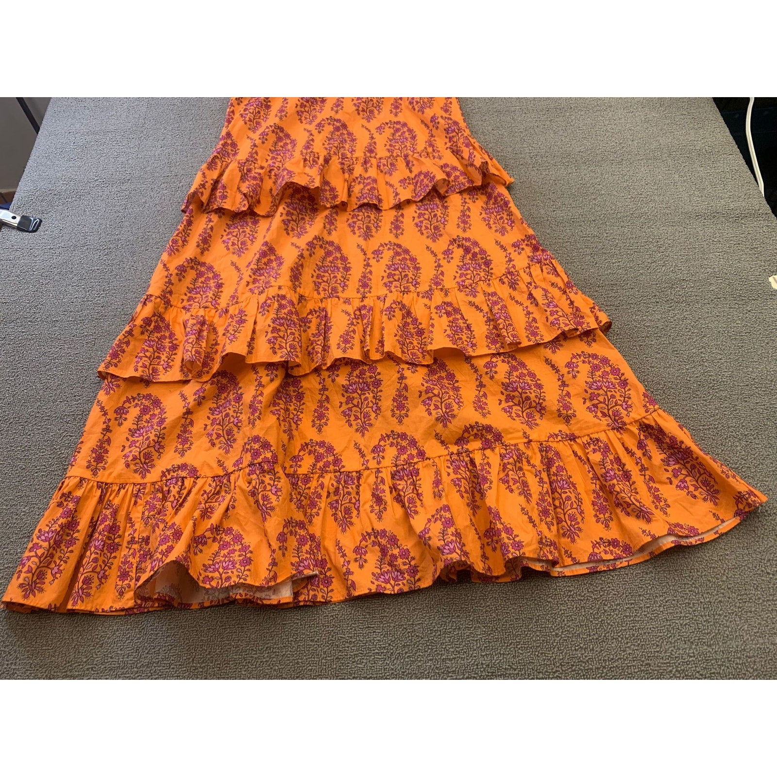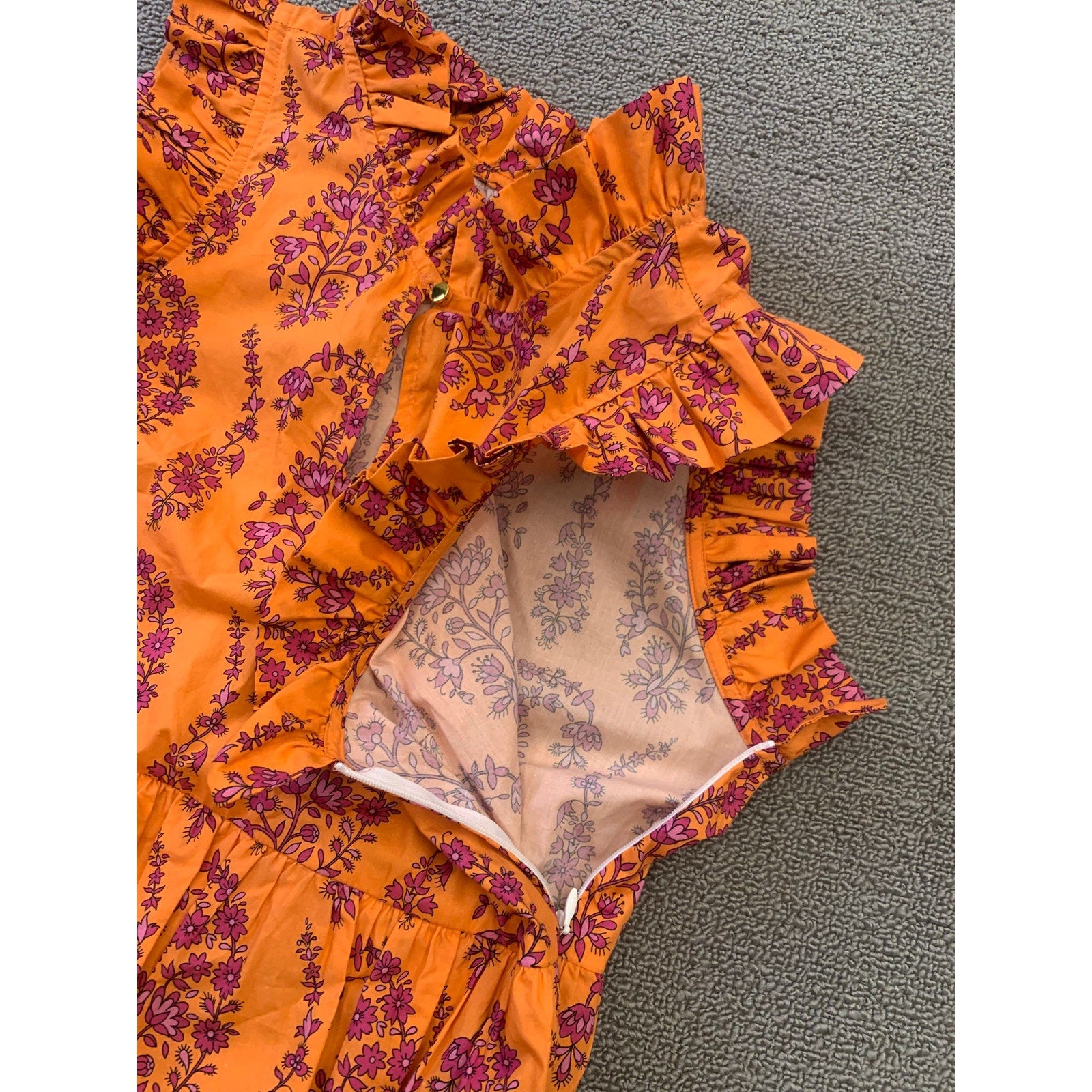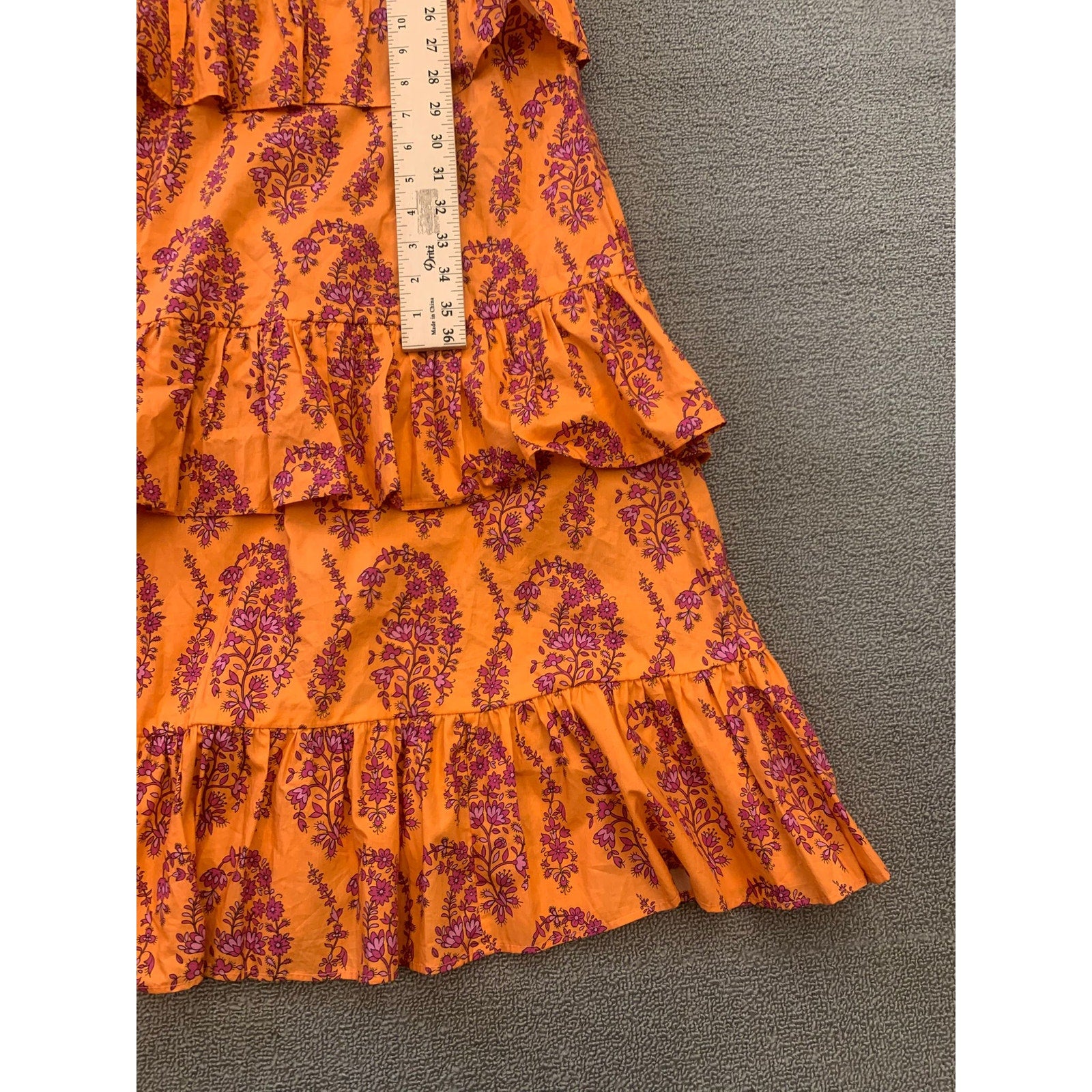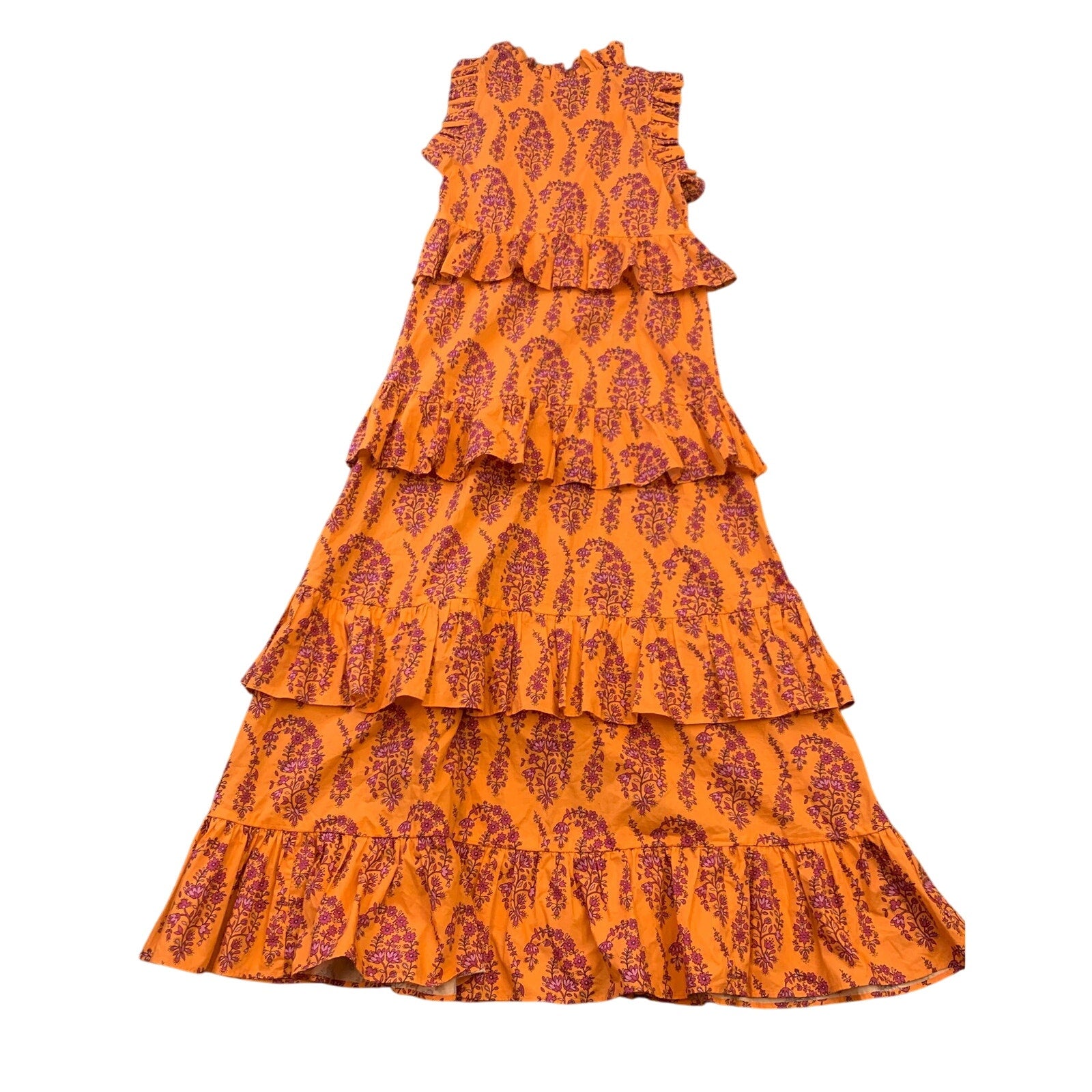 A vibrant tiered maxi dress by M.D.S. Stripes featuring rich orange fabric adorned with magenta floral motifs in a block-print style. It has a high neckline, flutter ruffle trim at the shoulders and across each tier, creating playful texture and abundant movement—perfect for sun-drenched summer days or bohemian-inspired events.