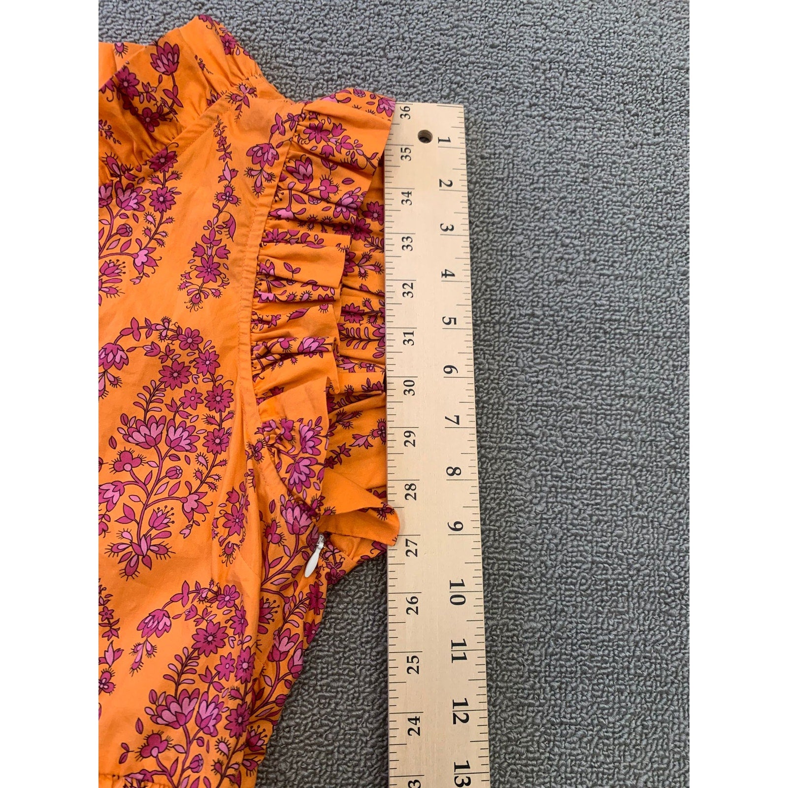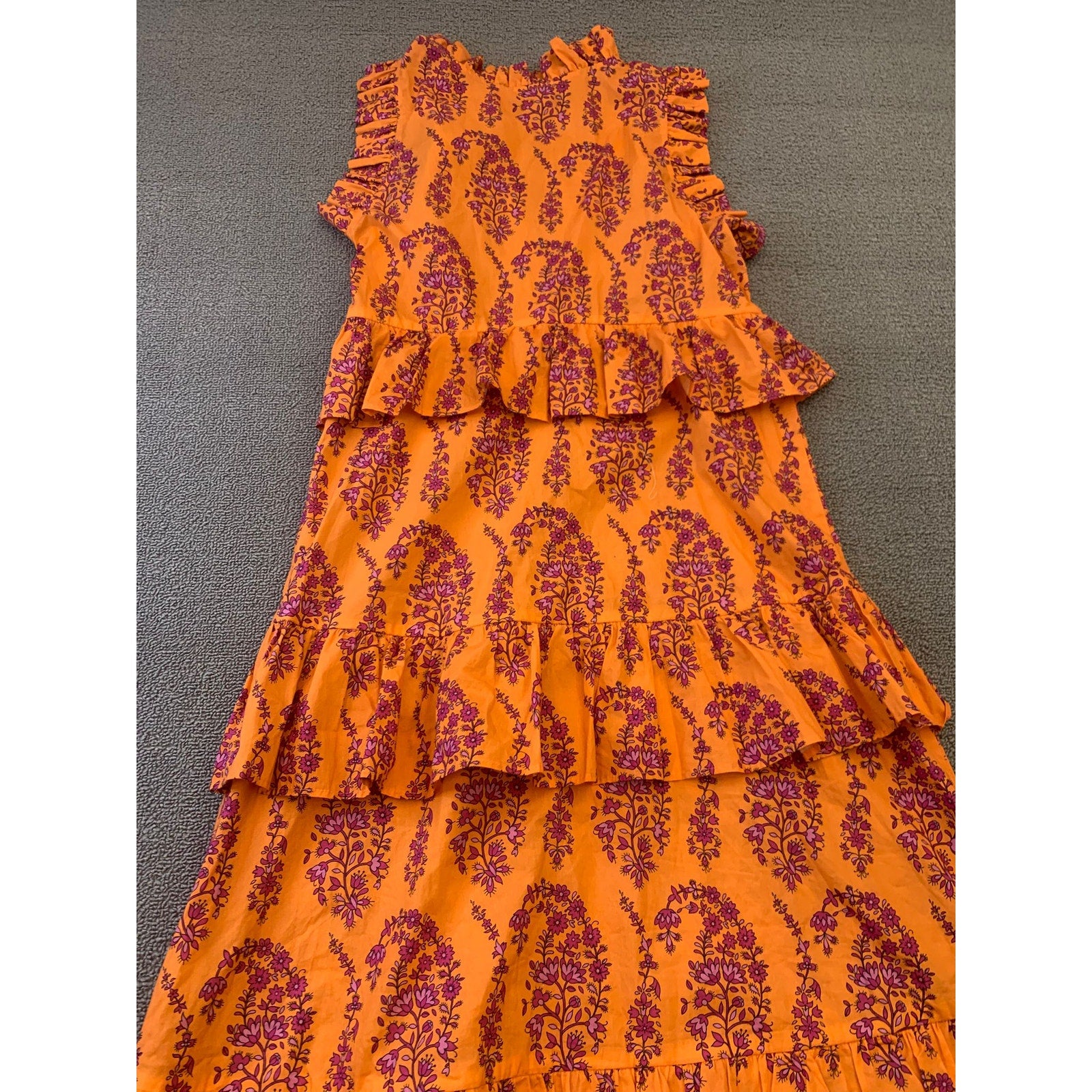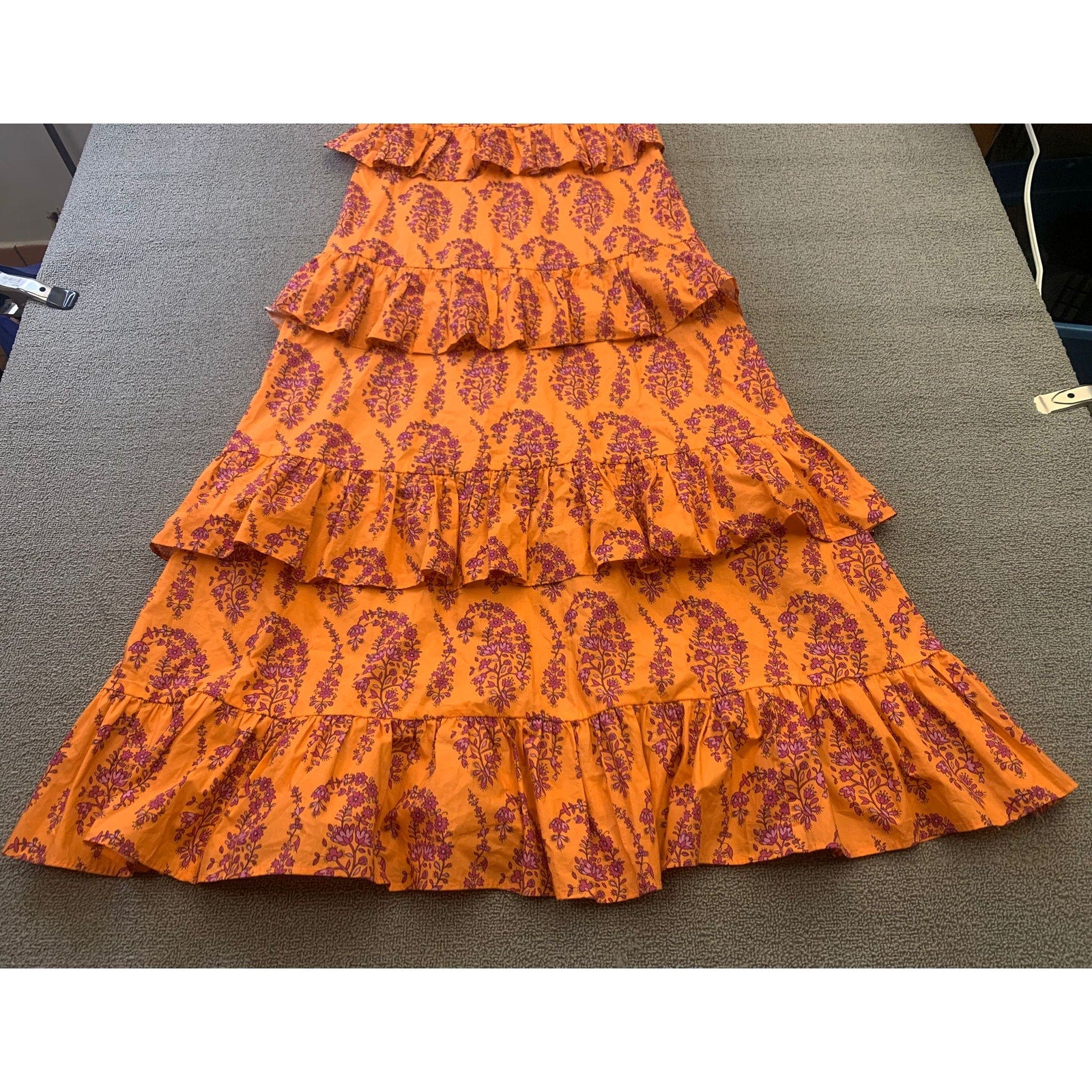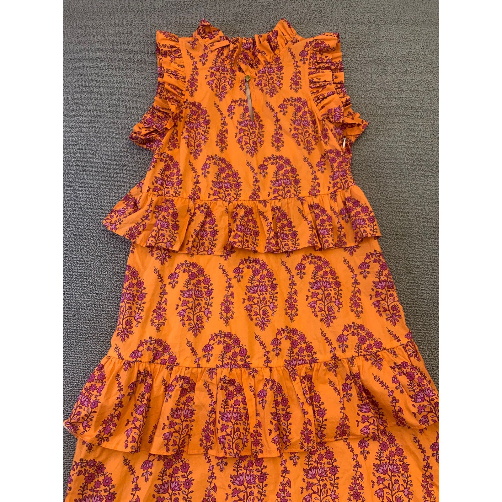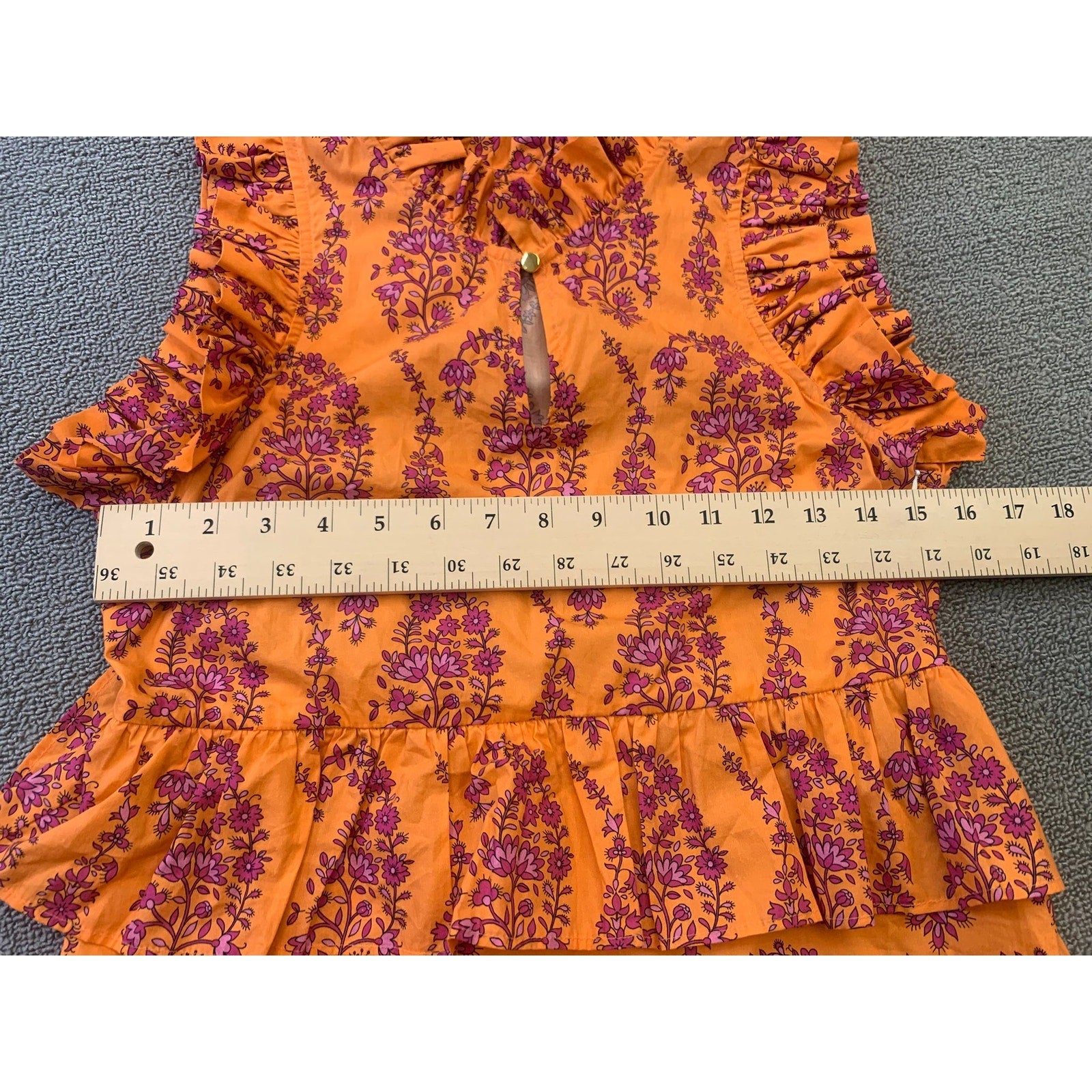 A vibrant tiered maxi dress by M.D.S. Stripes featuring rich orange fabric adorned with magenta floral motifs in a block-print style. It has a high neckline, flutter ruffle trim at the shoulders and across each tier, creating playful texture and abundant movement—perfect for sun-drenched summer days or bohemian-inspired events.