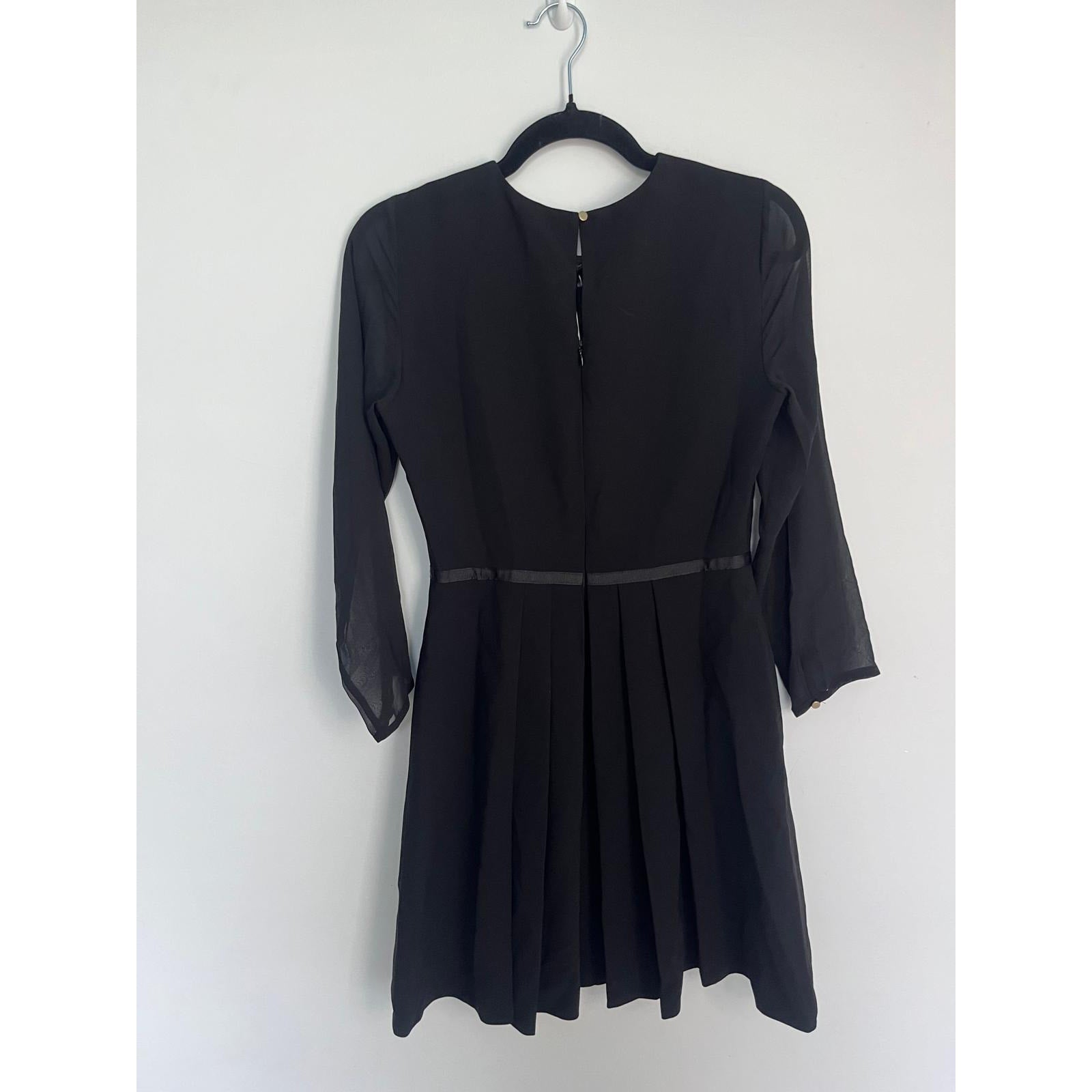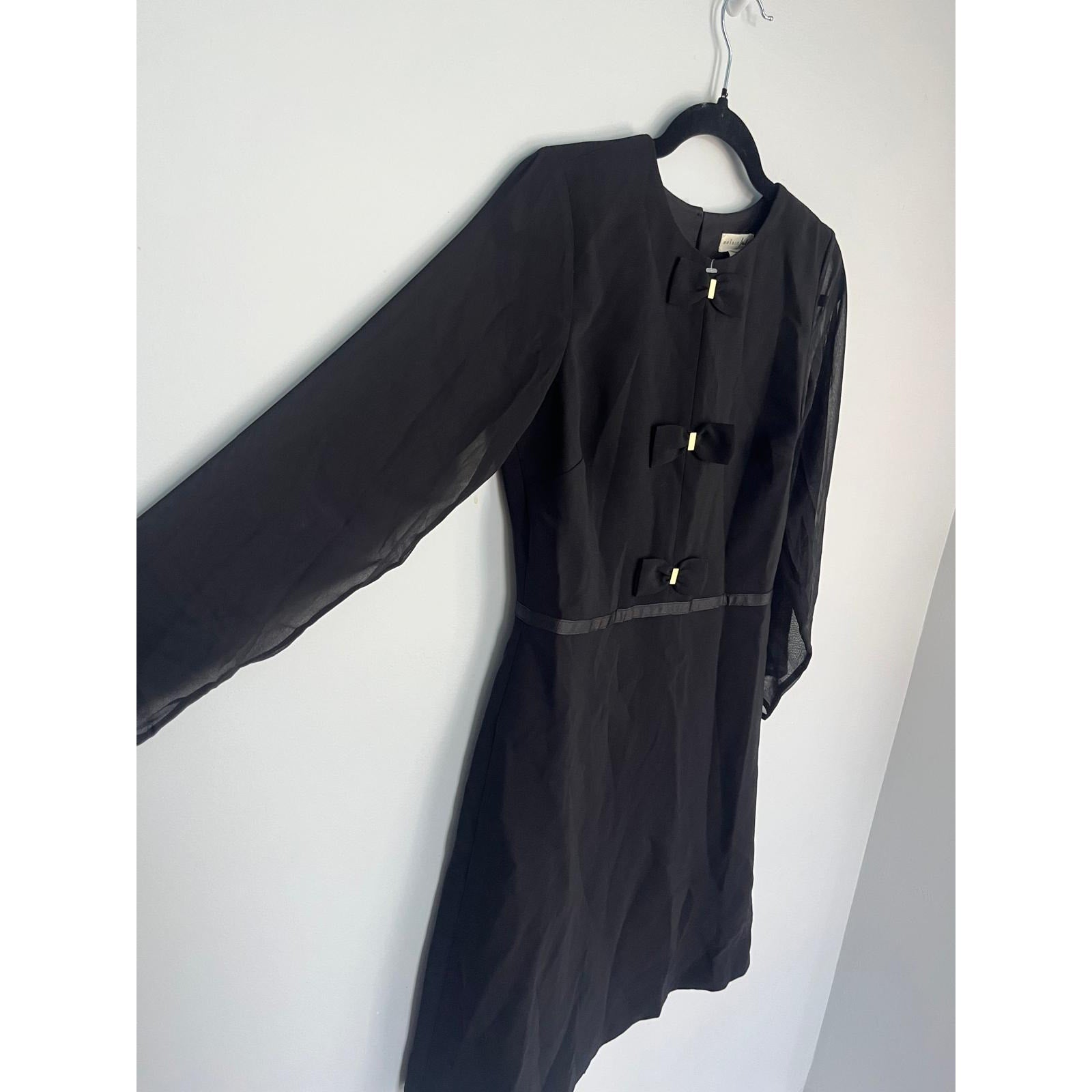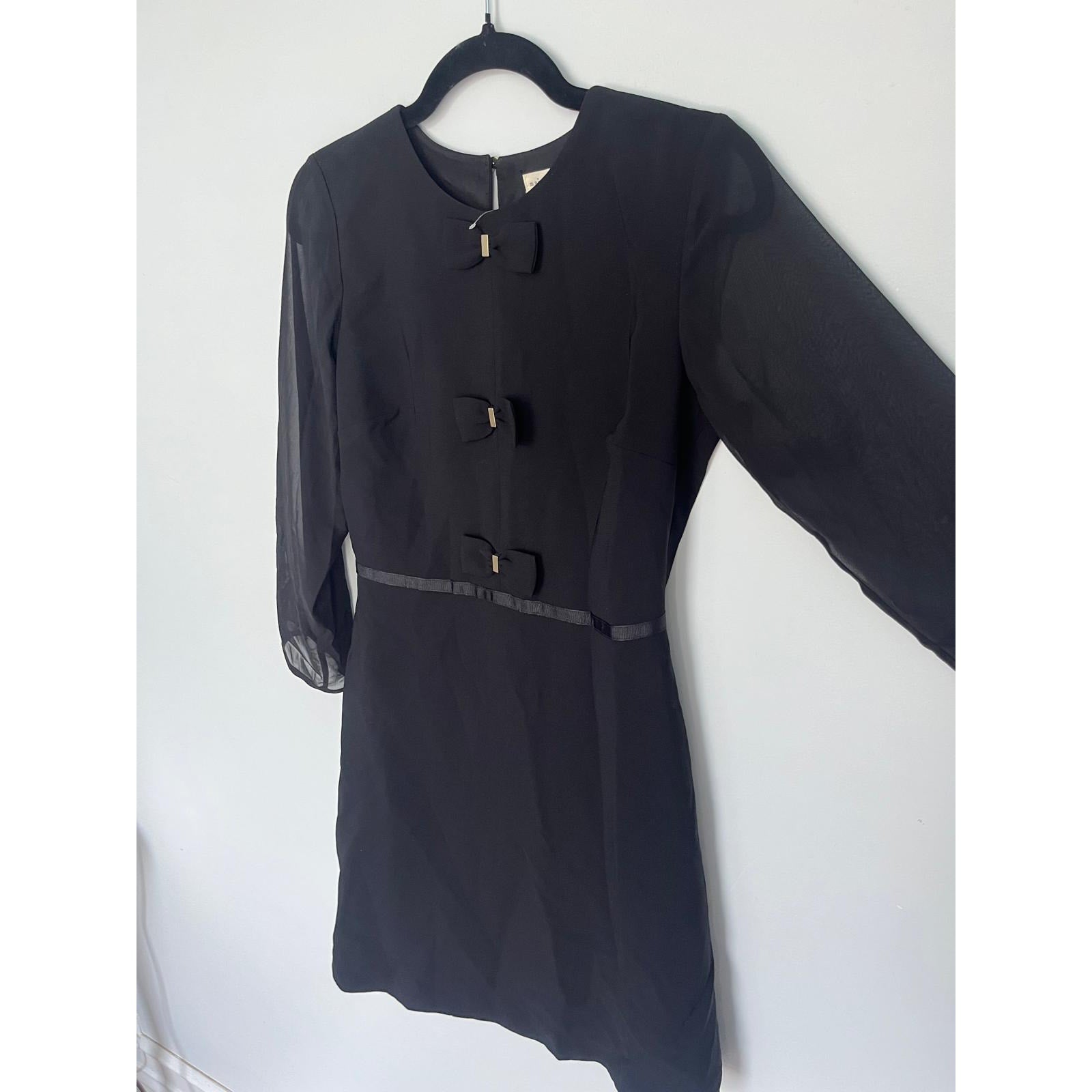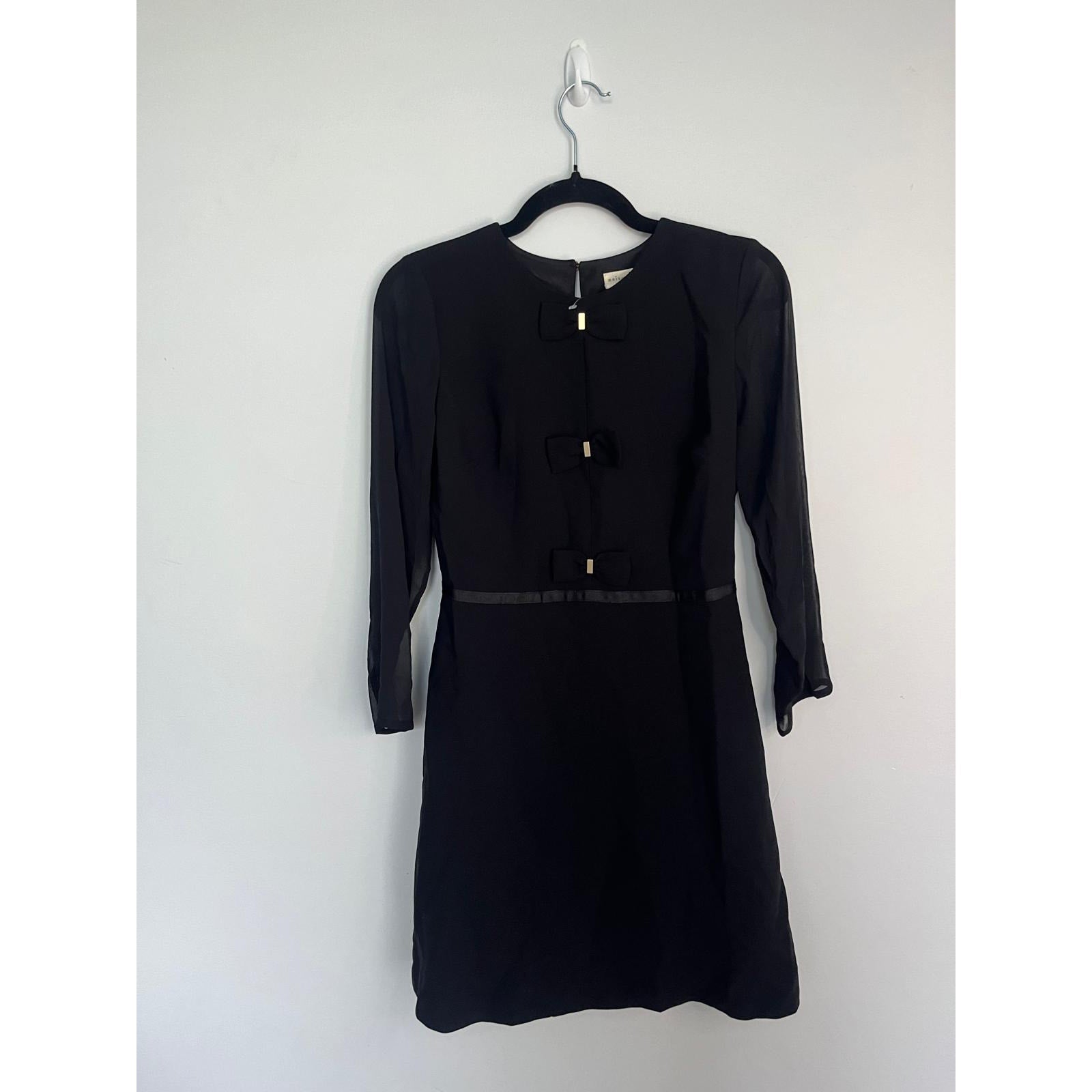 Chic black mini dress with a tailored silhouette and three bow accents down the front, perfect for cocktail parties or evening events. Features a concealed back zipper and sheer 3/4 sleeves for a touch of elegance.