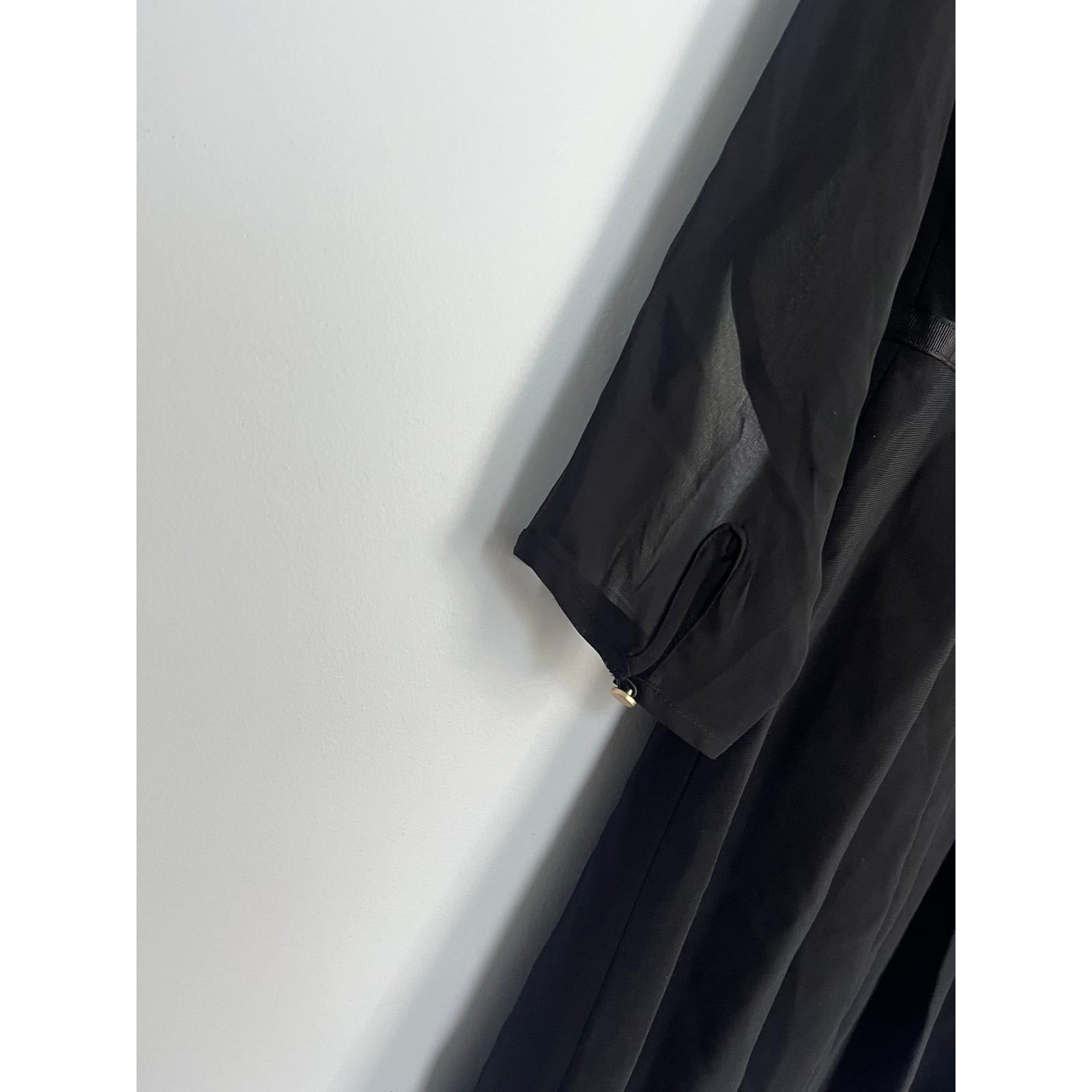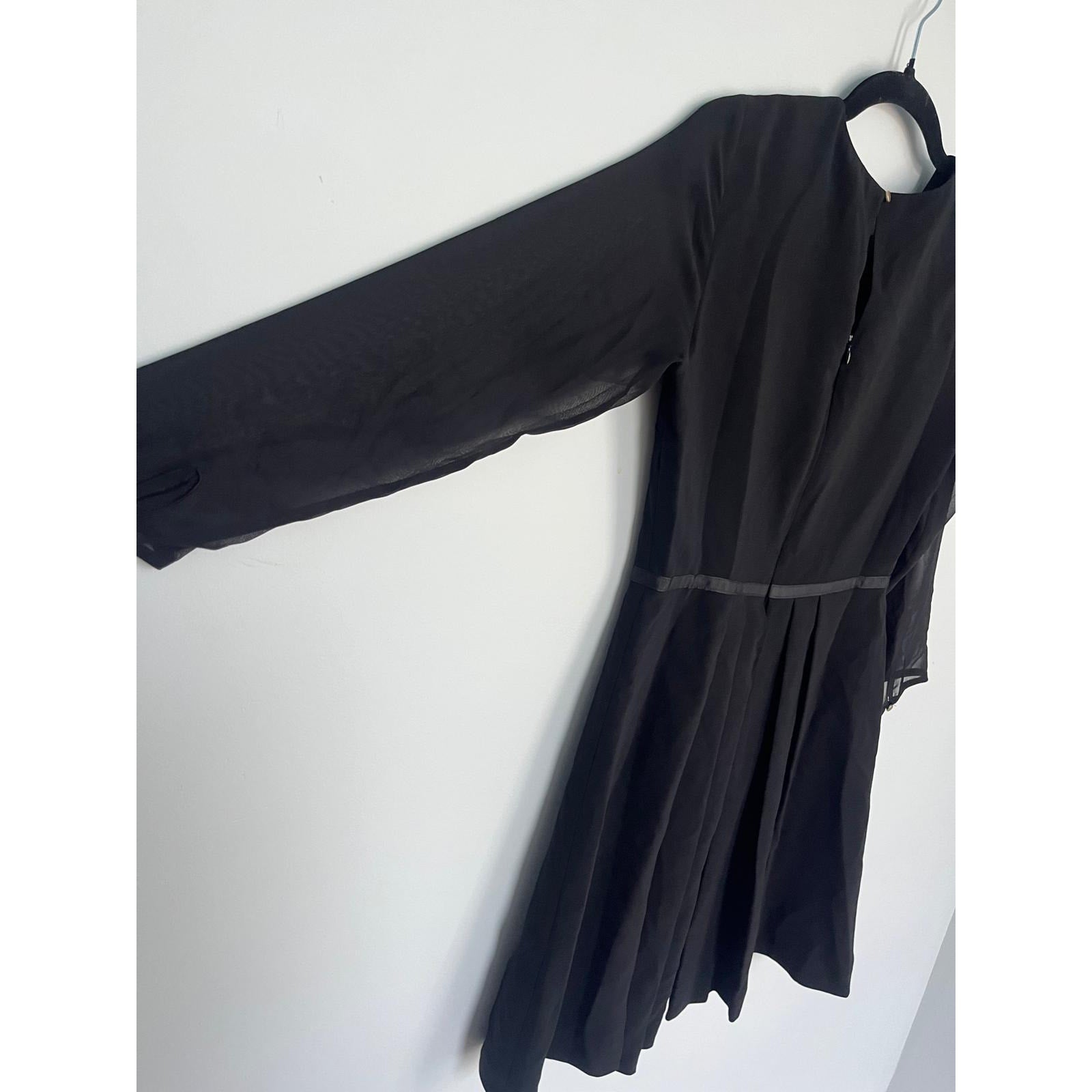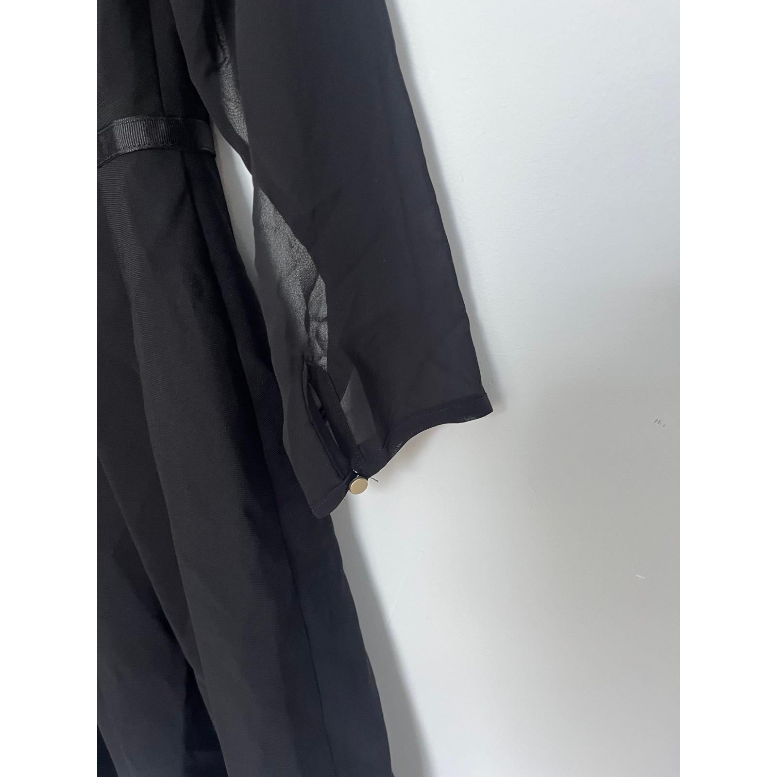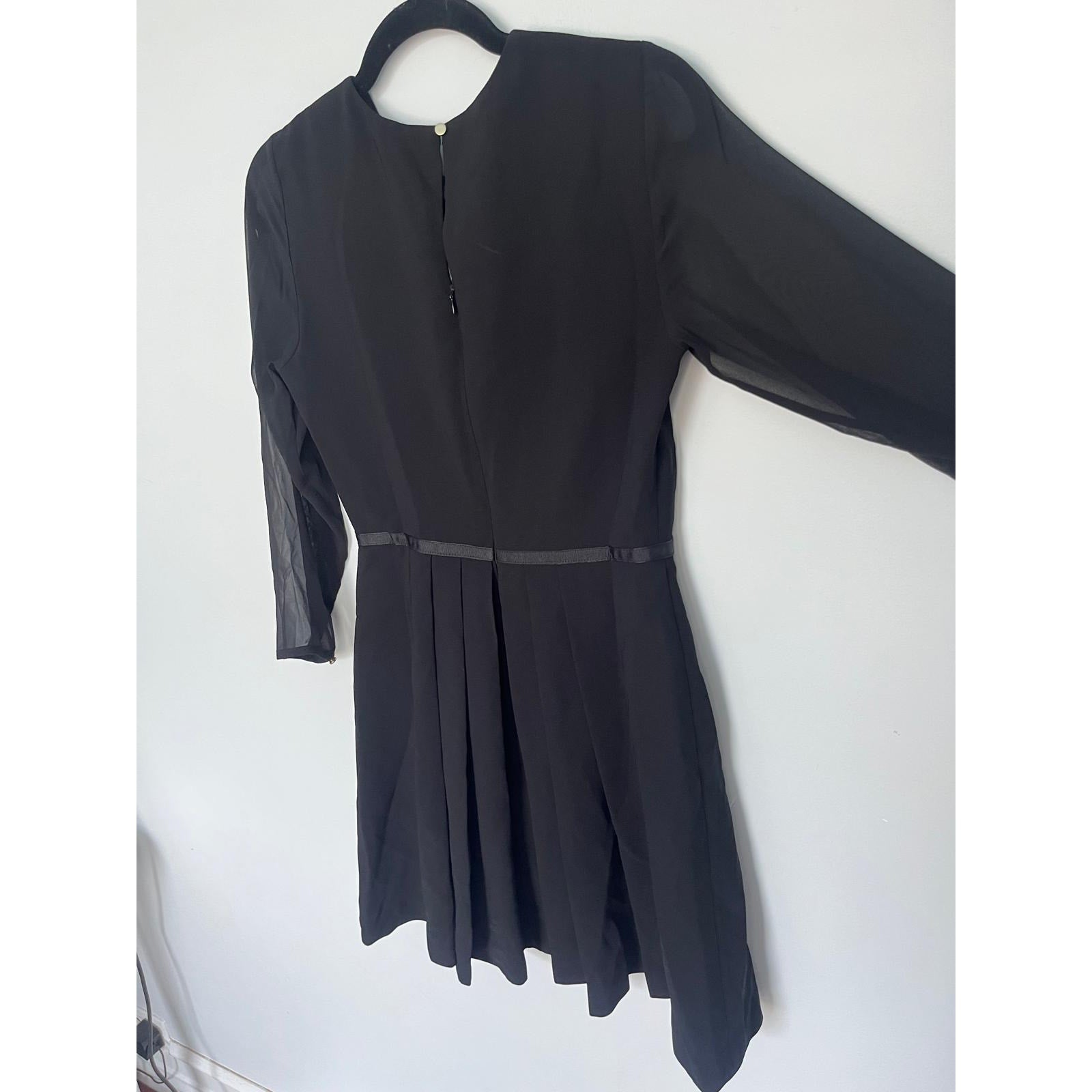 Chic black mini dress with a tailored silhouette and three bow accents down the front, perfect for cocktail parties or evening events. Features a concealed back zipper and sheer 3/4 sleeves for a touch of elegance.