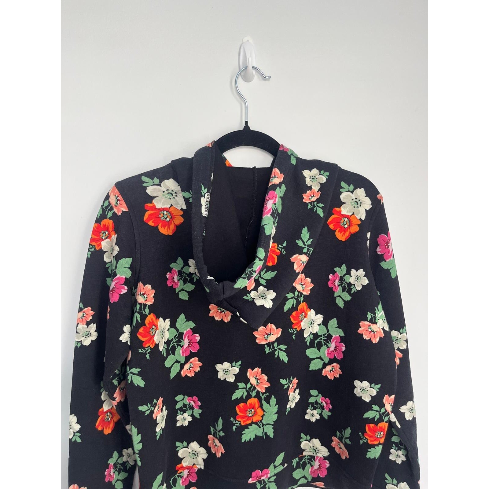 Soft and cozy black floral print hoodie with a drawstring hood and pullover design. Features bold pink, orange, and green flowers with a classic fit.