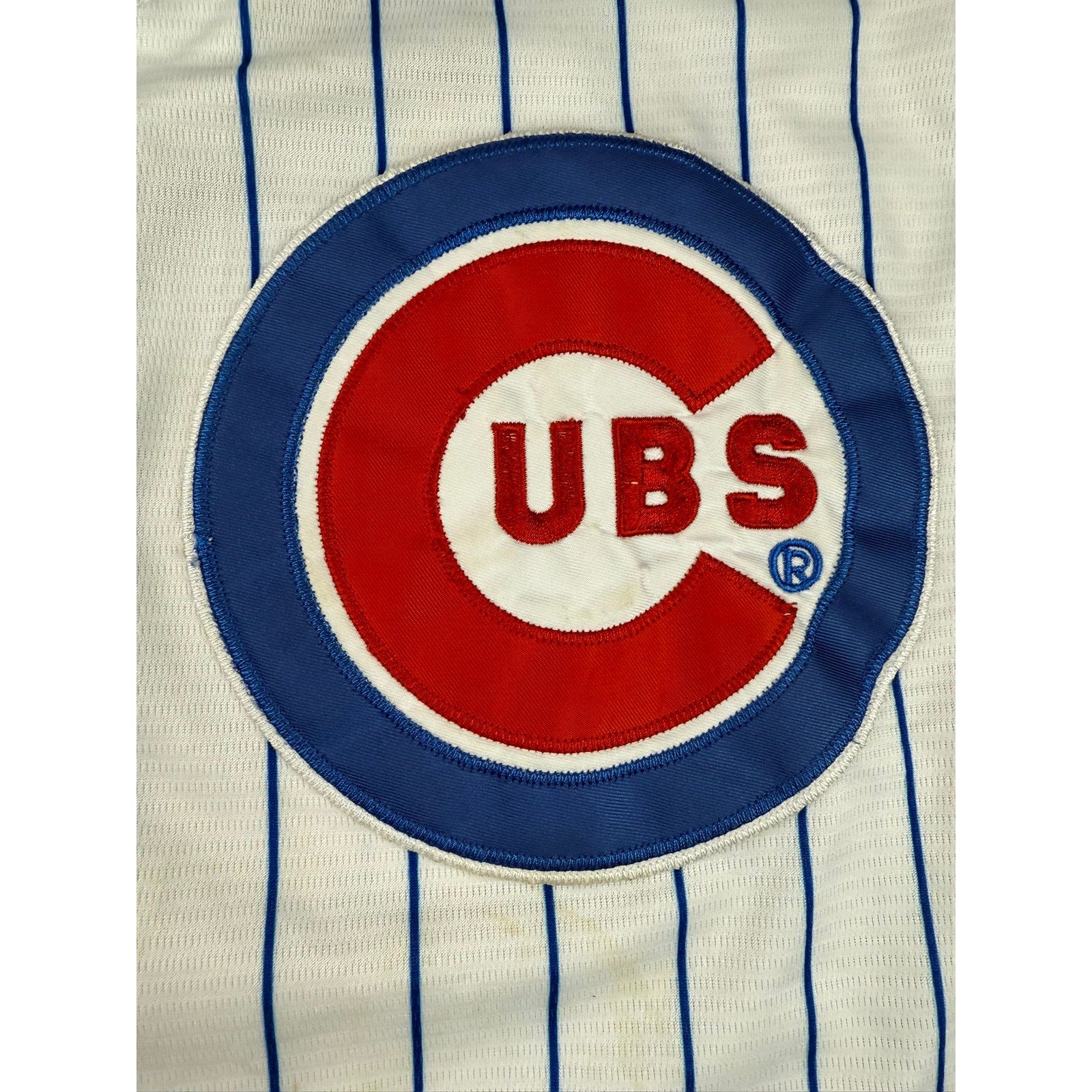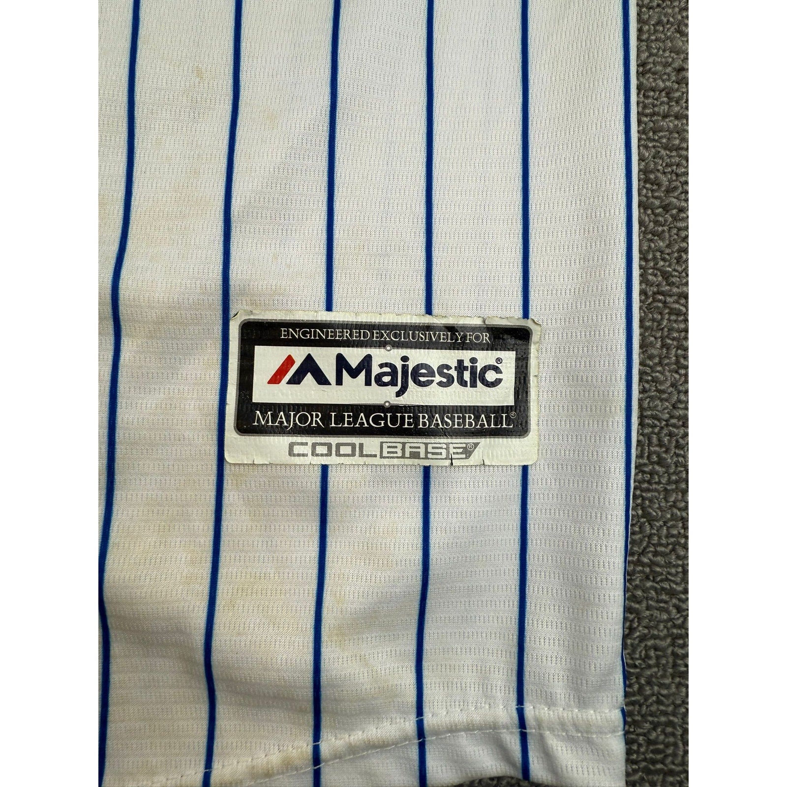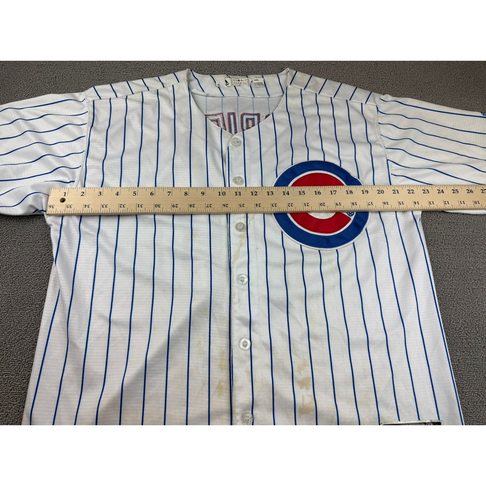 Authentic Chicago Cubs pinstripe jersey by Majestic. Features include button-up front, classic Cubs patch on chest, MLB “Genuine Merchandise” tag inside collar, and Cooperstown-style pinstripe design.