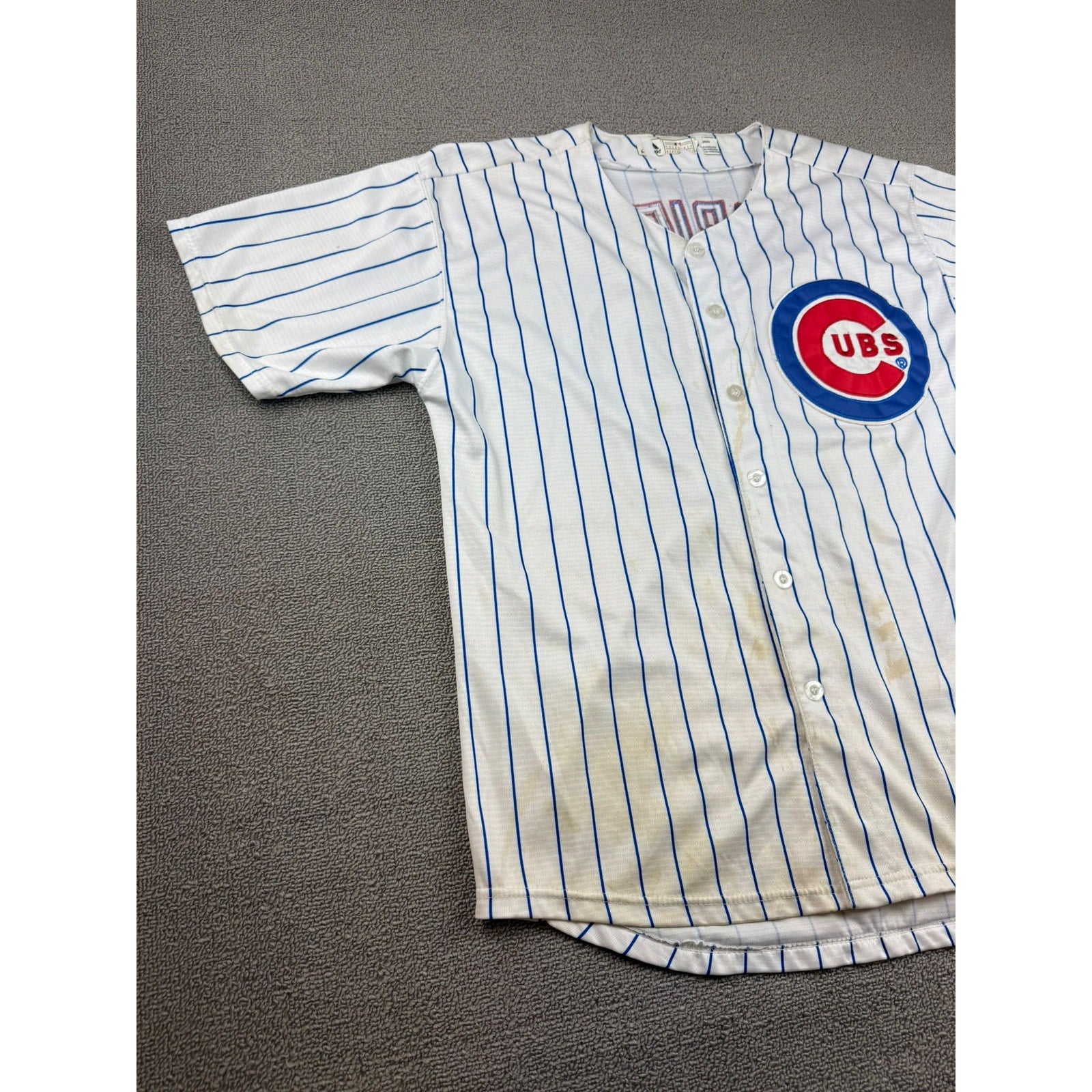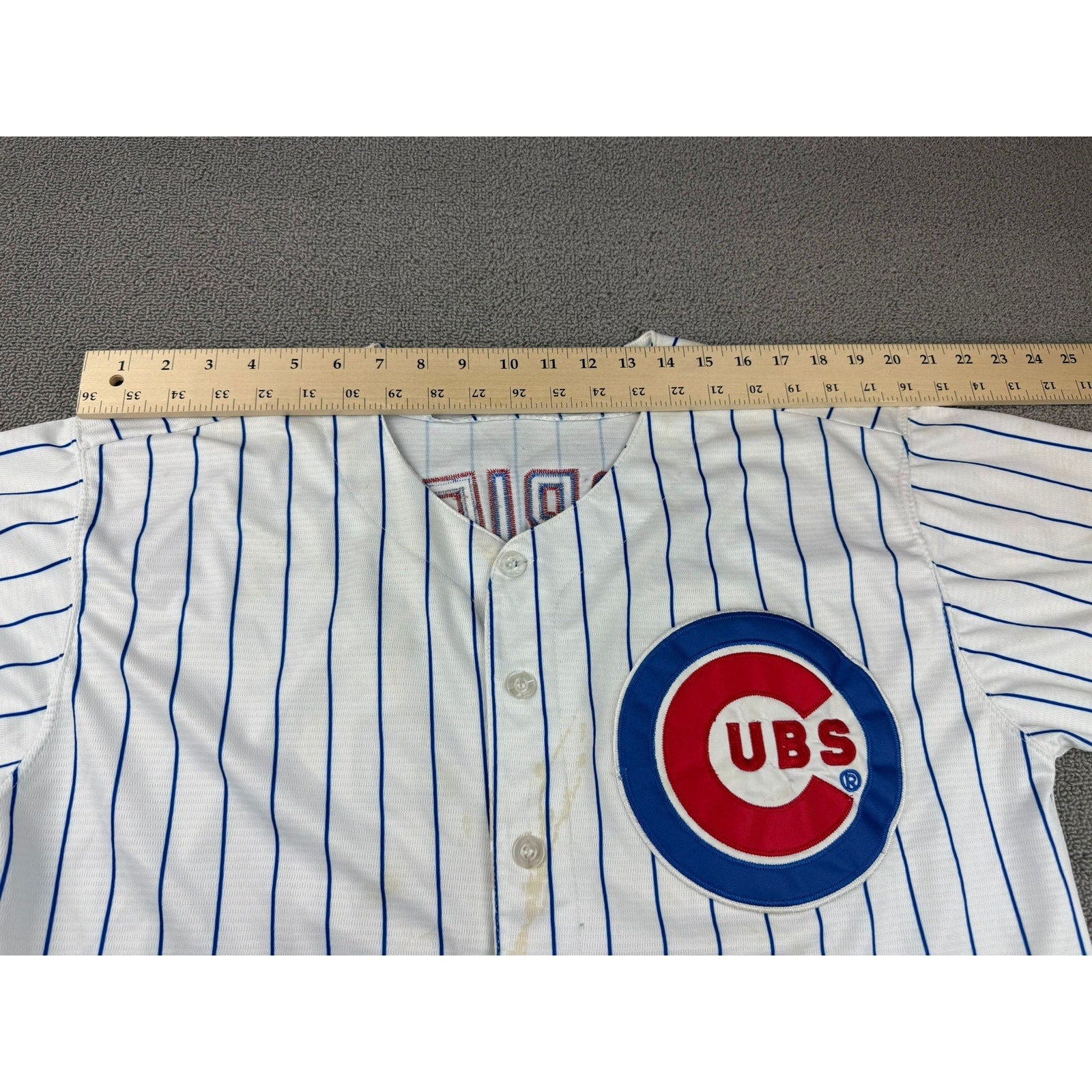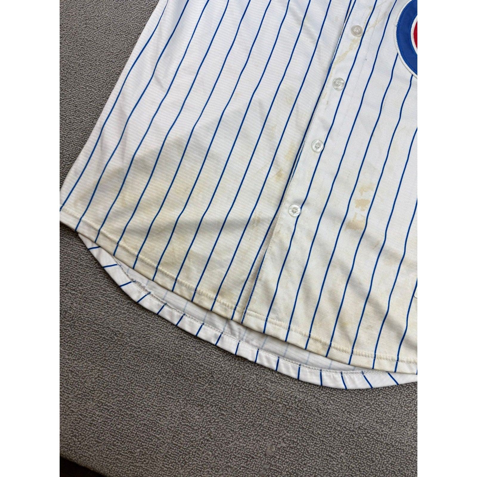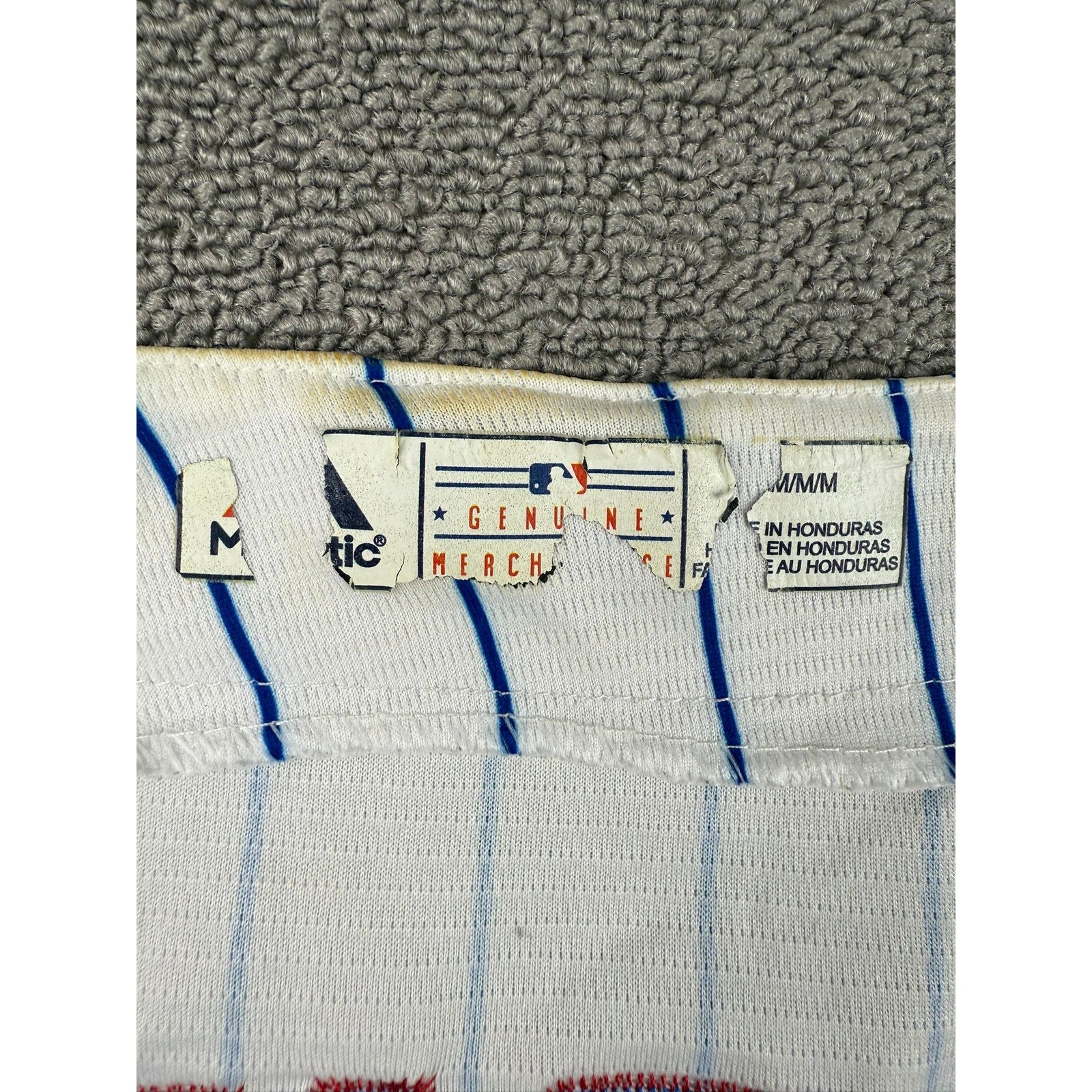 Authentic Chicago Cubs pinstripe jersey by Majestic. Features include button-up front, classic Cubs patch on chest, MLB “Genuine Merchandise” tag inside collar, and Cooperstown-style pinstripe design.