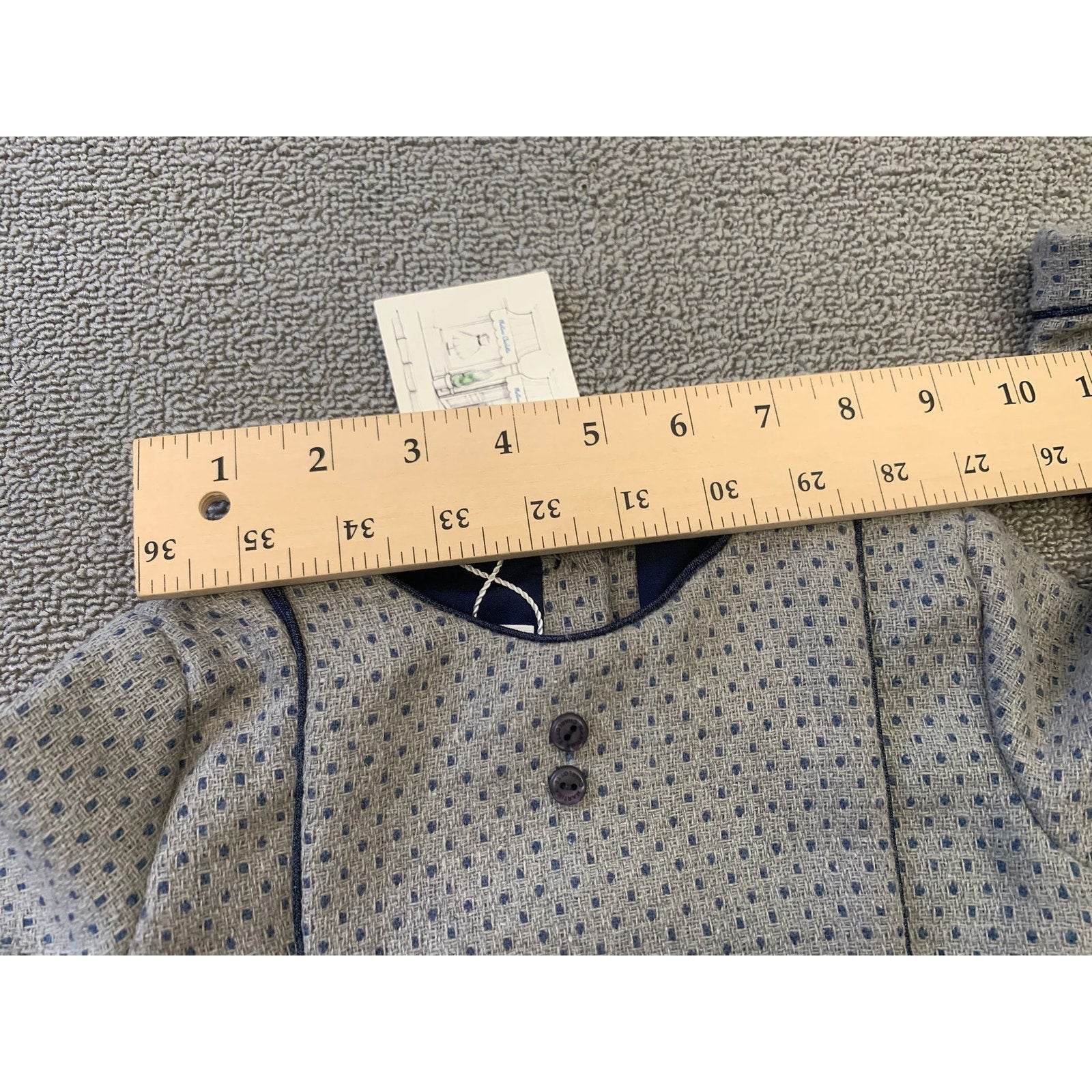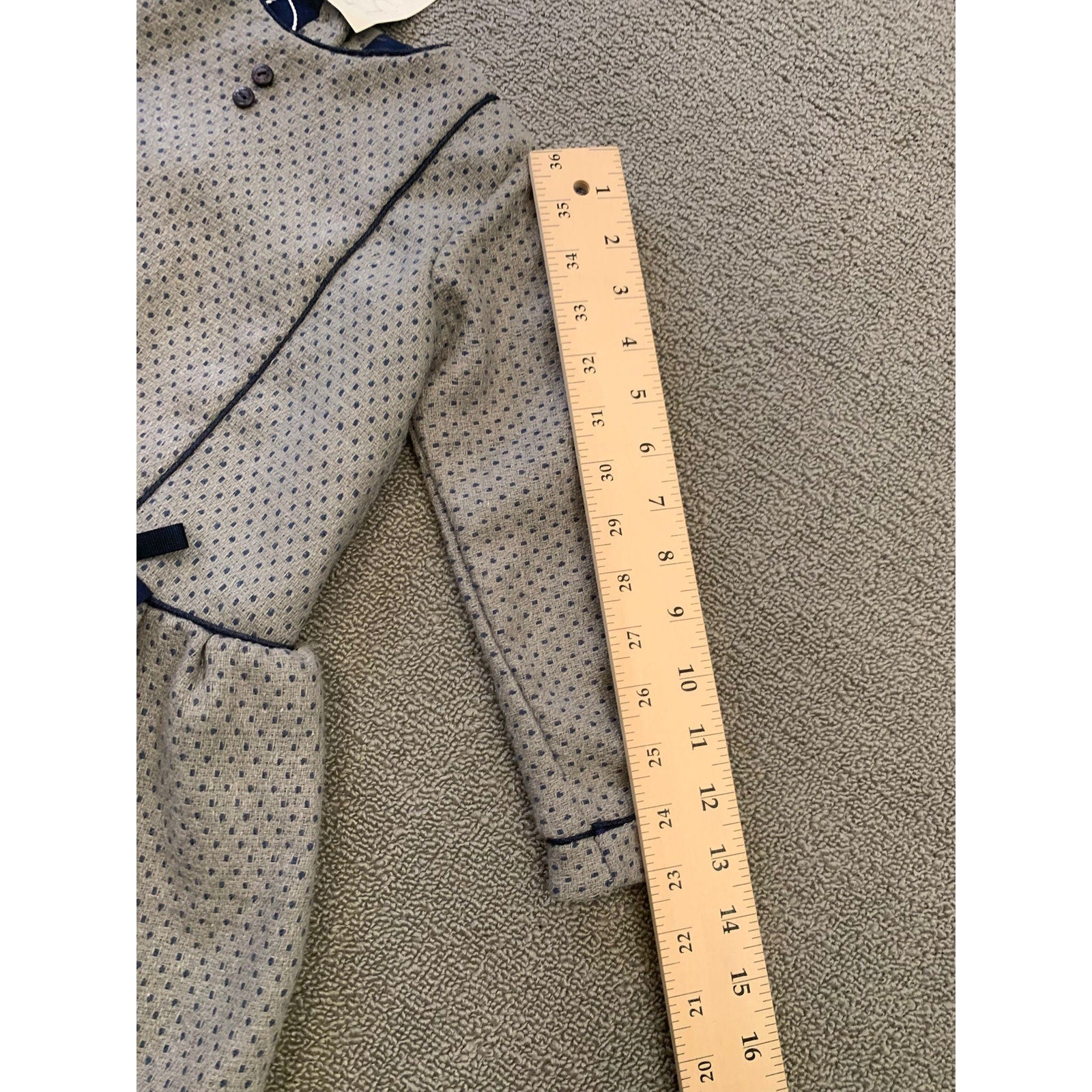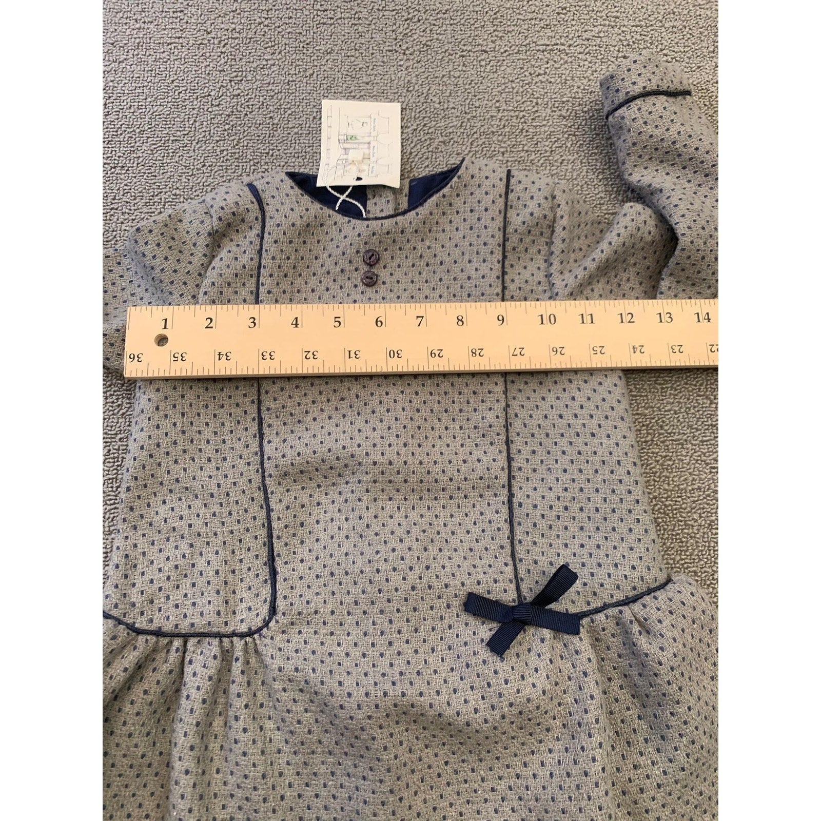 Martine Charlotte girls’ long sleeve dress in gray with subtle blue dotted pattern. Features navy trim, button front detail, small bow accent at waist, and gathered skirt. Fully lined for comfort. A chic boutique-style dress perfect for parties, holidays, or special occasions. The tag is broken.