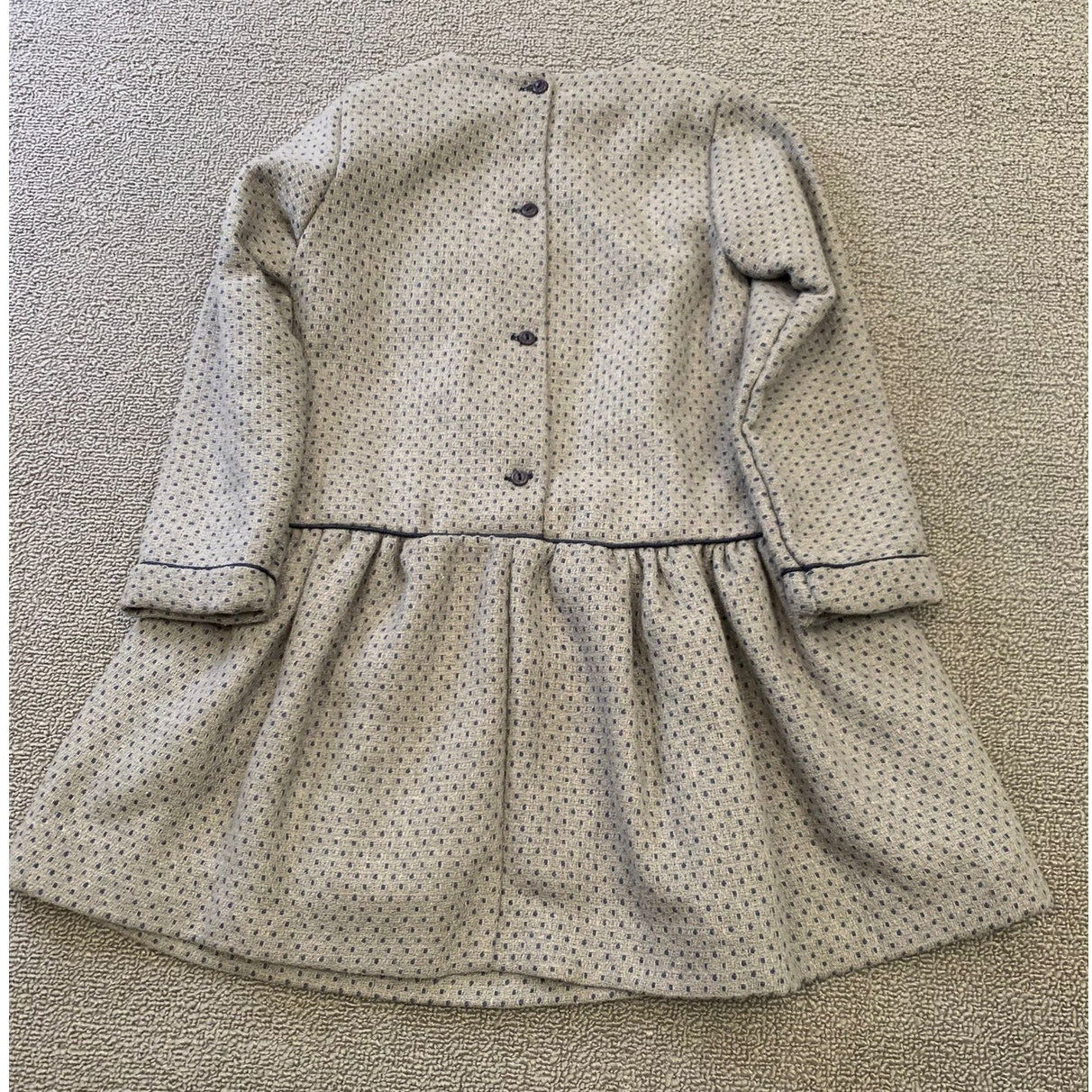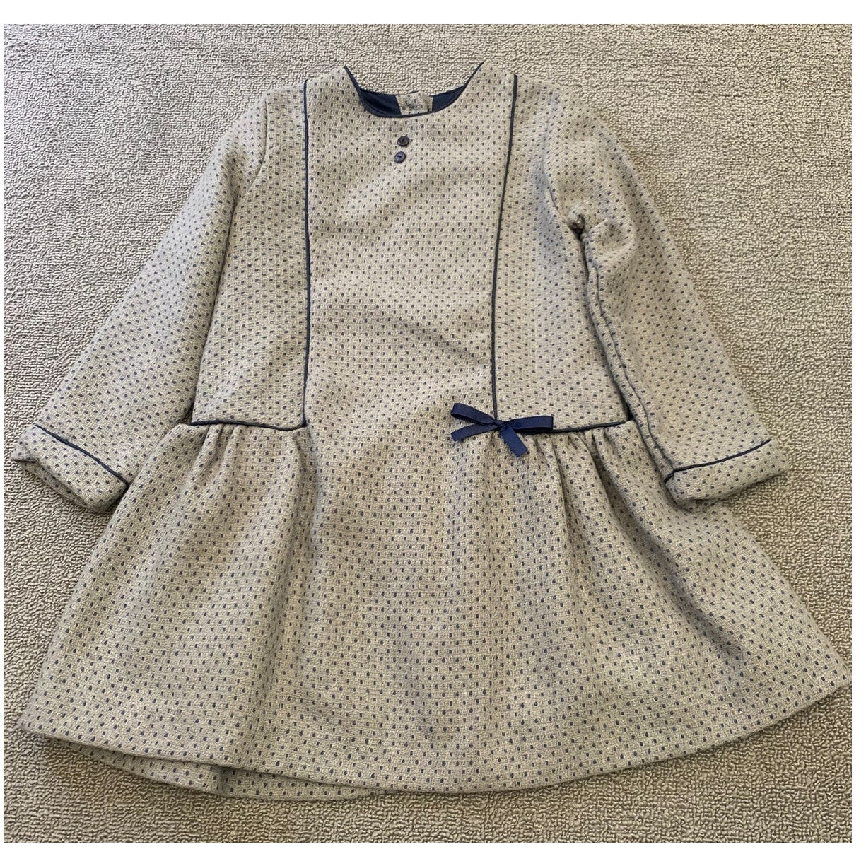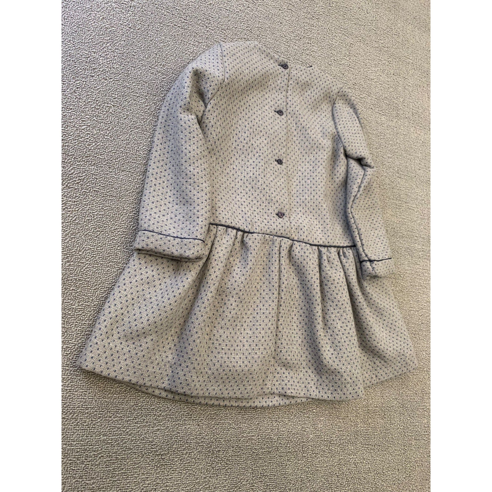 Martine Charlotte girls’ long sleeve dress in gray with subtle blue dotted pattern. Features navy trim, button front detail, small bow accent at waist, and gathered skirt. Fully lined for comfort. A chic boutique-style dress perfect for parties, holidays, or special occasions. The tag is broken.