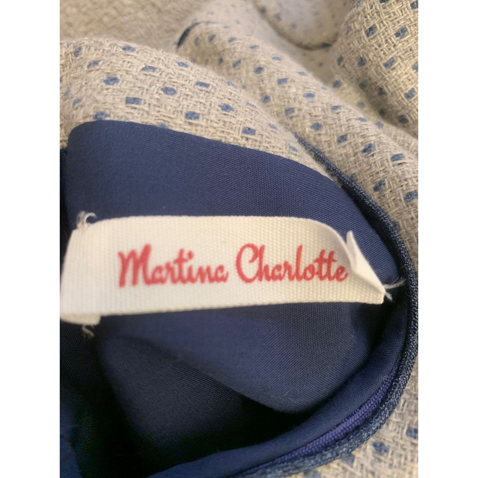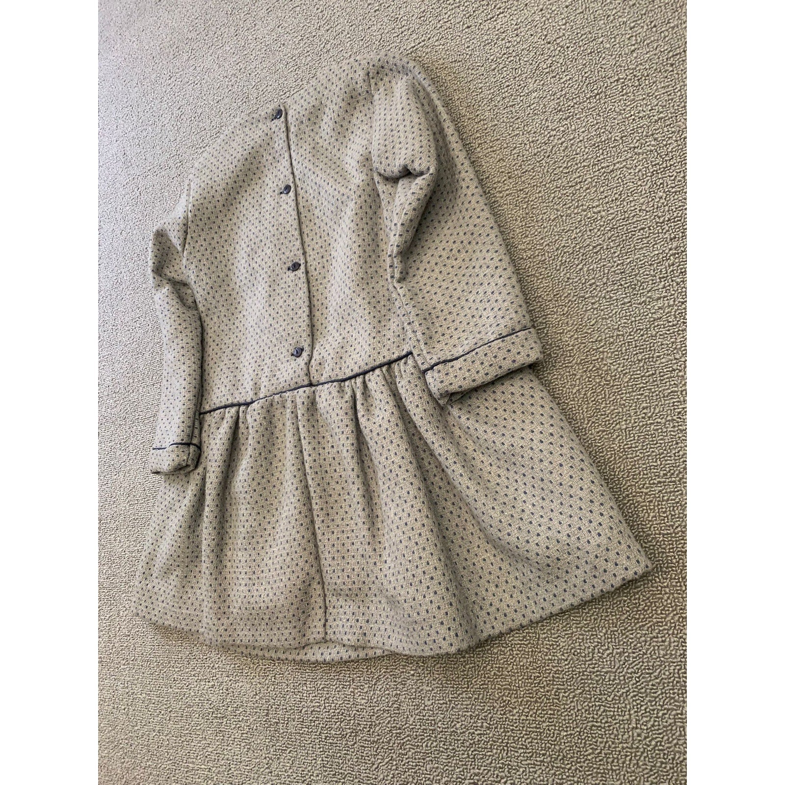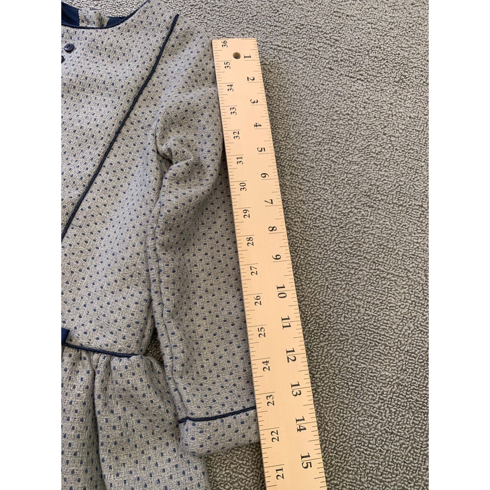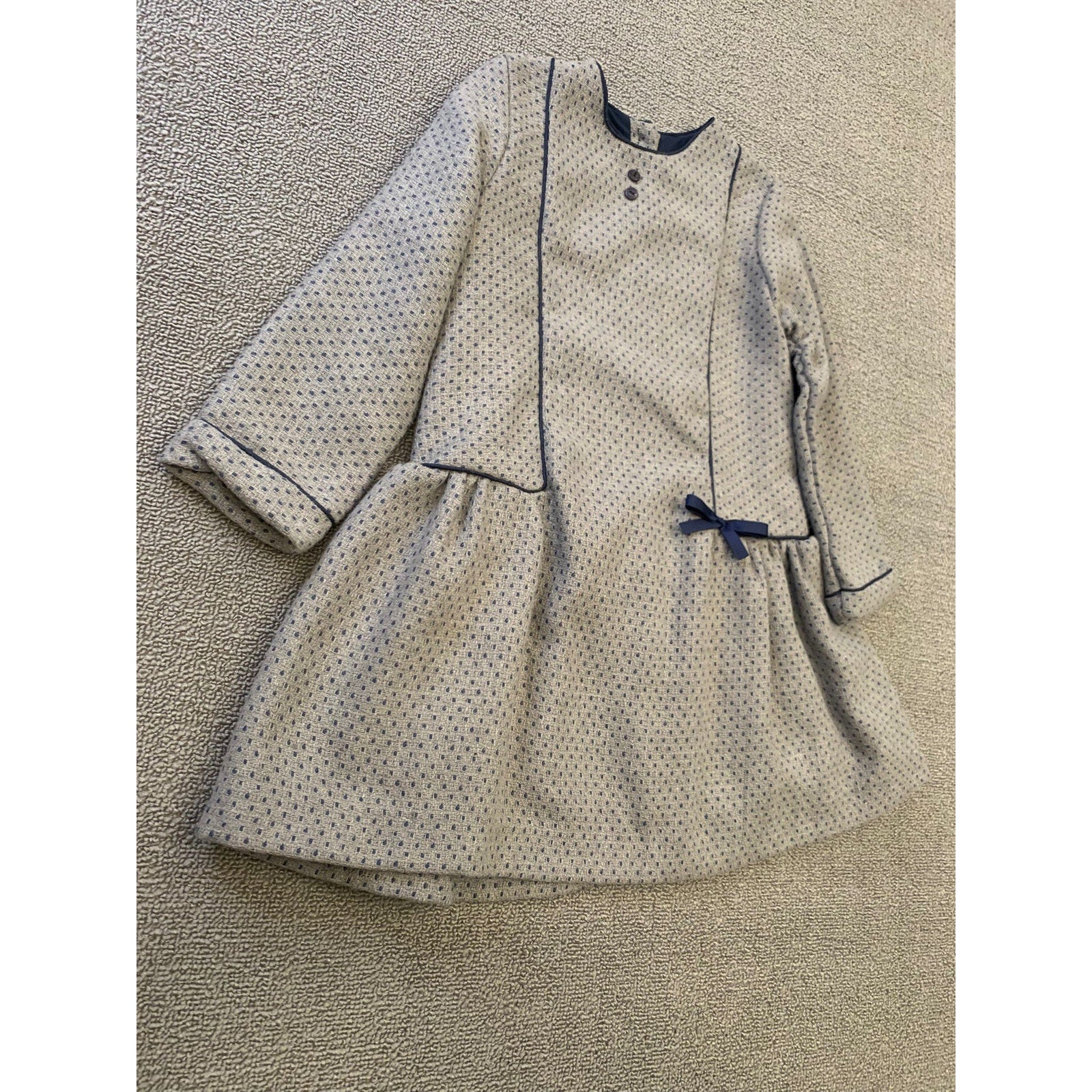 Martine Charlotte girls’ long sleeve dress in gray with subtle blue dotted pattern. Features navy trim, button front detail, small bow accent at waist, and gathered skirt. Fully lined for comfort. A chic boutique-style dress perfect for parties, holidays, or special occasions. The tag is broken.