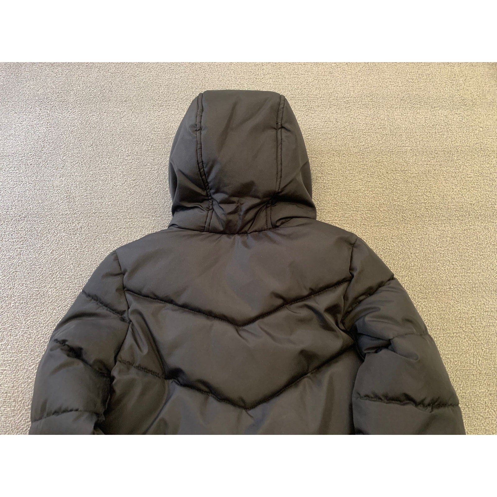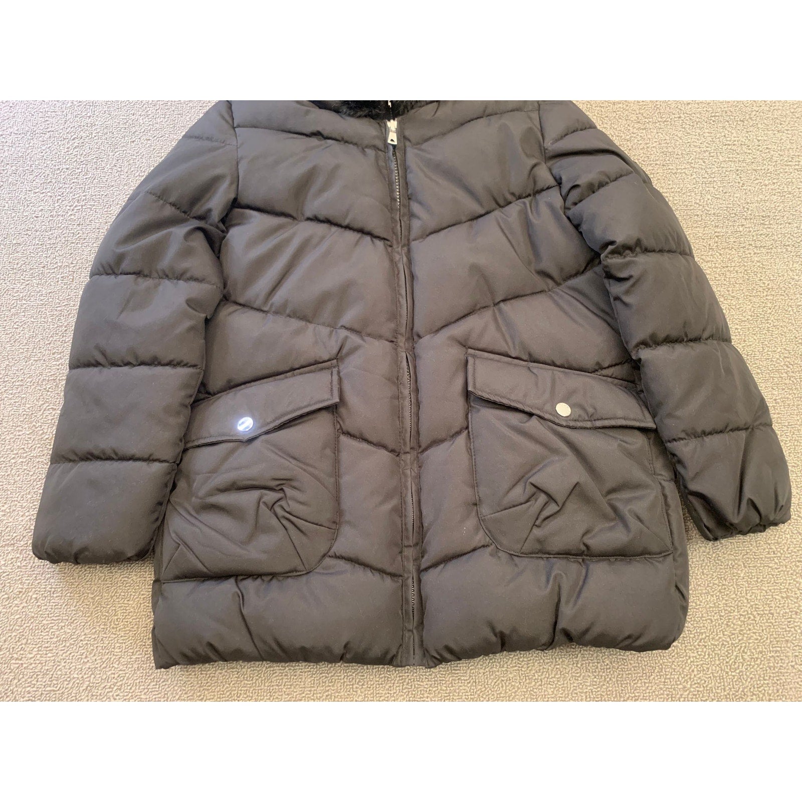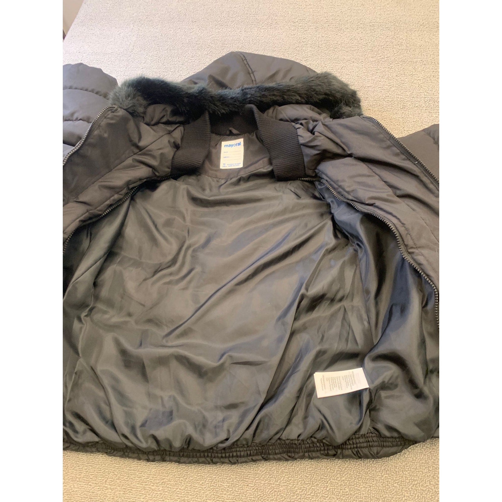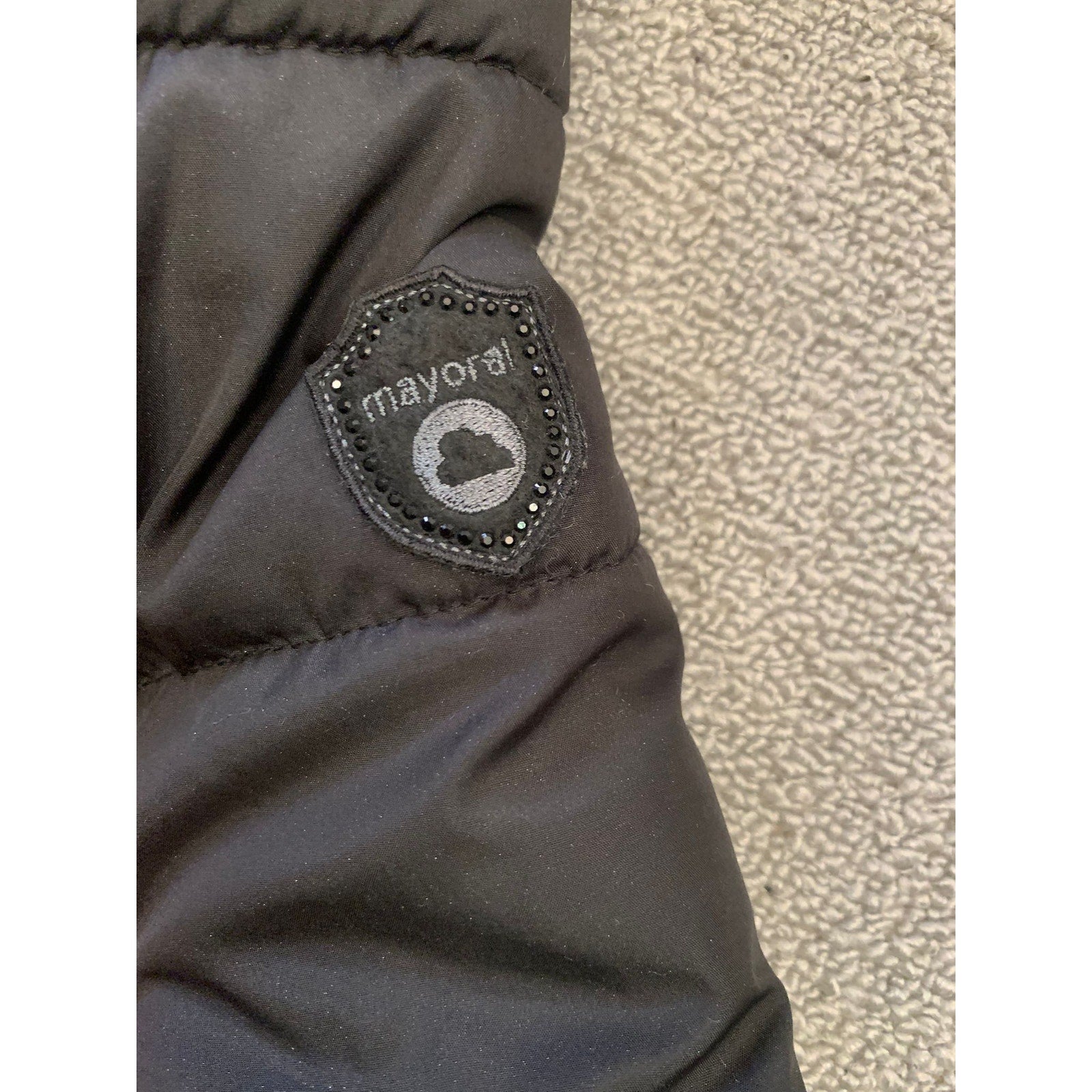 Mayoral Girl black puffer winter coat with faux fur trimmed hood. Features zip front closure, two large flap pockets with snap buttons, and quilted padded design for warmth.
