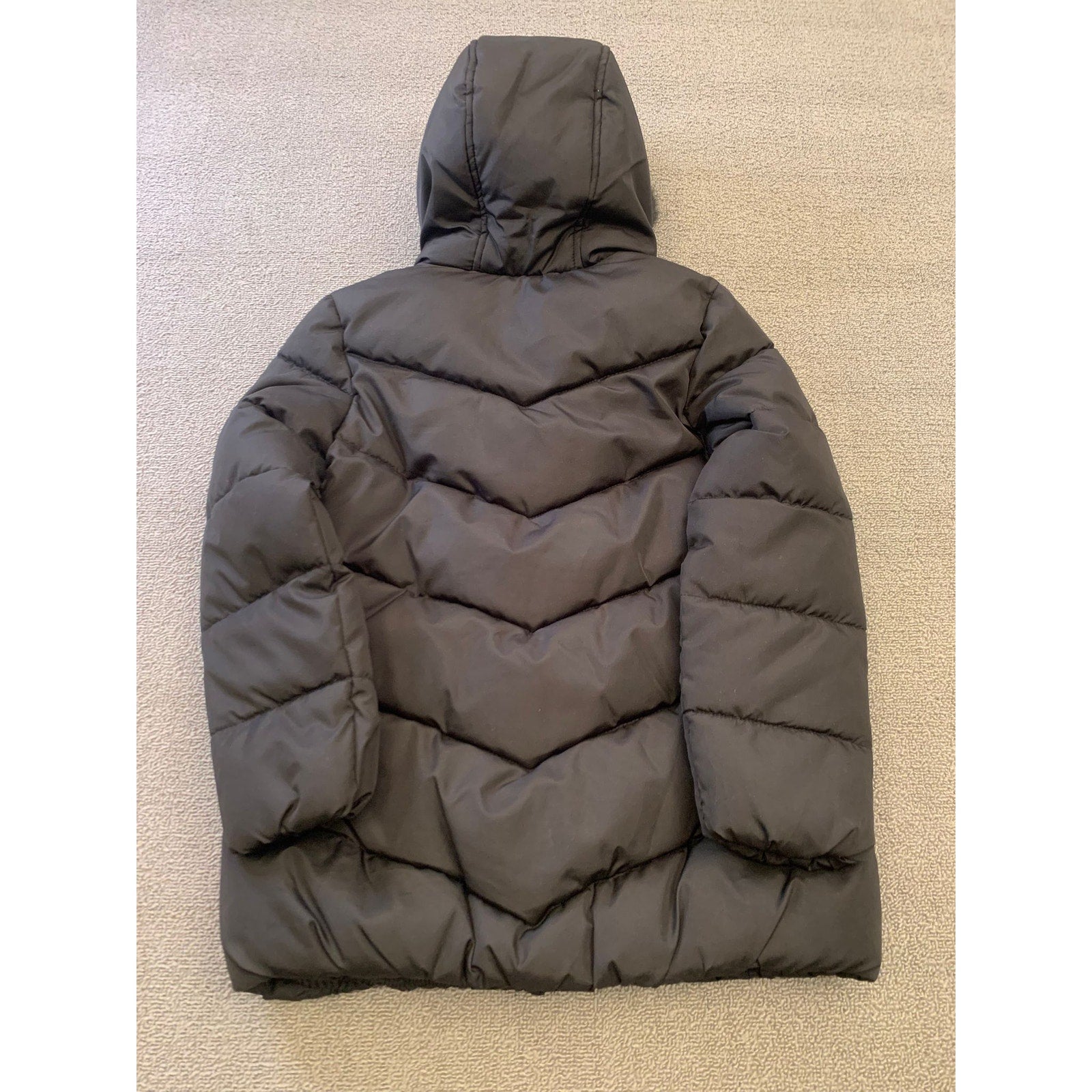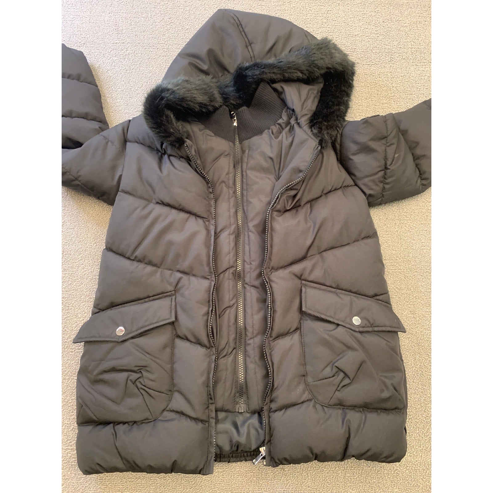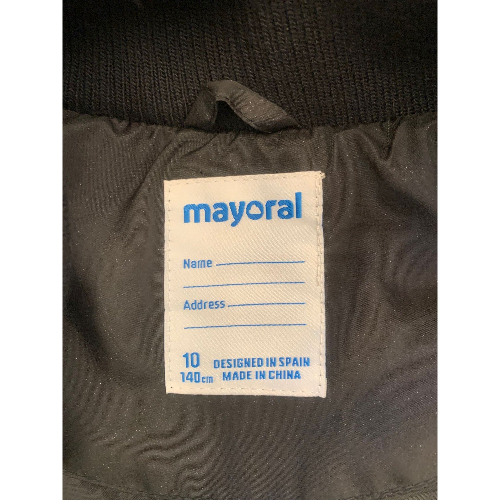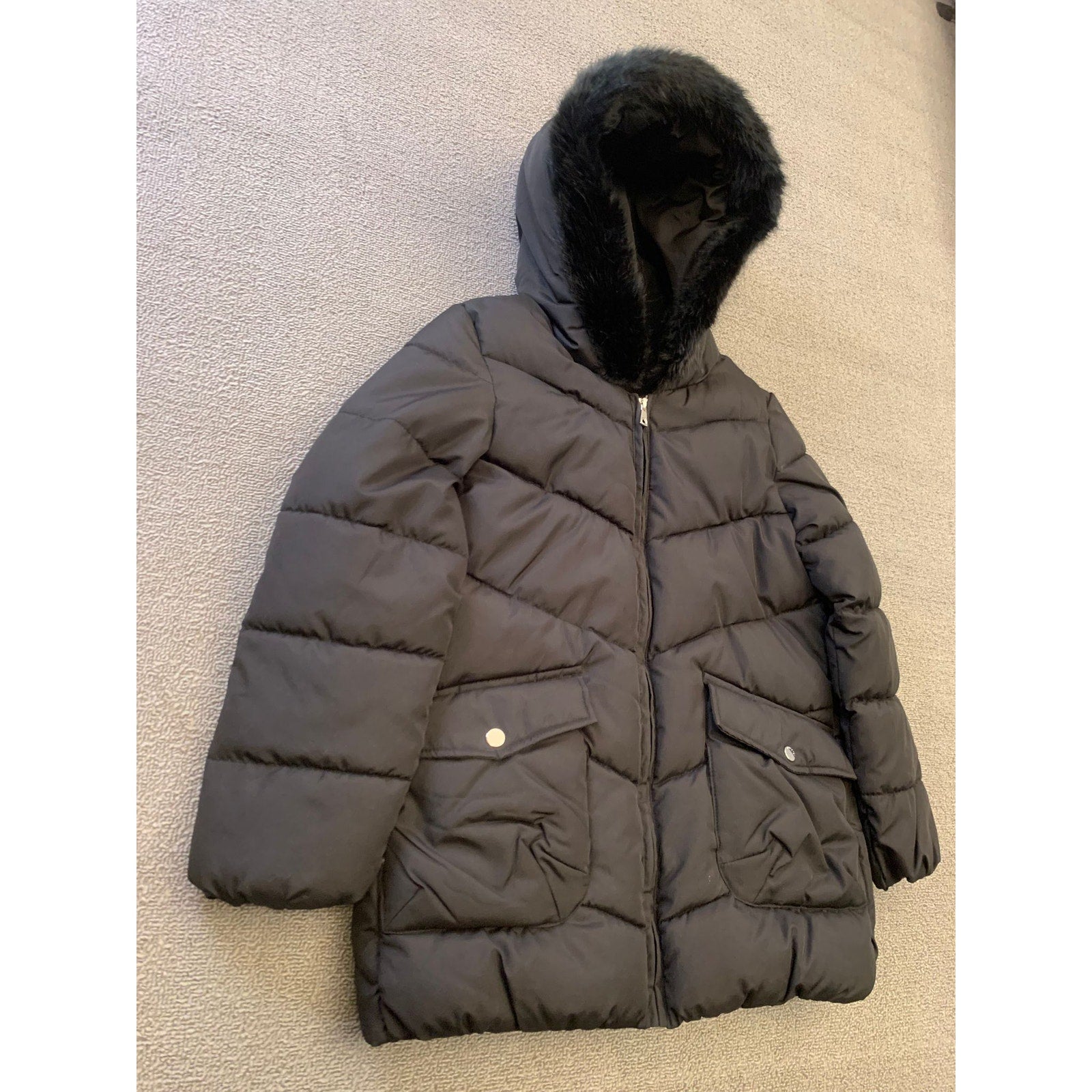 Mayoral Girl black puffer winter coat with faux fur trimmed hood. Features zip front closure, two large flap pockets with snap buttons, and quilted padded design for warmth.