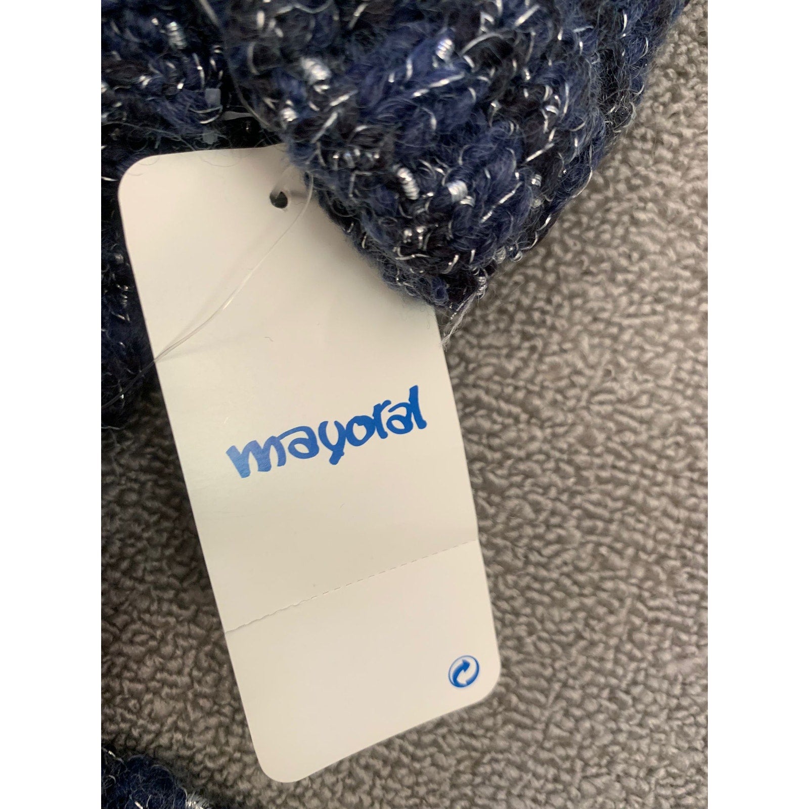 Stylish and cozy 3-piece winter accessory set from Mayoral. Includes a navy blue knit scarf, matching gloves, and a pom pom beanie hat. Features metallic thread detailing for a subtle shimmer. Perfect for keeping warm while looking fashionable during cold weather.