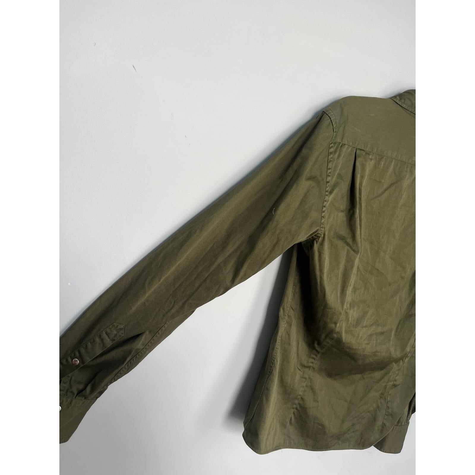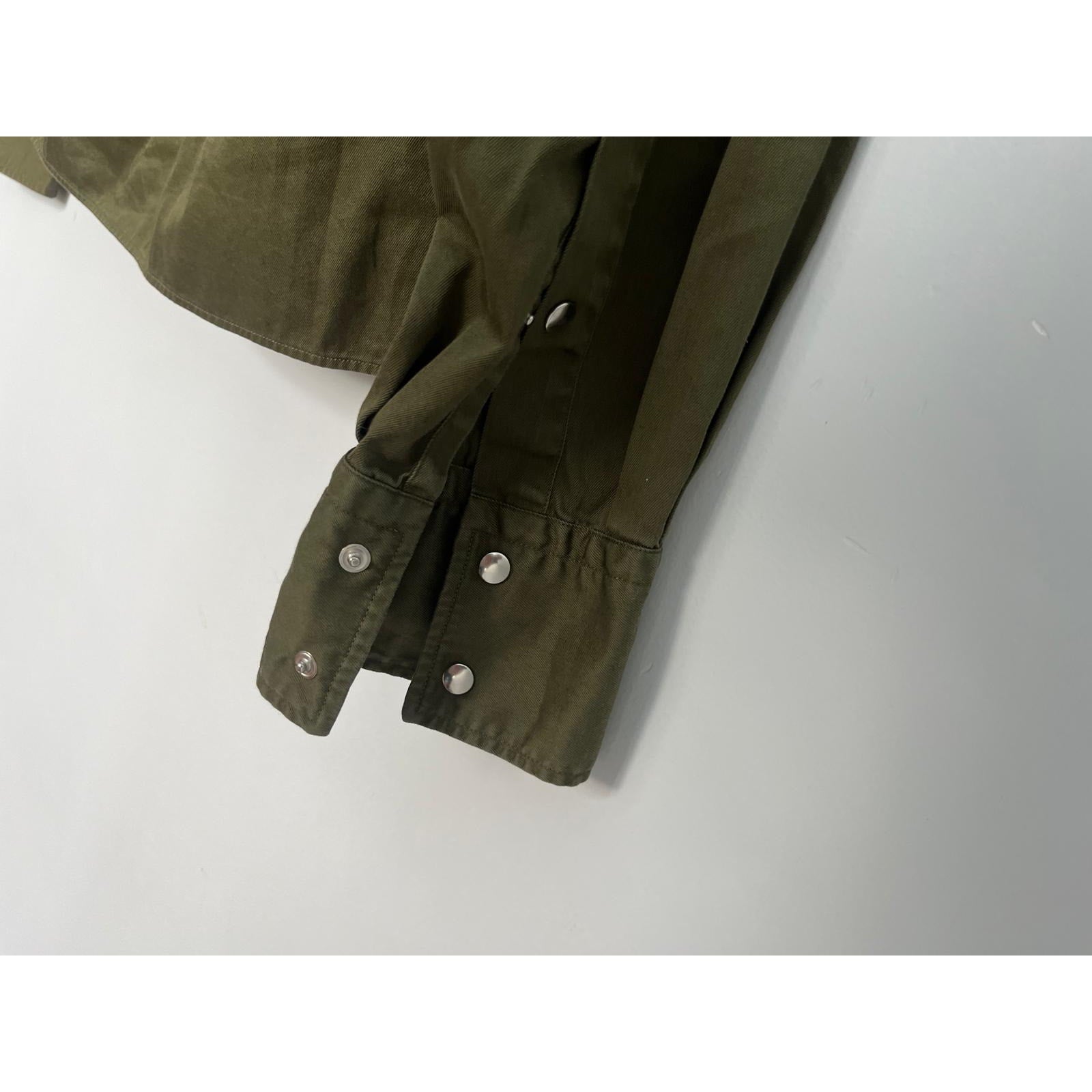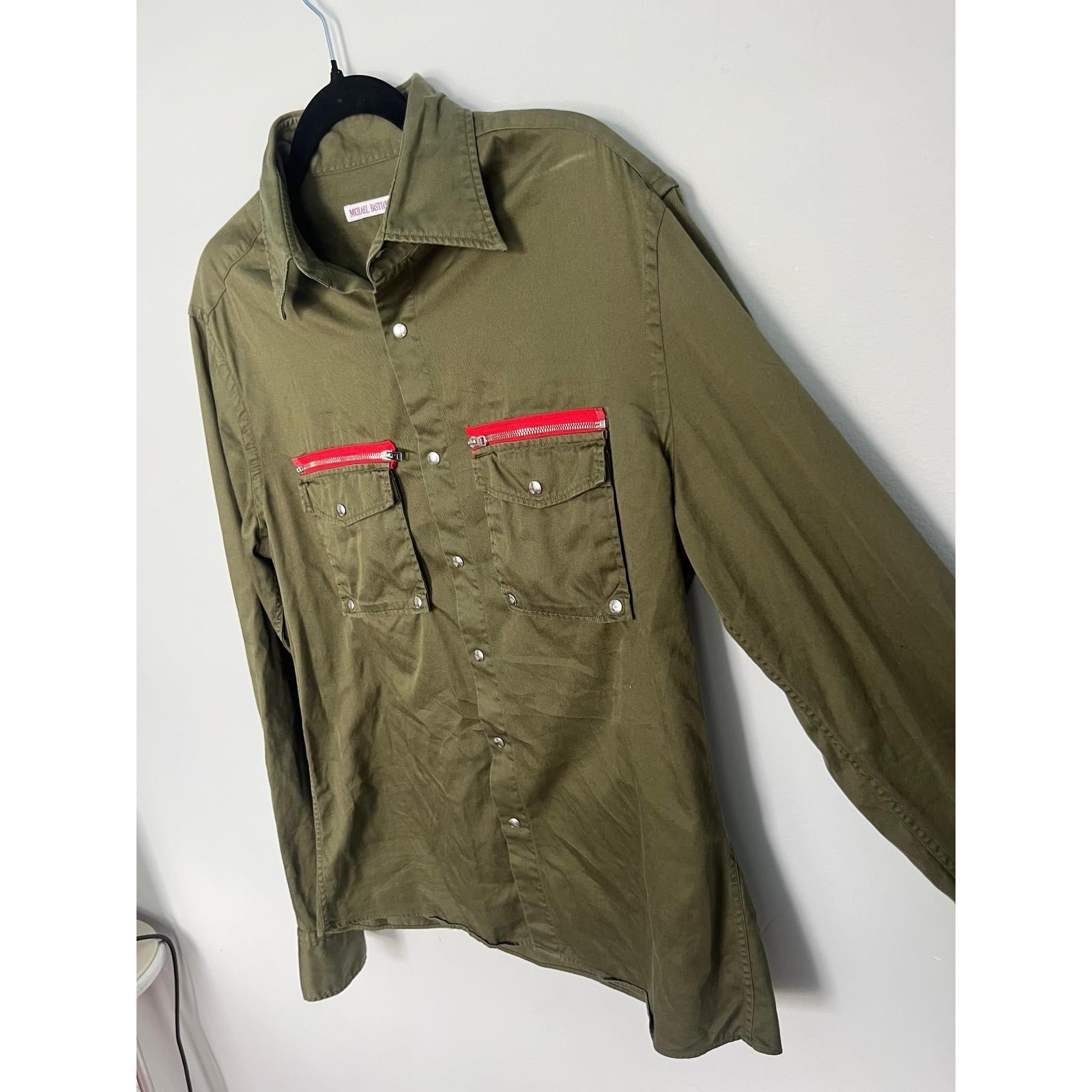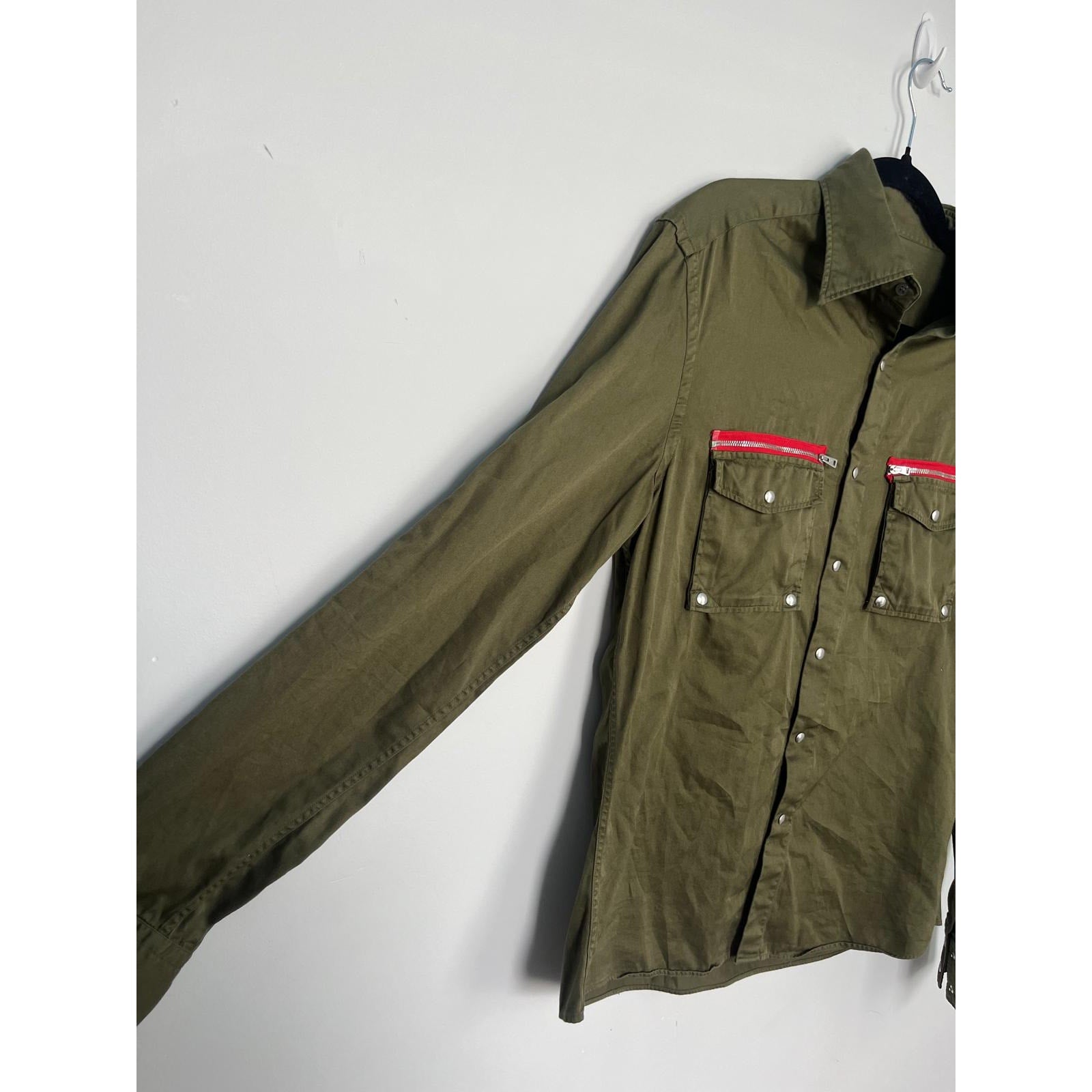 Structured military-style button-up shirt with pearlized snap buttons and contrasting red zipper chest pockets. Made in Italy from a smooth cotton twill.