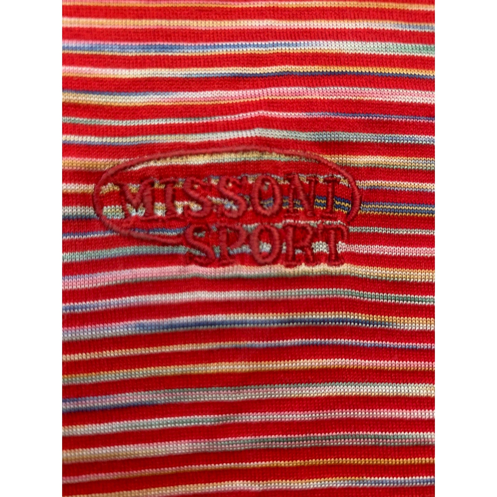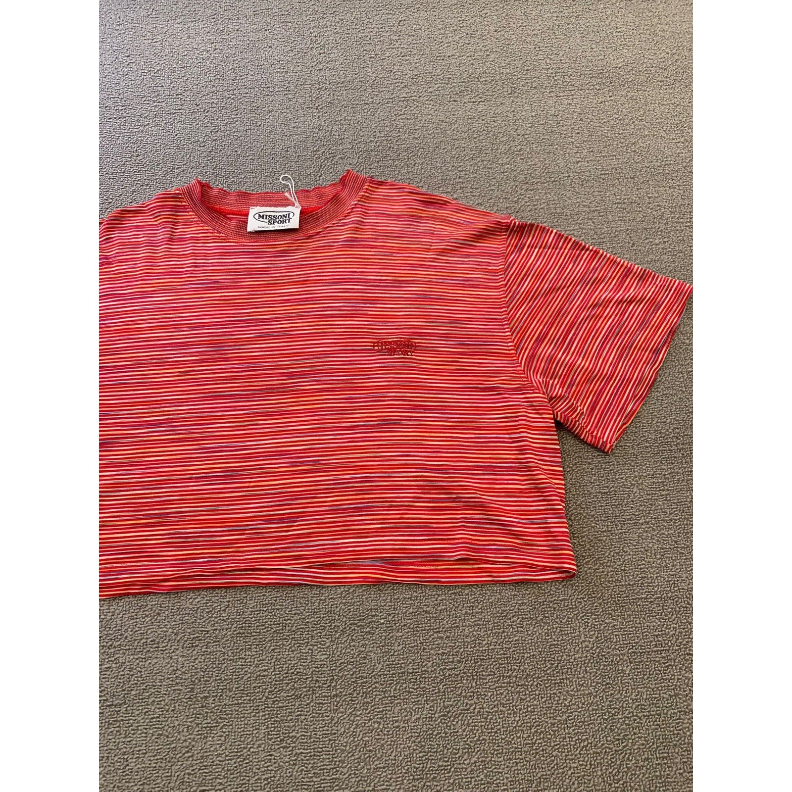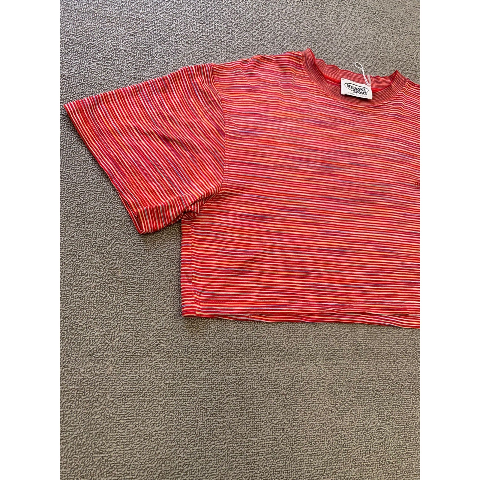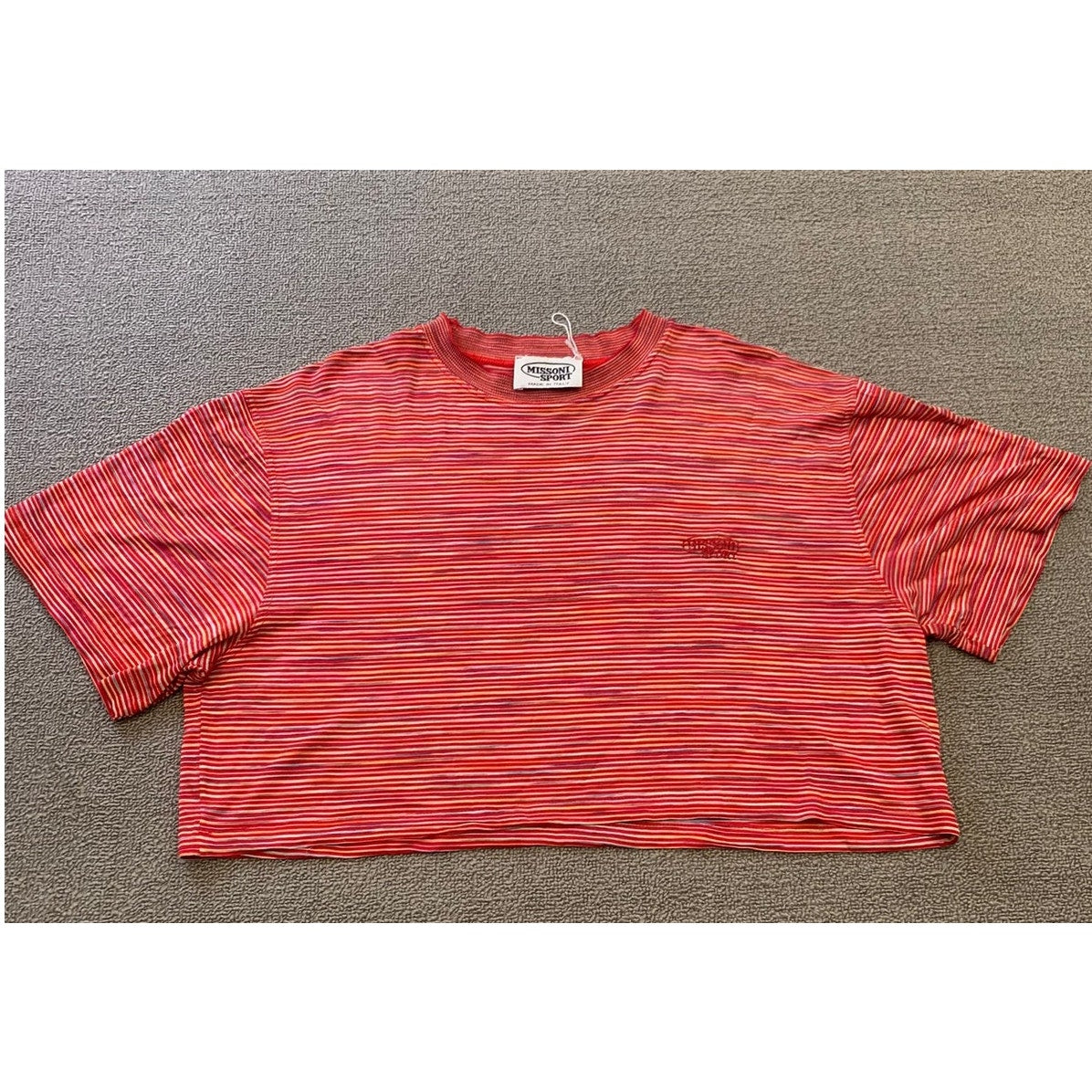 Vintage Missoni Sport women’s cropped short sleeve T-shirt featuring red multi-color horizontal stripes and embroidered logo detail. Made in Italy with lightweight stretch fabric, perfect for casual wear.