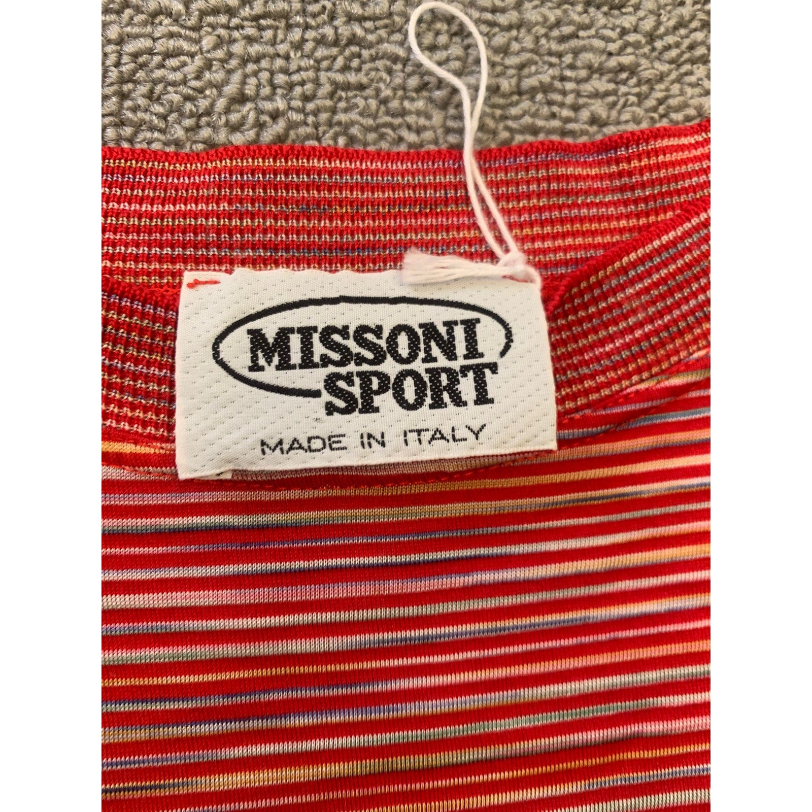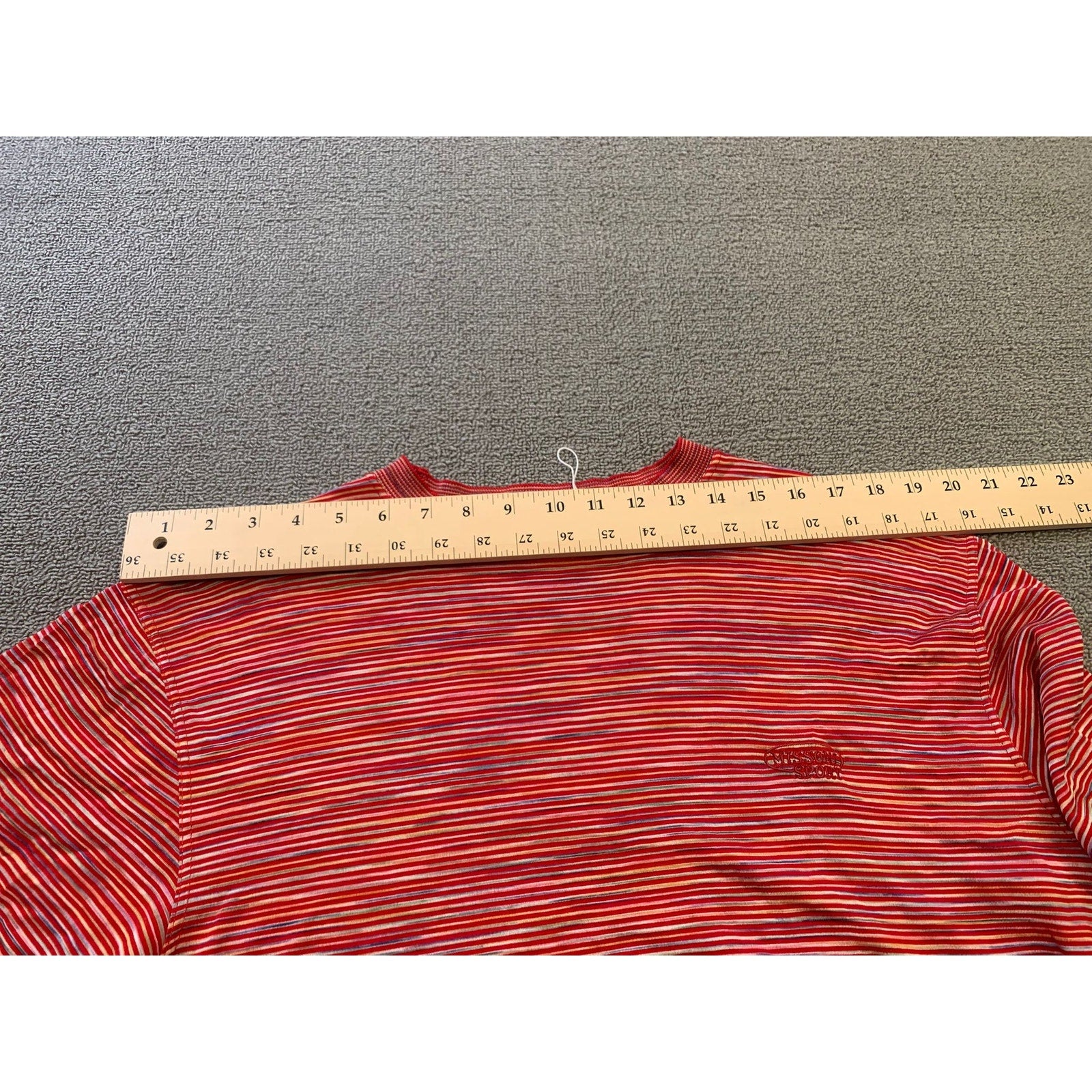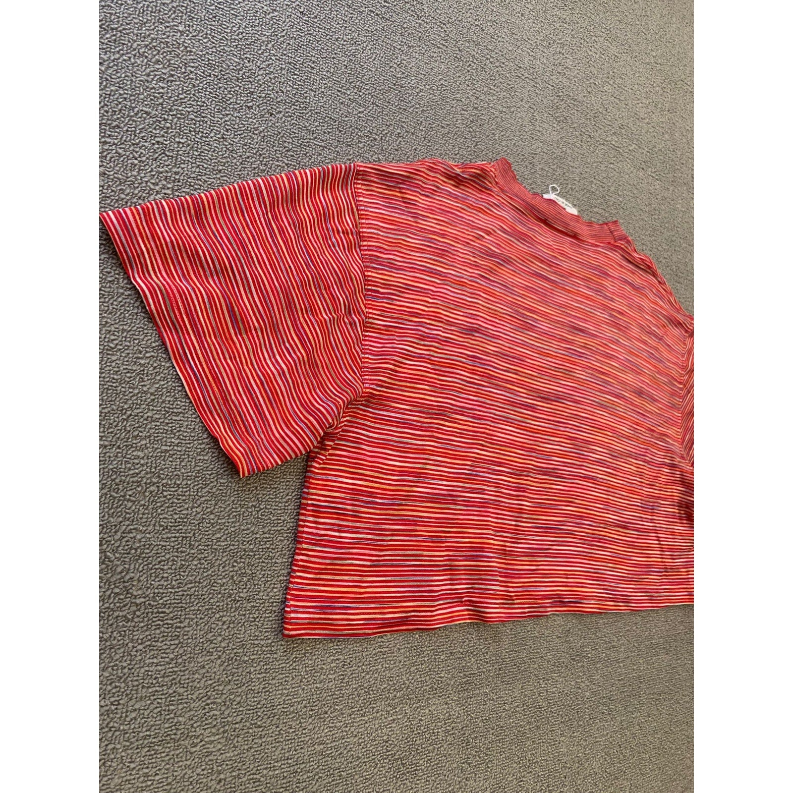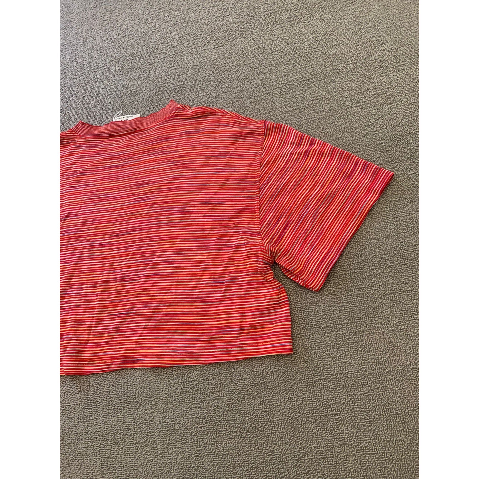 Vintage Missoni Sport women’s cropped short sleeve T-shirt featuring red multi-color horizontal stripes and embroidered logo detail. Made in Italy with lightweight stretch fabric, perfect for casual wear.
