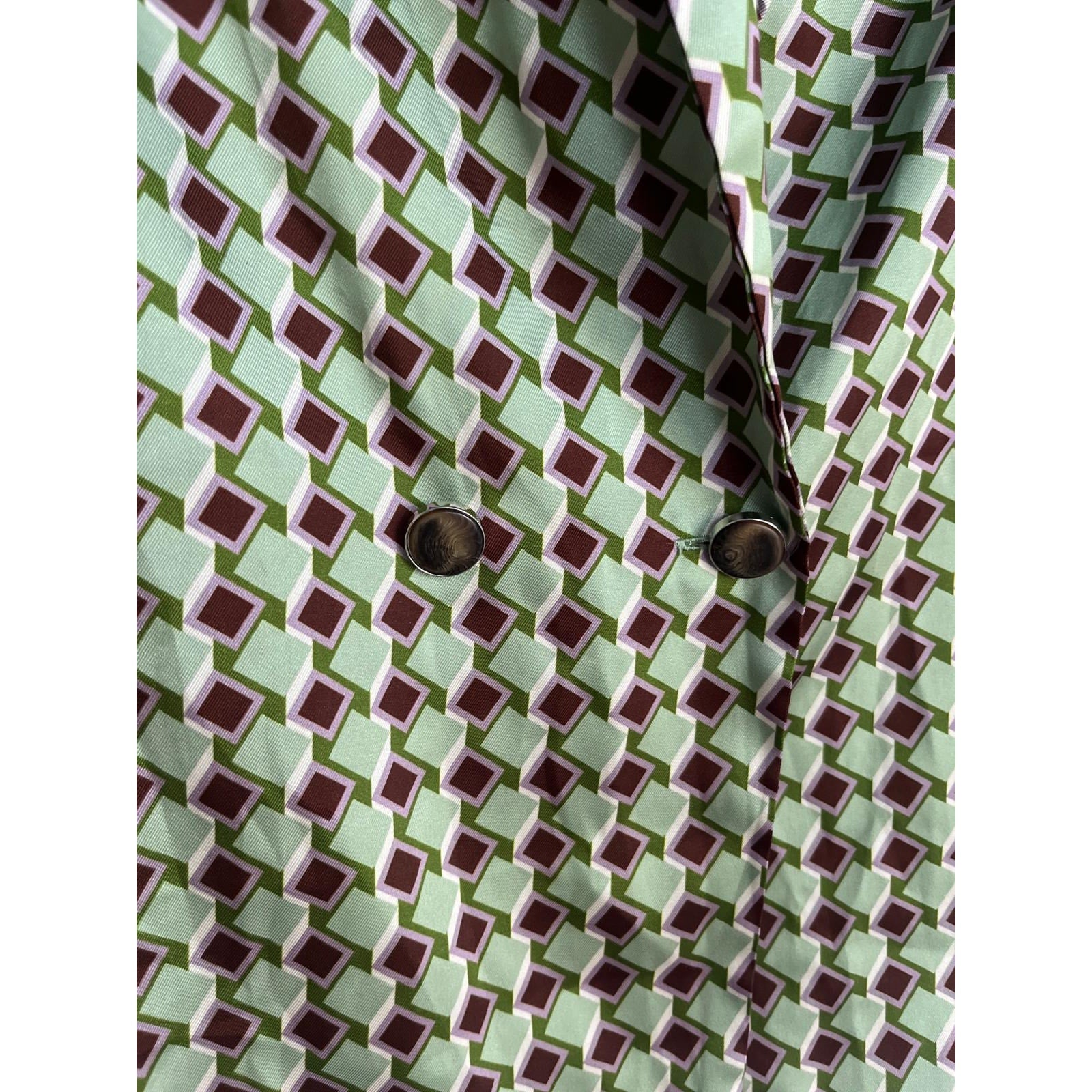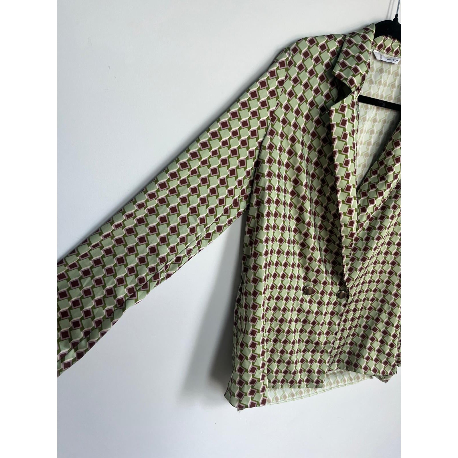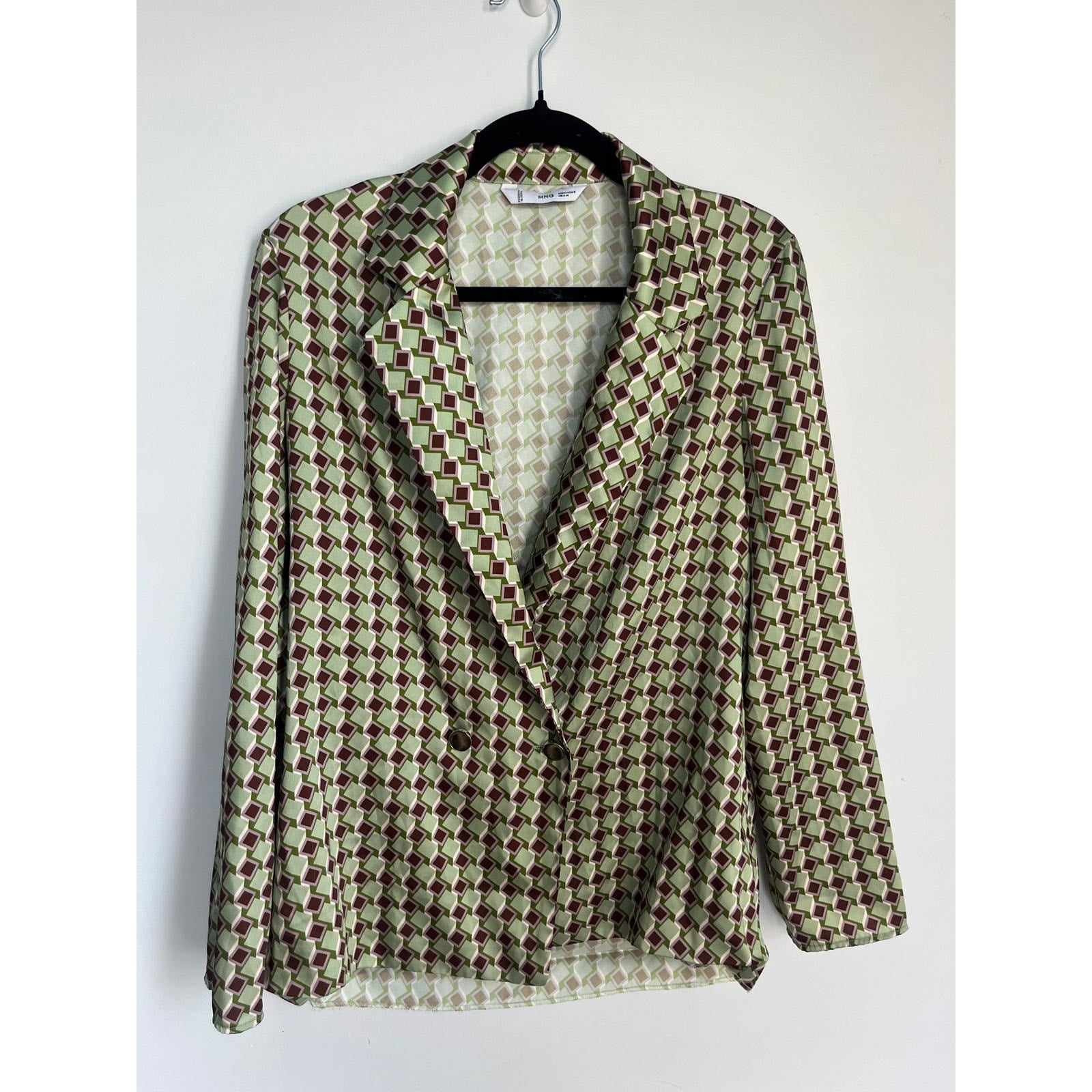 MNG Geometric Blazer Women M Green Brown Satin Diamond Print Lightweight Retro