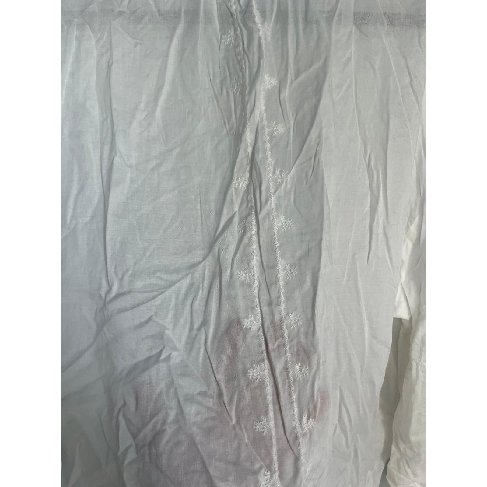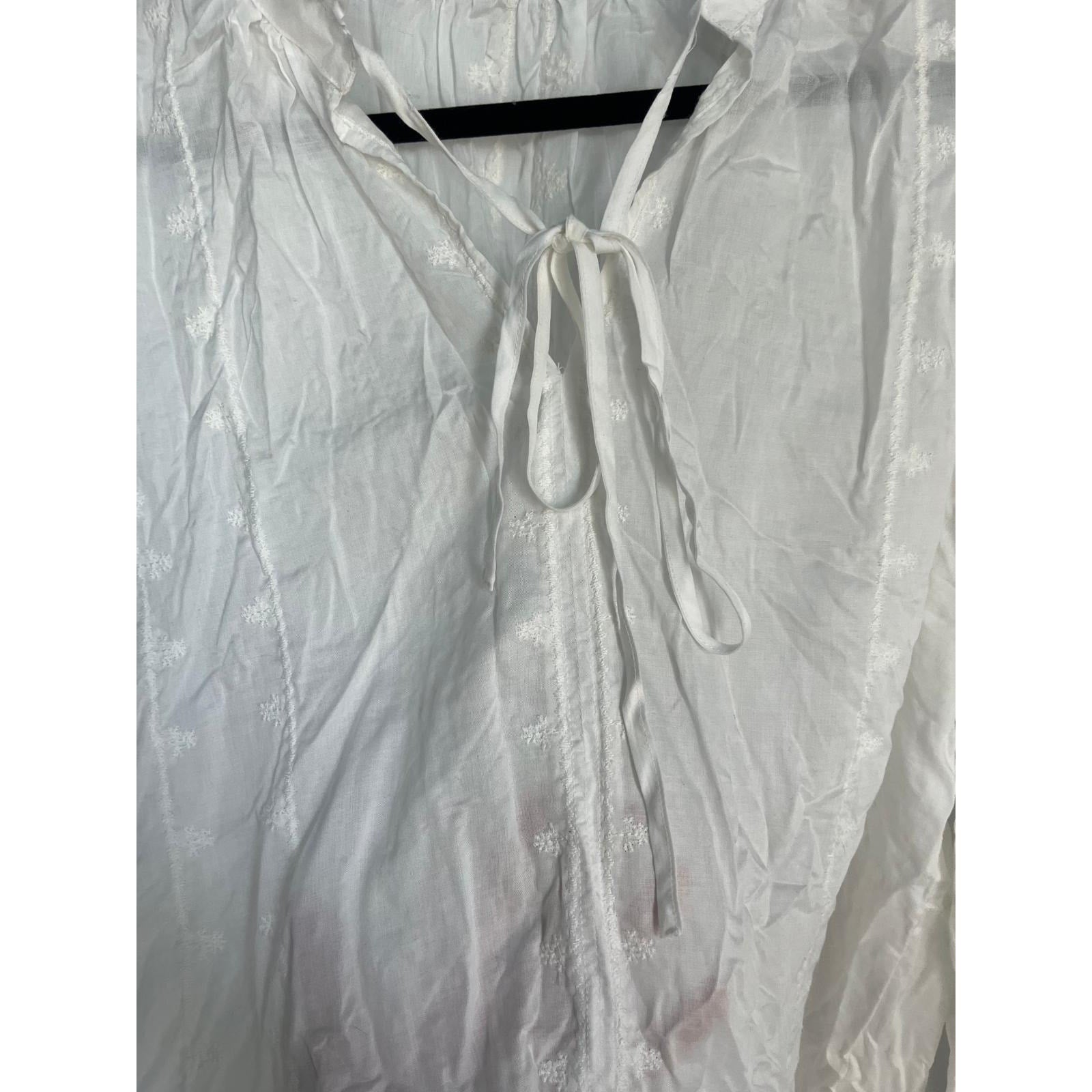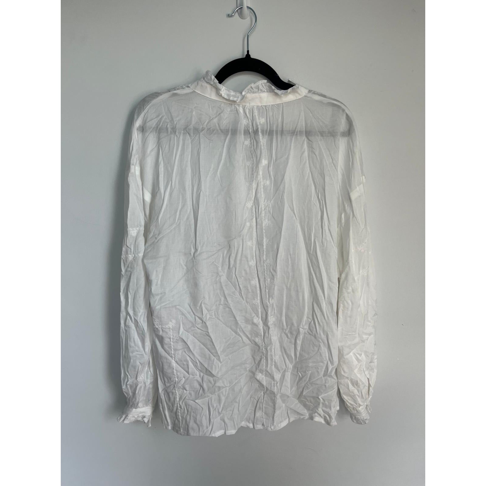 Lightweight semi-sheer white blouse with delicate embroidered detail. Features a ruffled collar, tie-neck front, long sleeves, and relaxed fit for an effortless romantic look.