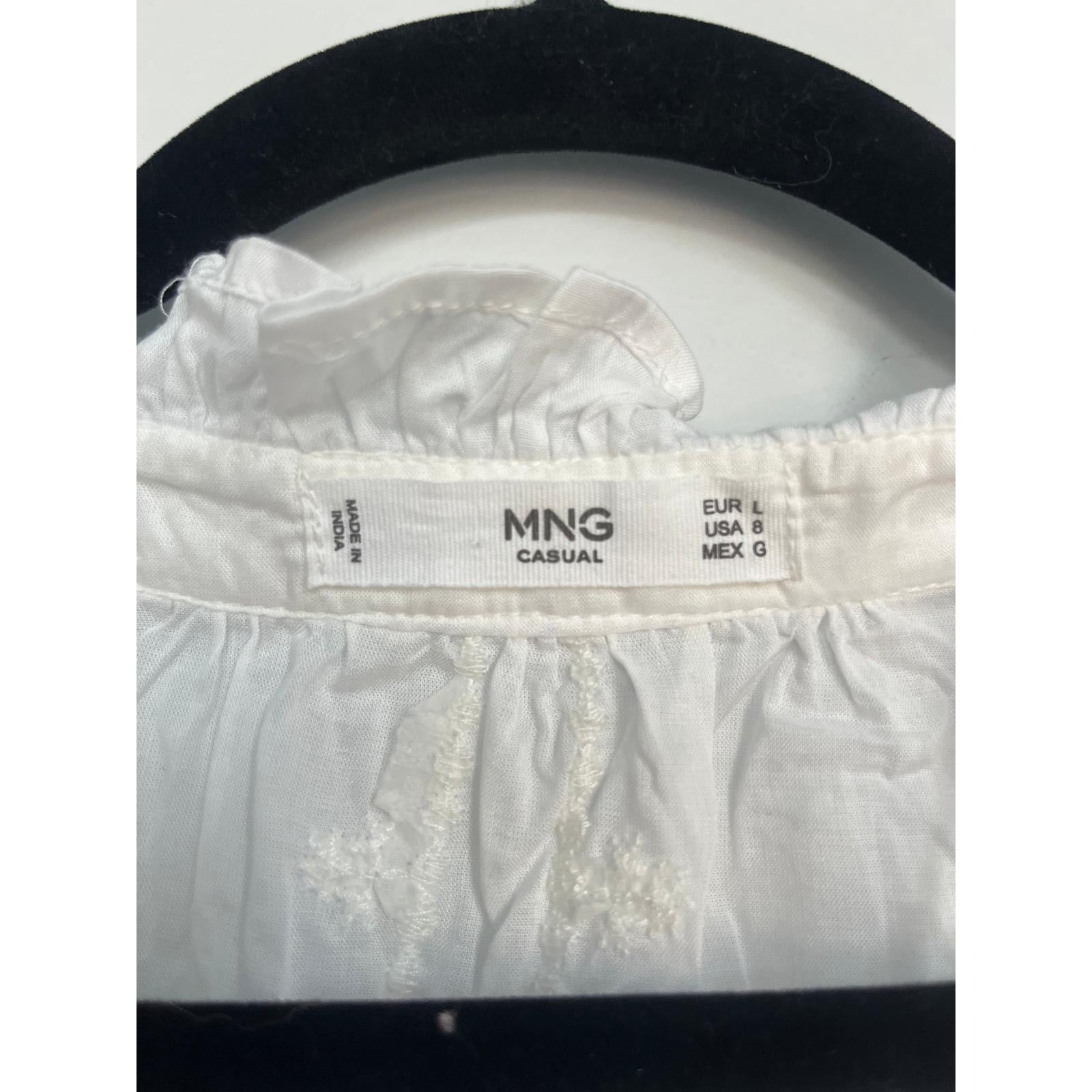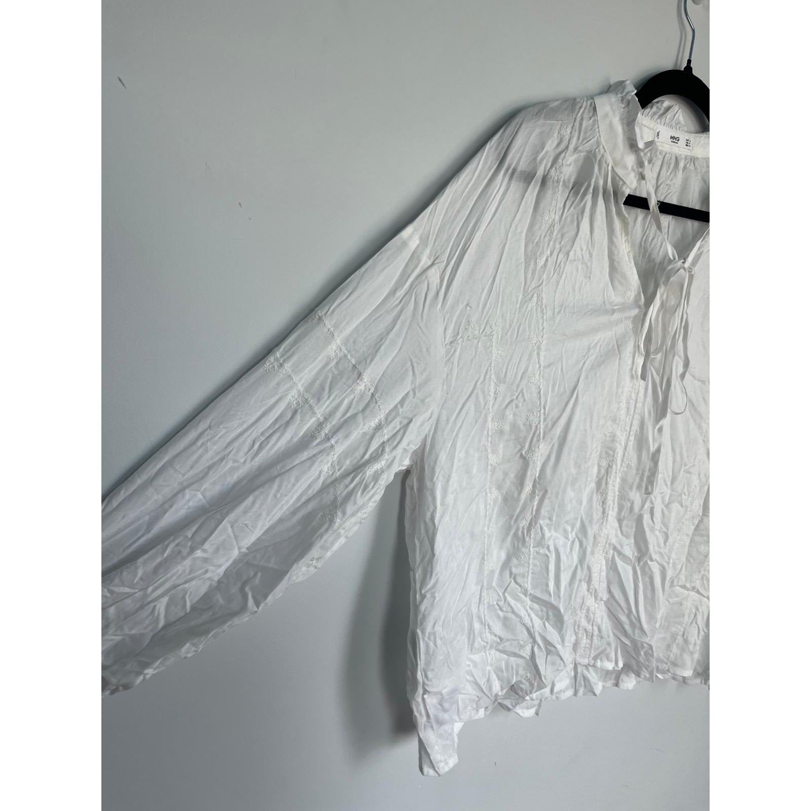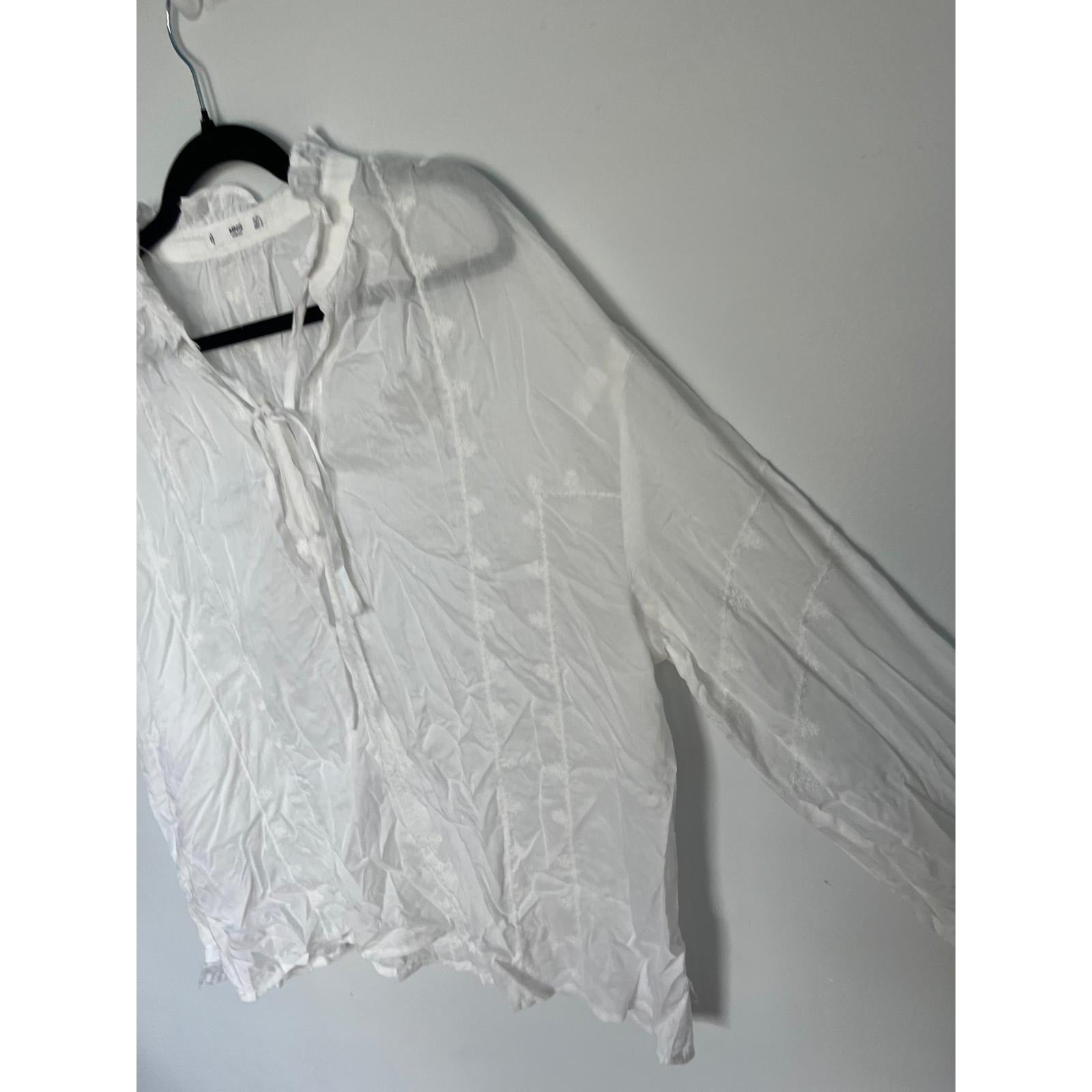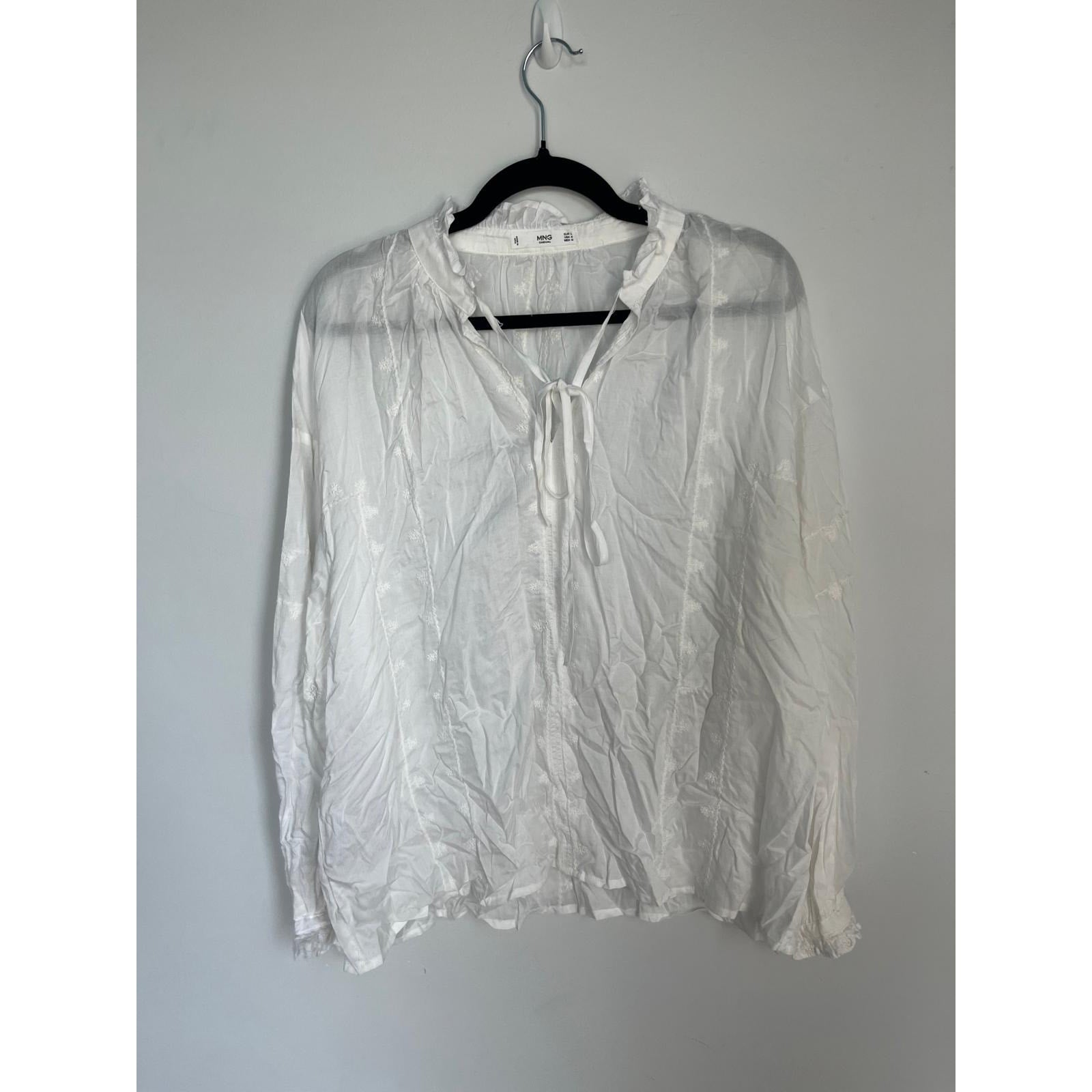 MNG White Blouse Women 8 Sheer Long Sleeve Ruffle Collar Tie Neck Lightweight