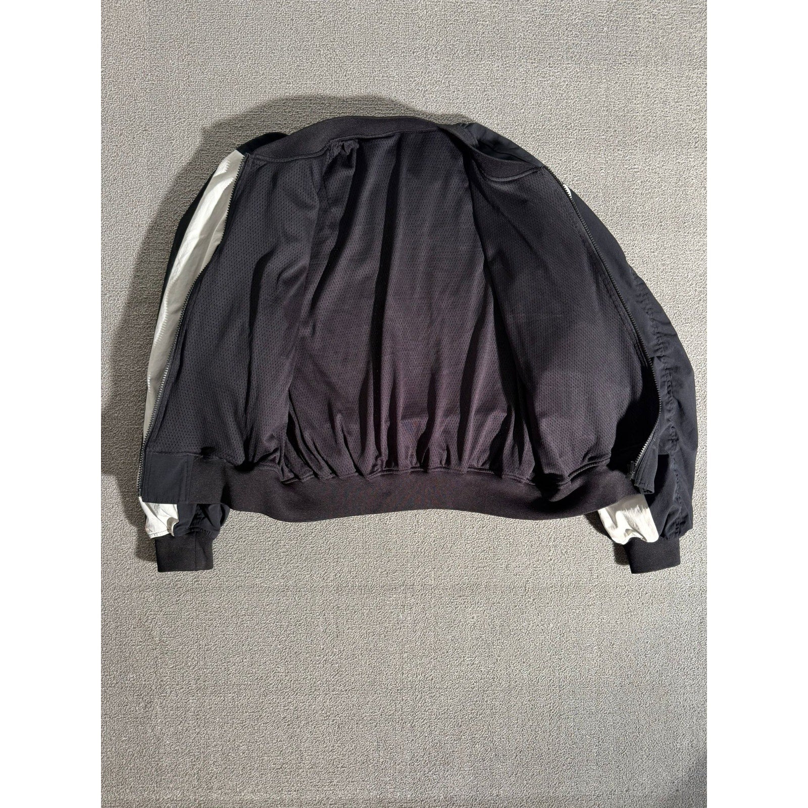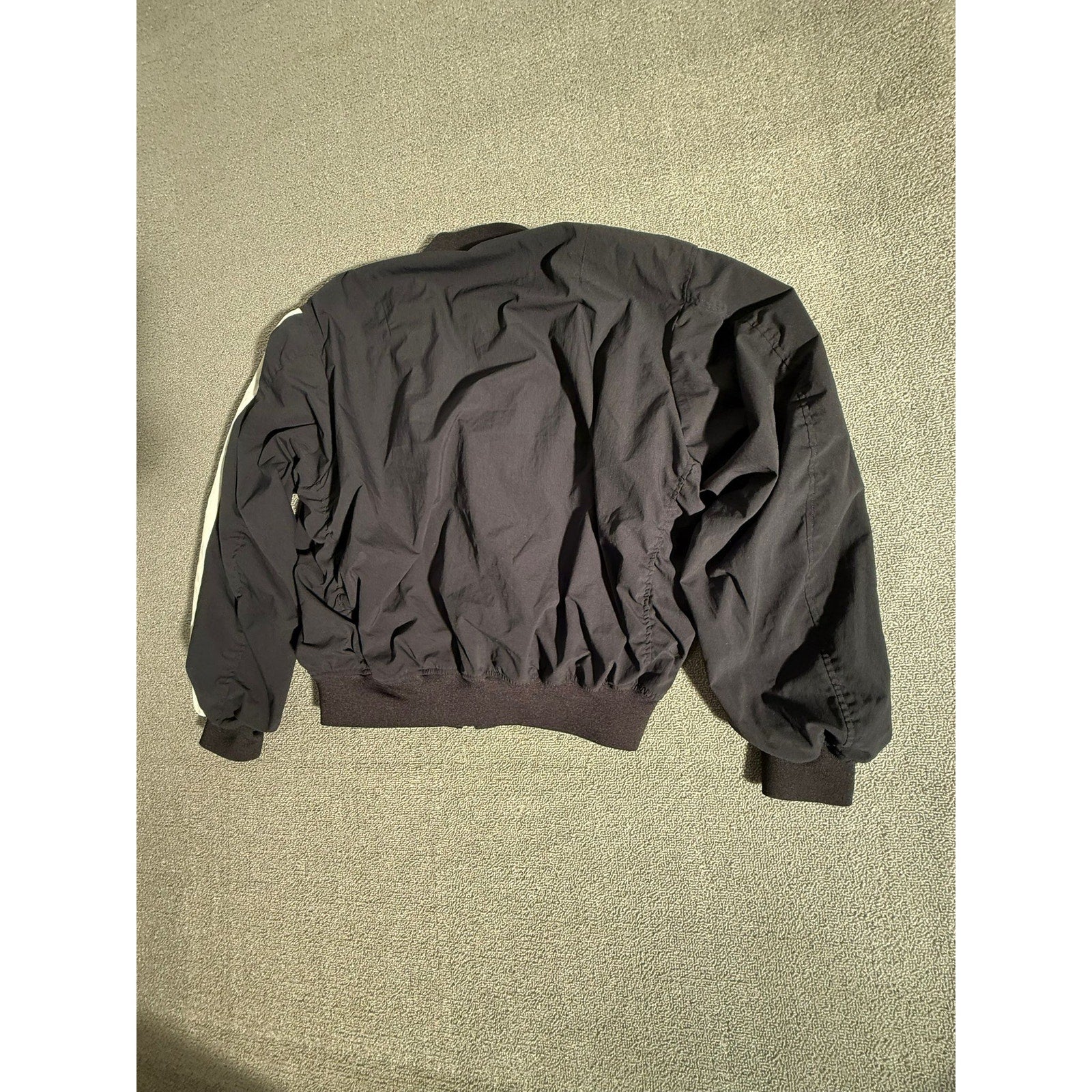A sporty-style black bomber jacket featuring bold contrasting white stripes running along both sleeves, zip‑front closure, and elasticated ribbed collar, hem, and cuffs—adds a sharp, athleisure edge to everyday layering.