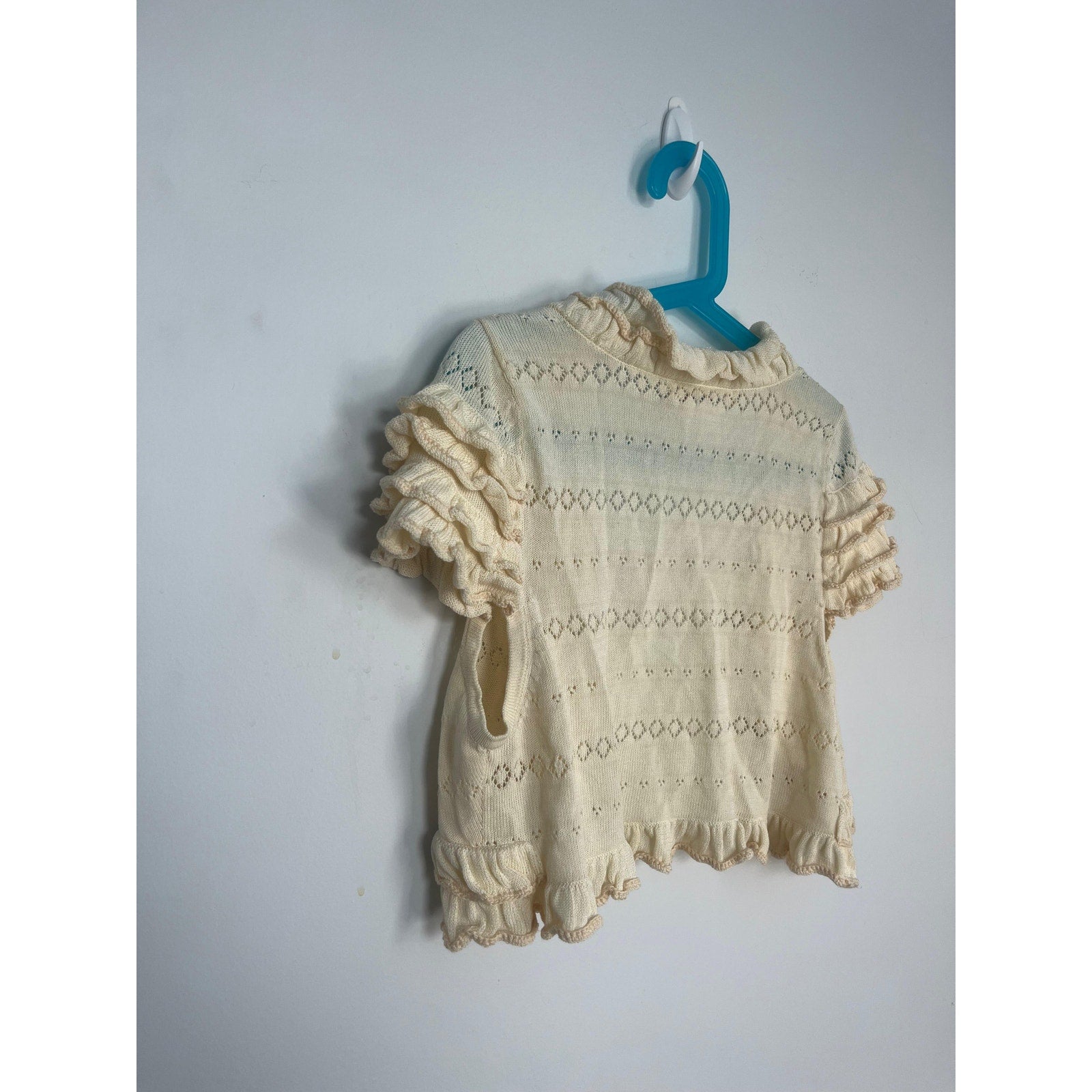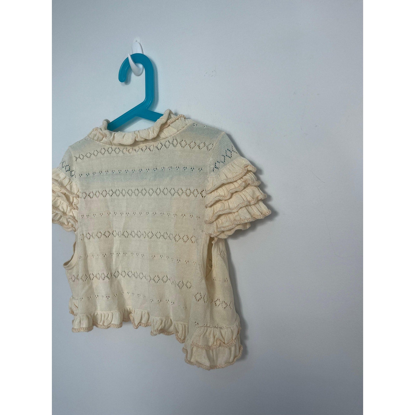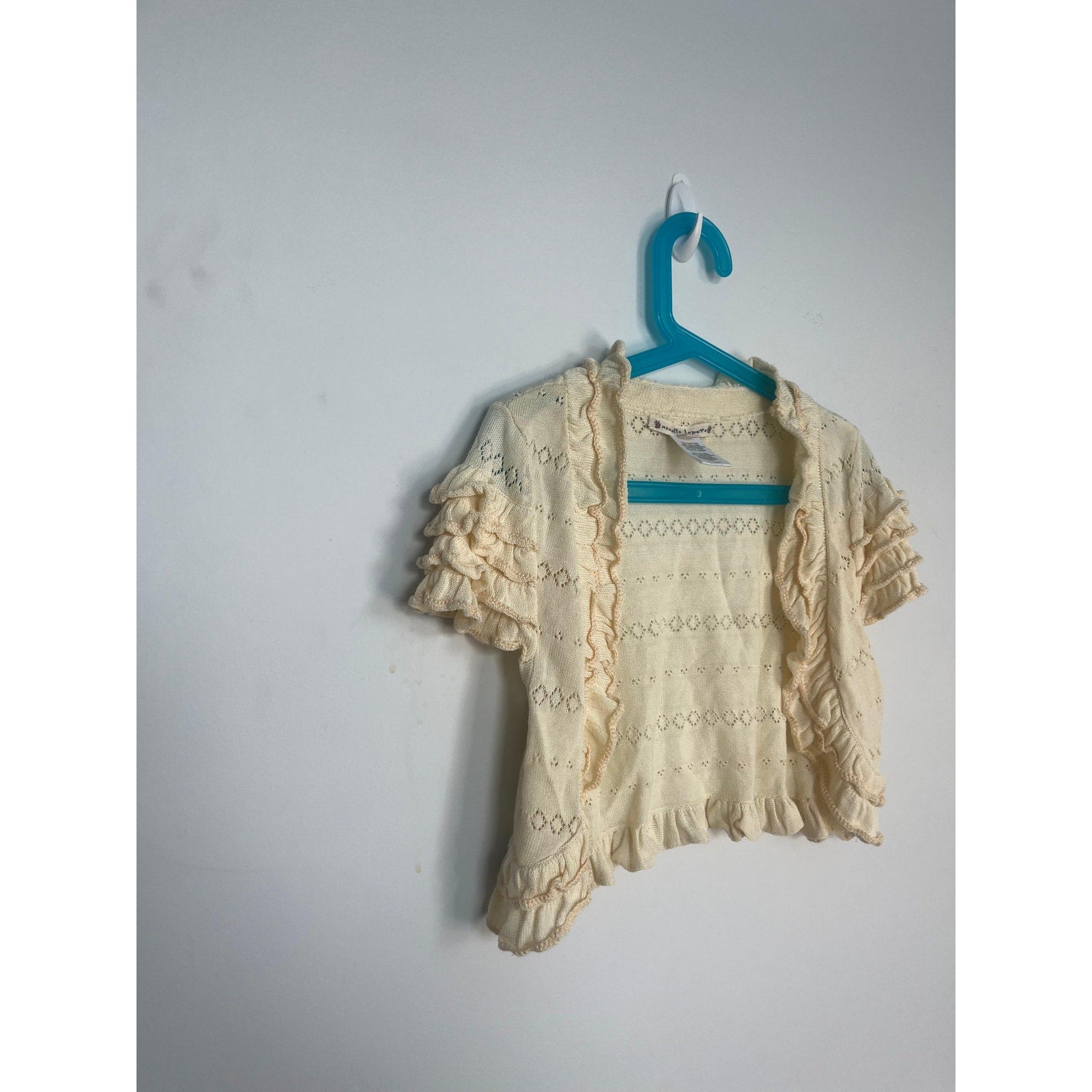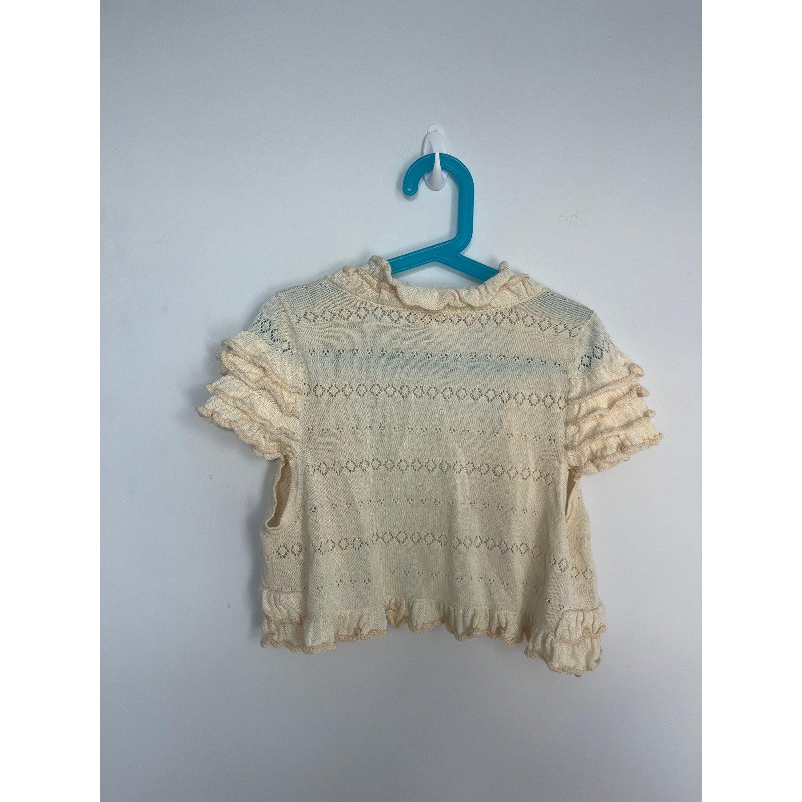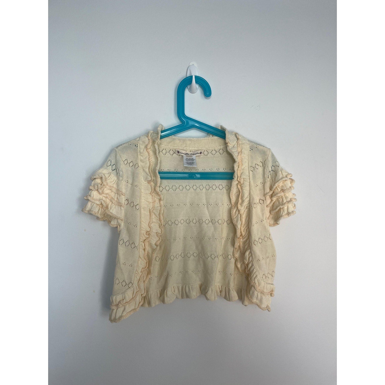 Vintage-inspired open knit cropped shrug with ruffled trim and feminine eyelet detailing throughout. Features short sleeves and lightweight construction for layering.
