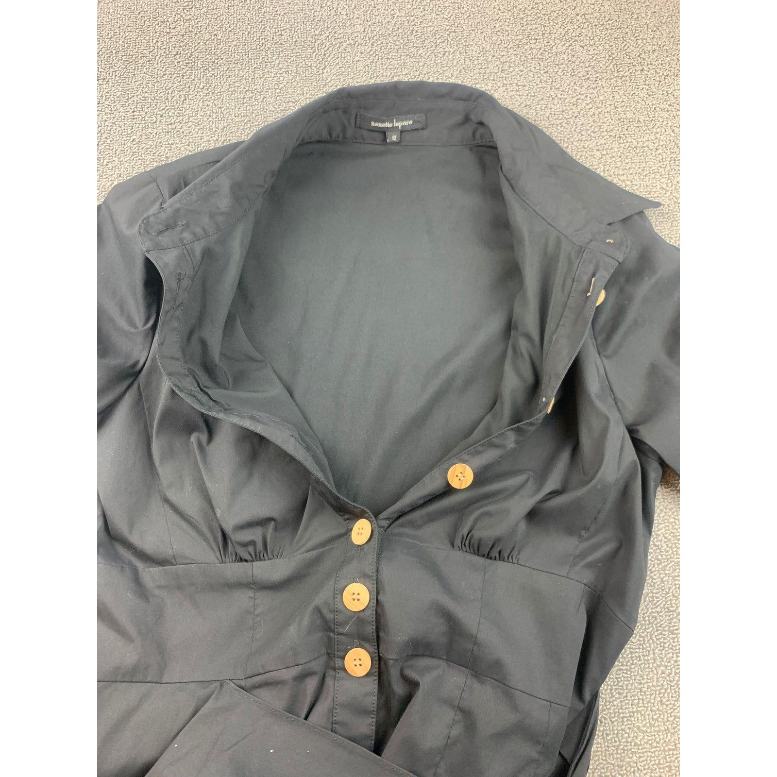Chic Nanette Lepore black dress with short sleeves and statement buttons down the front. Features a collared neckline, button-up bodice, and a side tie waist detail for a flattering fit. Perfect for both professional wear and elegant occasions.