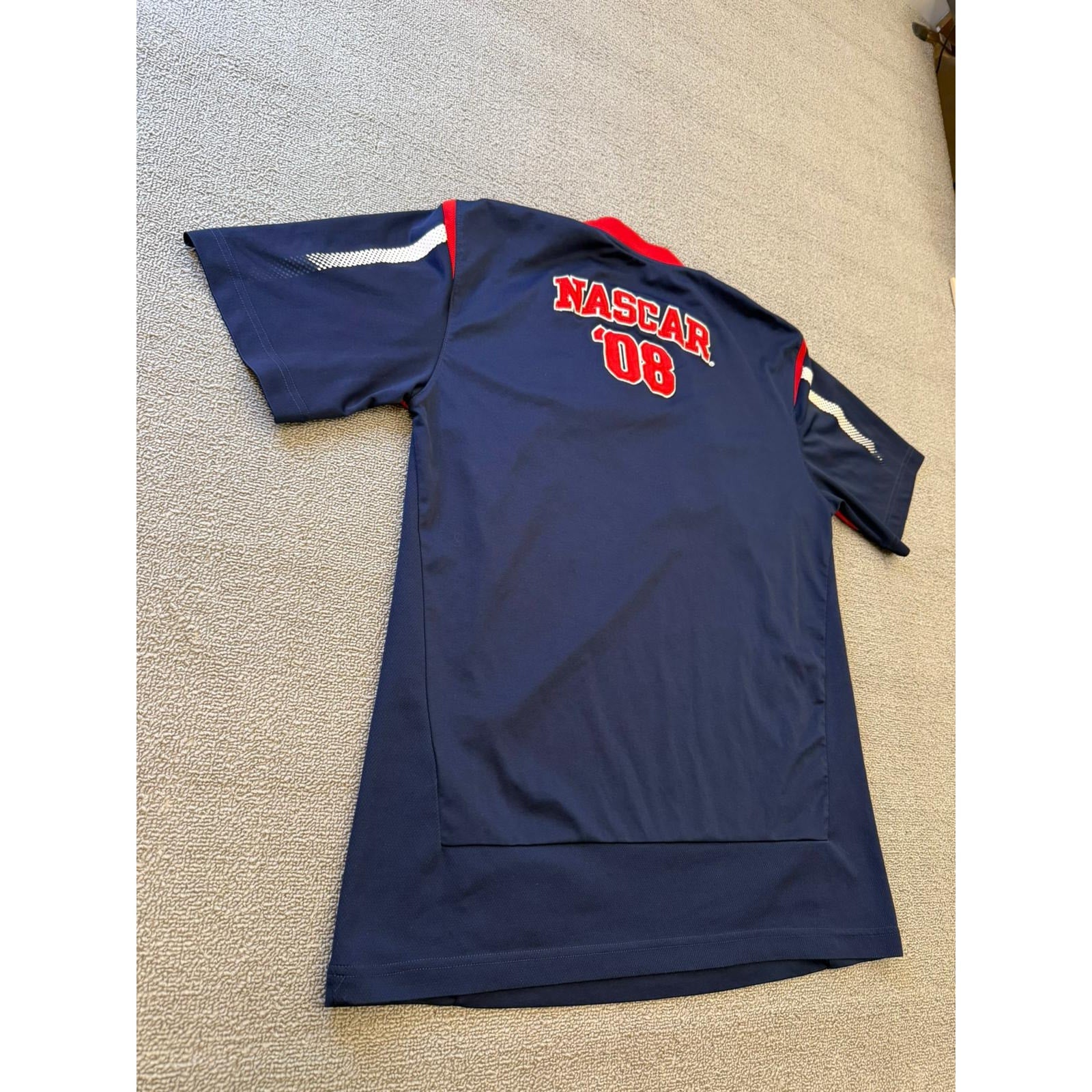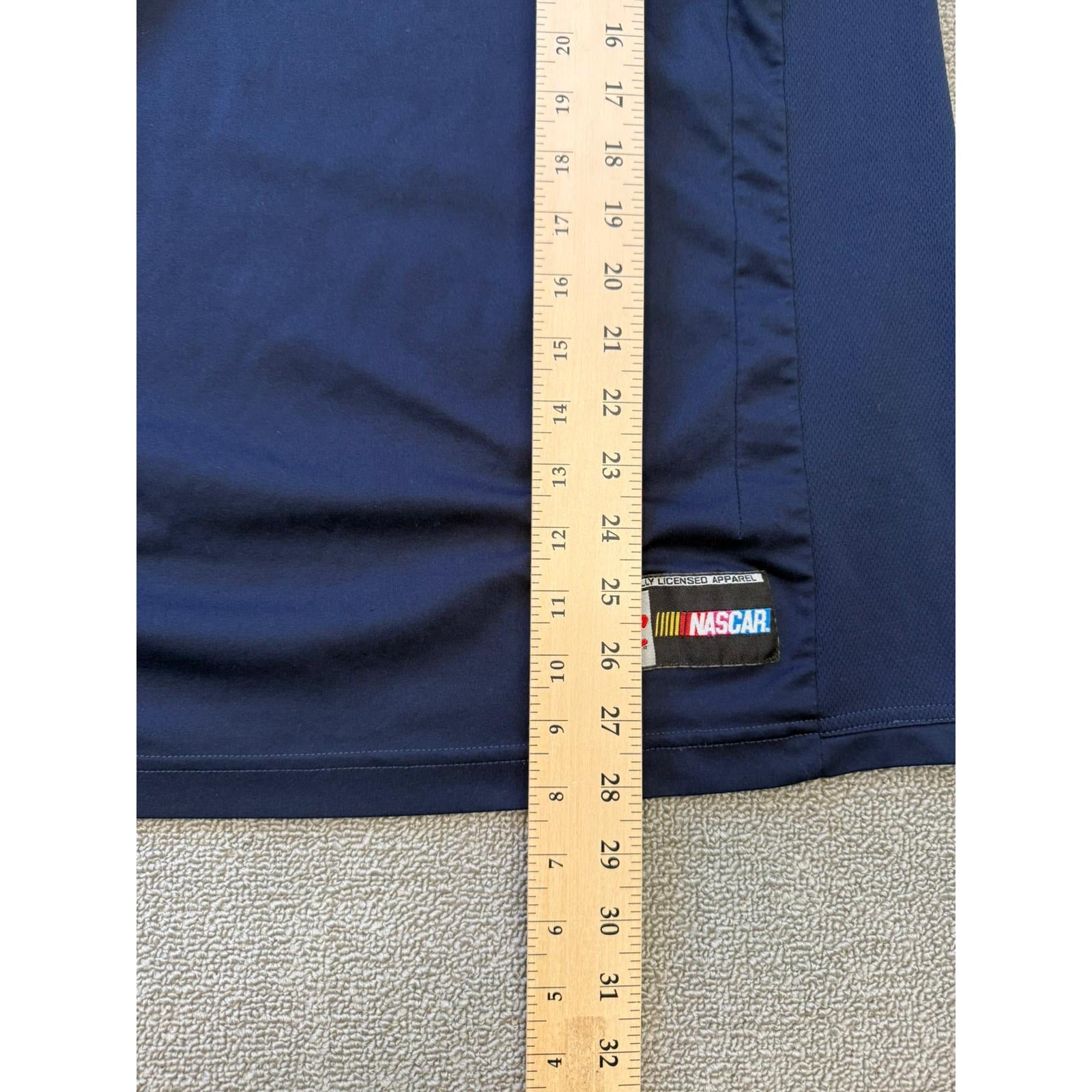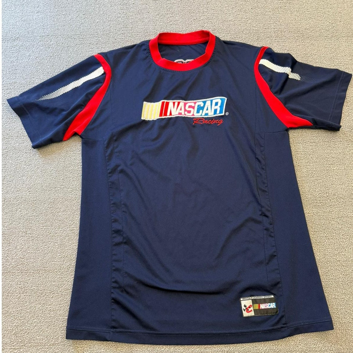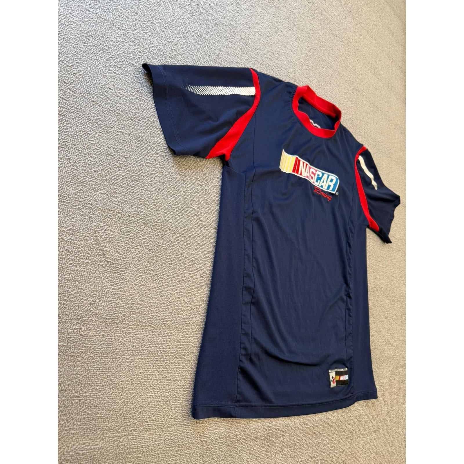 Officially licensed NASCAR Racing short sleeve shirt in navy blue with red accents and embroidered logo. Features a breathable performance fabric ideal for casual wear or sporting events.