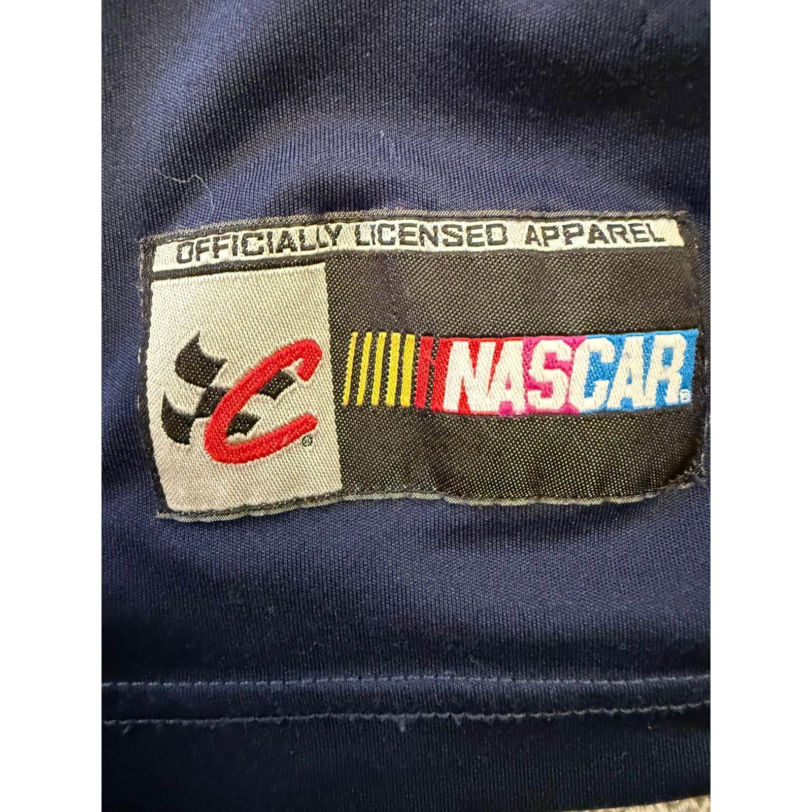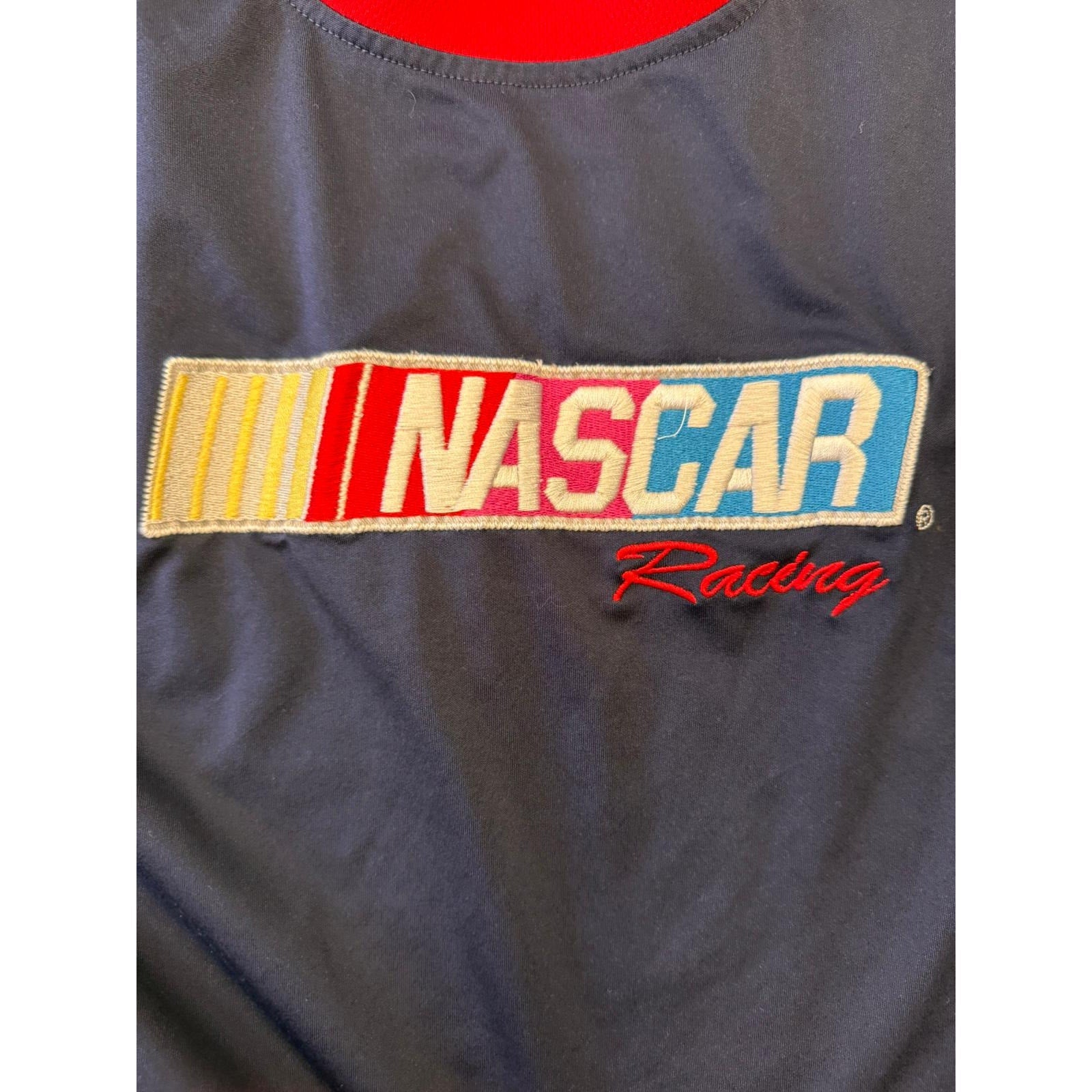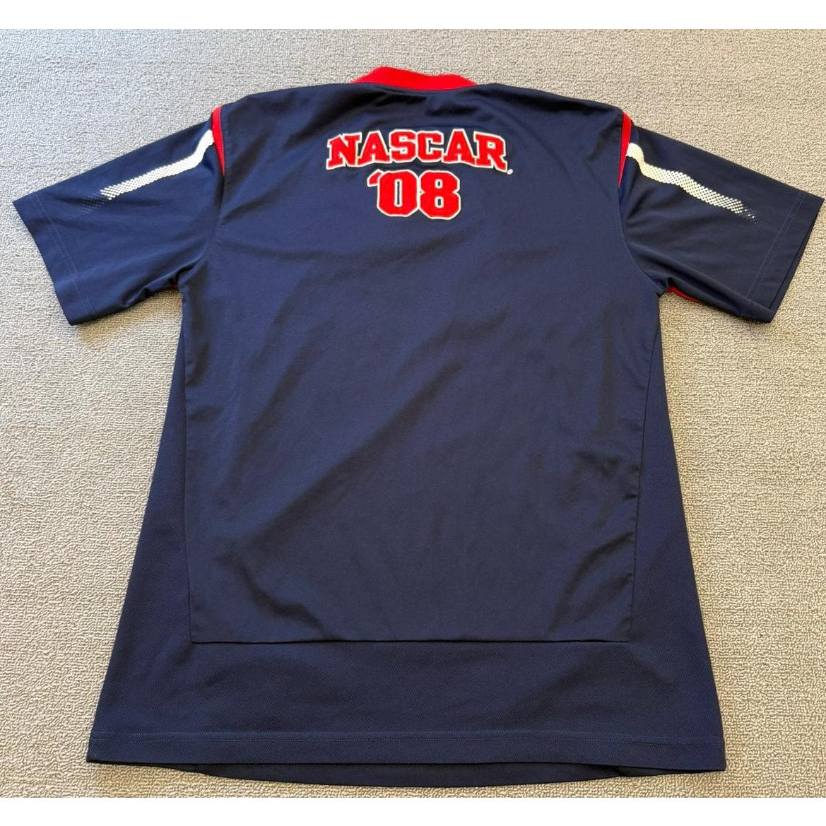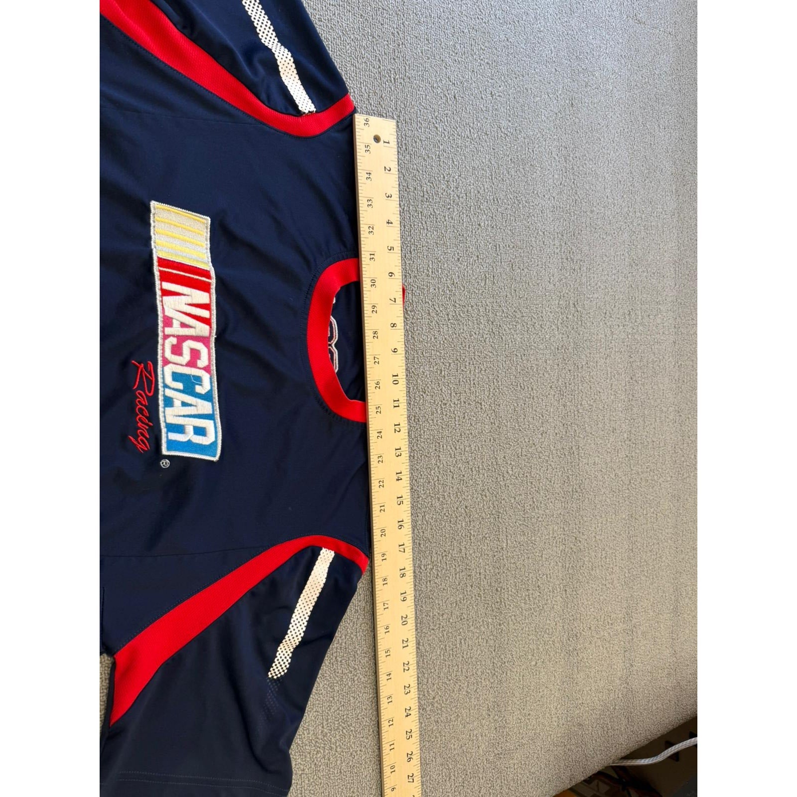 Officially licensed NASCAR Racing short sleeve shirt in navy blue with red accents and embroidered logo. Features a breathable performance fabric ideal for casual wear or sporting events.