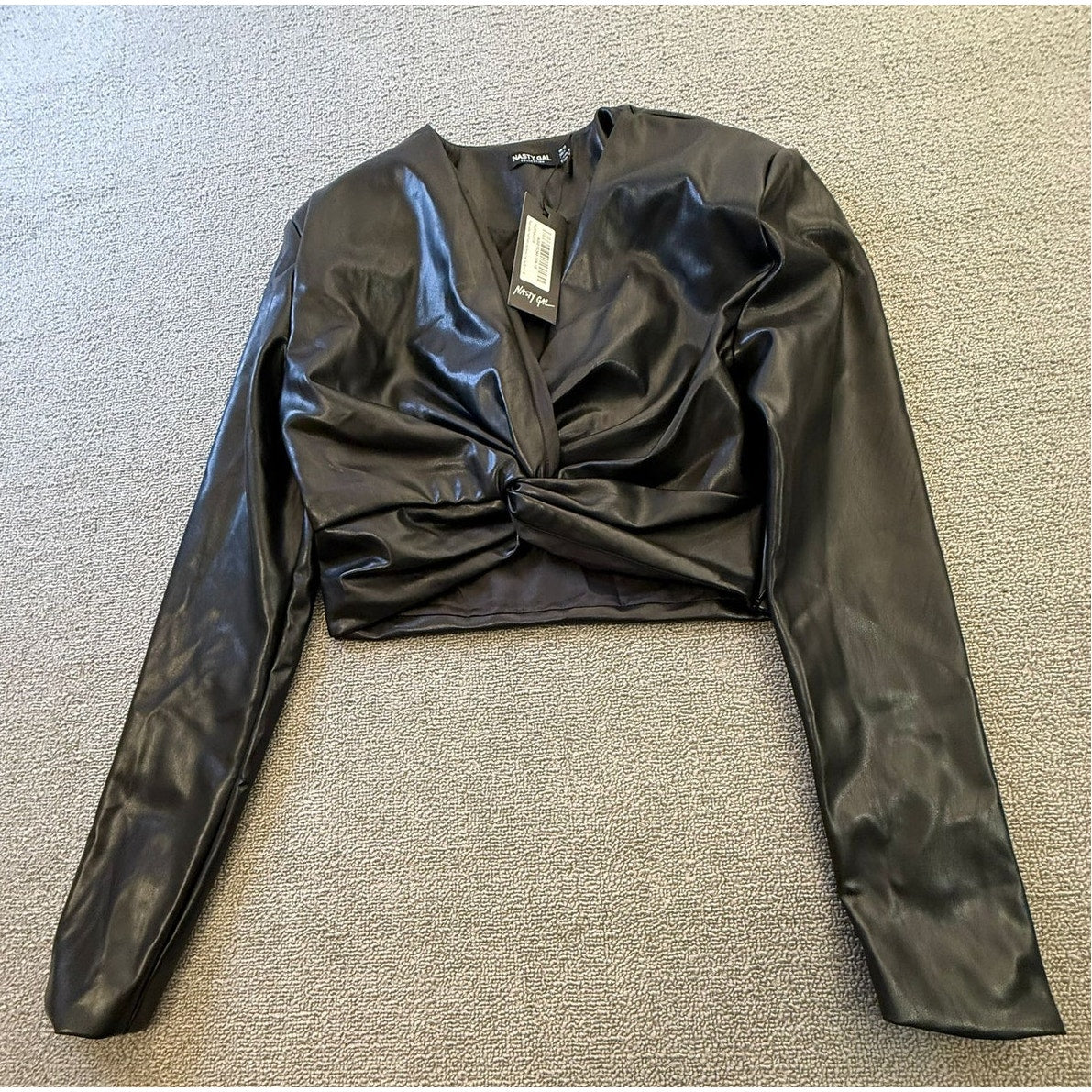 Nasty Gal Collection women’s faux leather long sleeve twist front crop top in black. Features a deep V-neckline, twist knot front detail, and cropped fit.