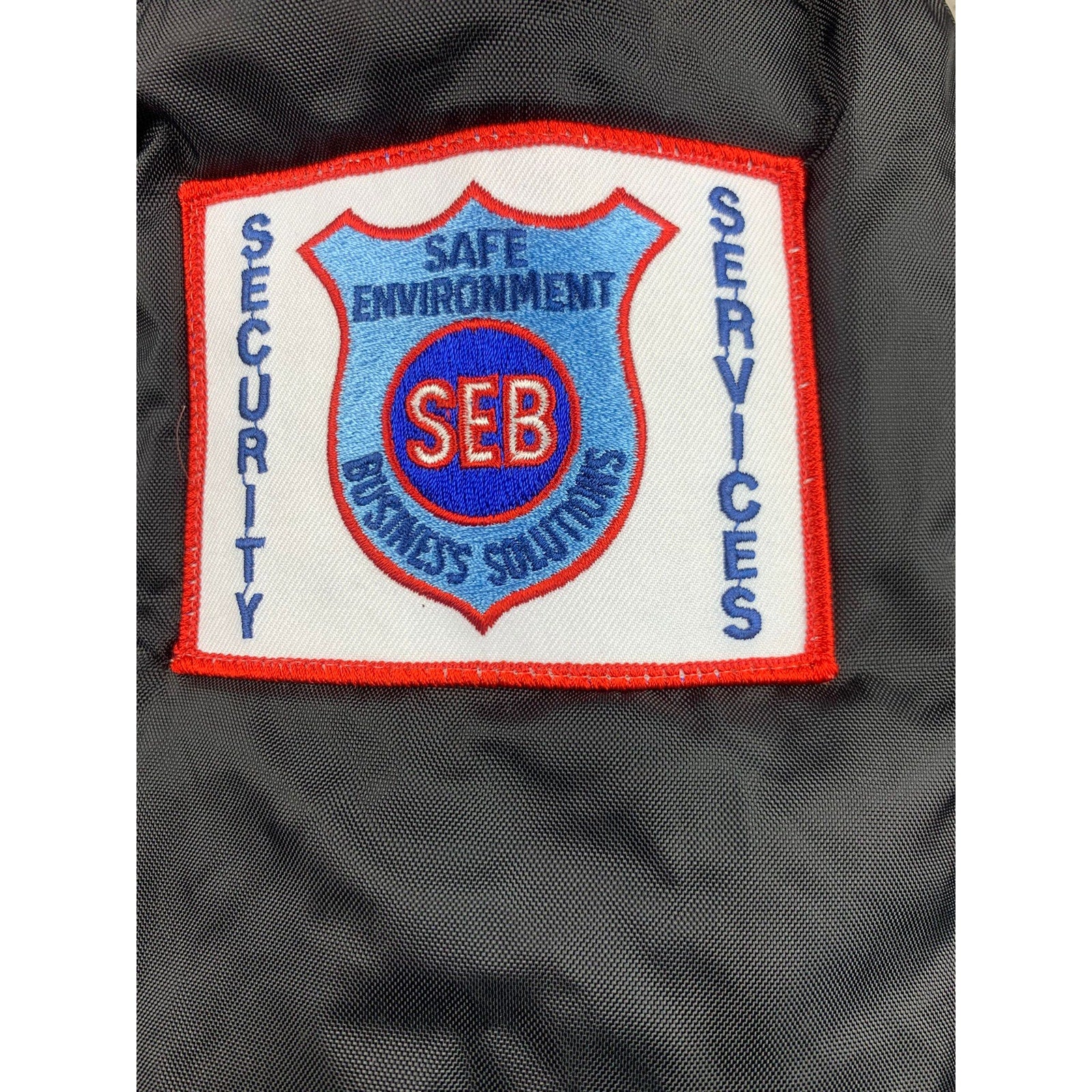 A black security-style puffer jacket by National Patrol. The coat features a waterproof nylon shell, insulated polyester padding, and a quilted design for warmth. It also includes practical utility elements like a hood, multiple pockets, and a storm flap over the zipper.