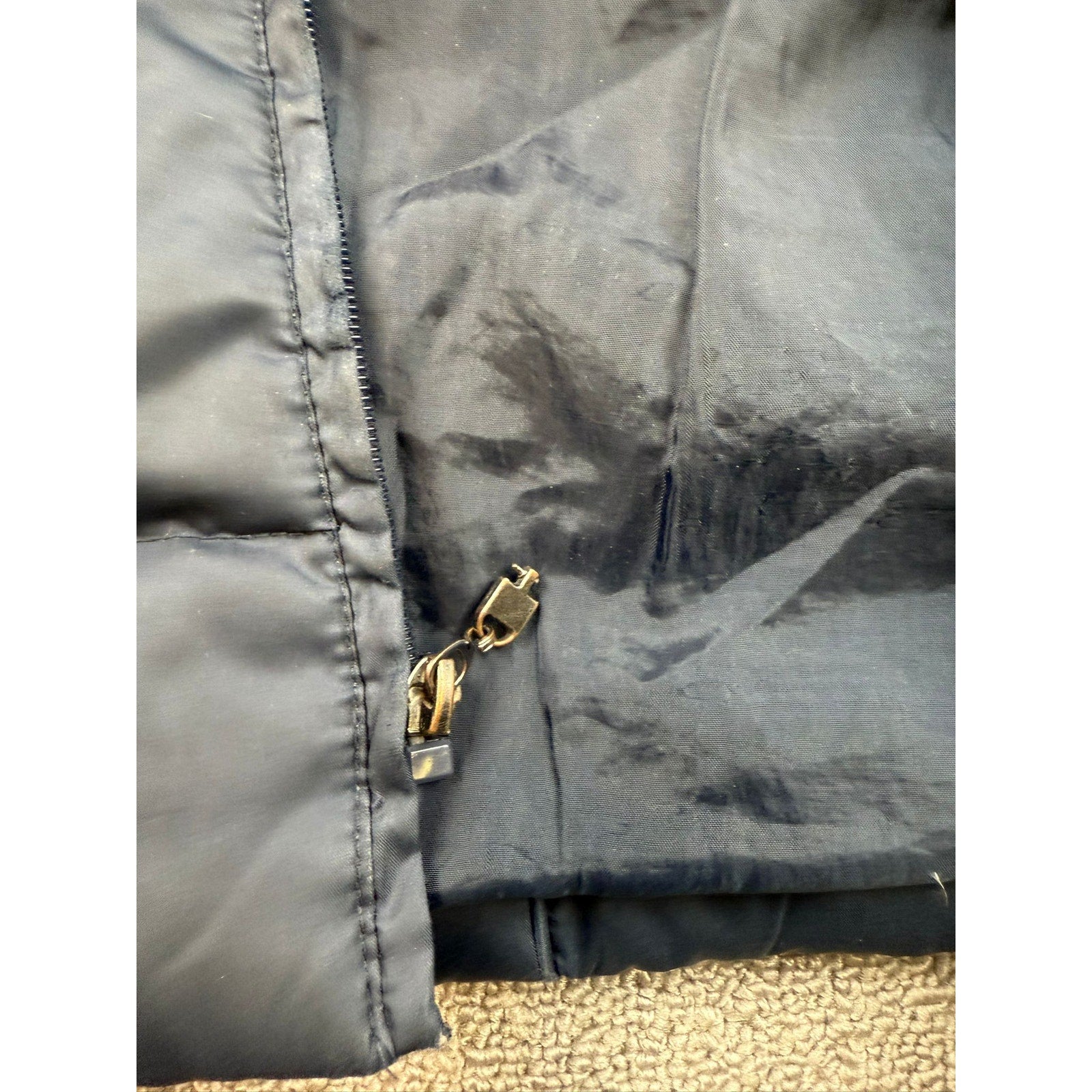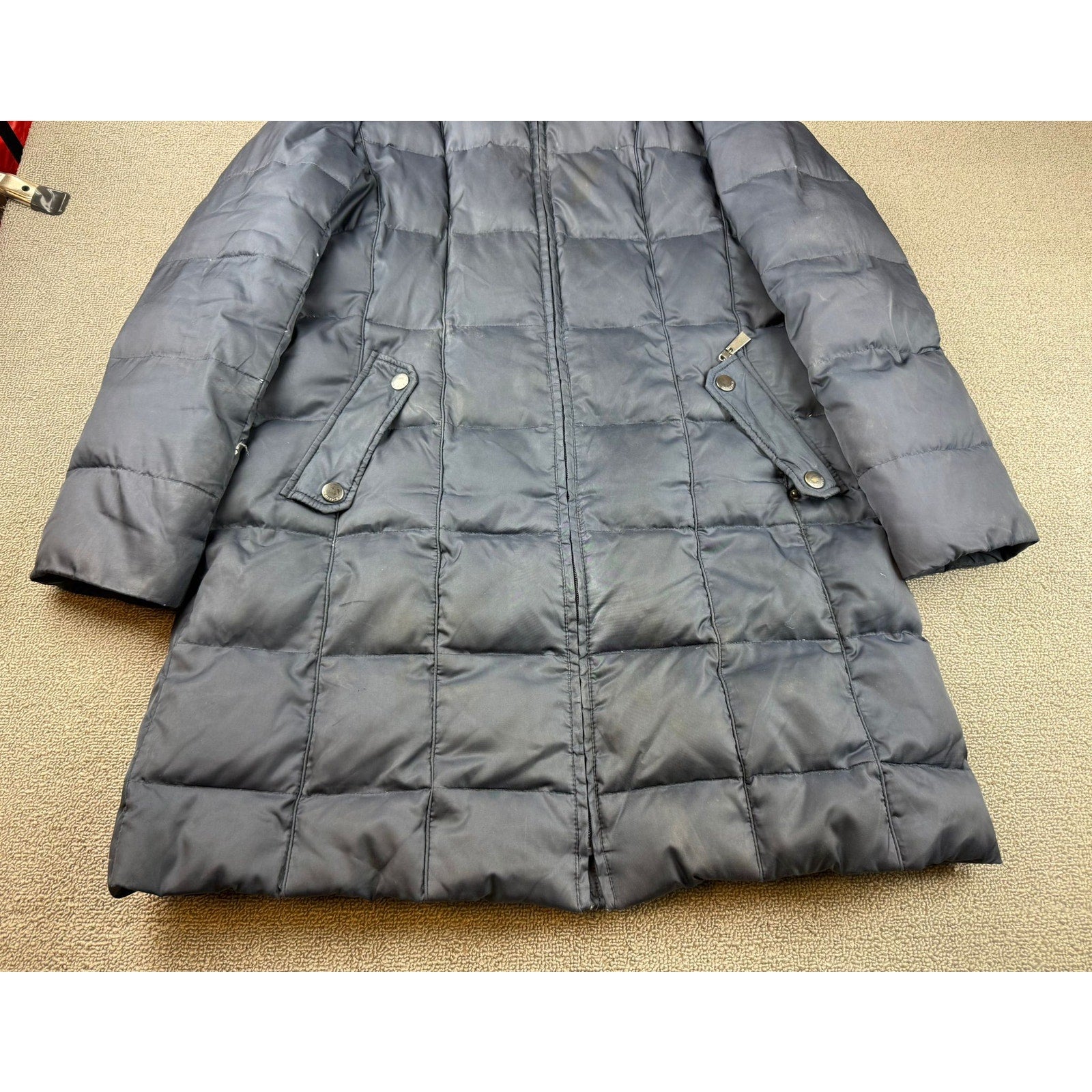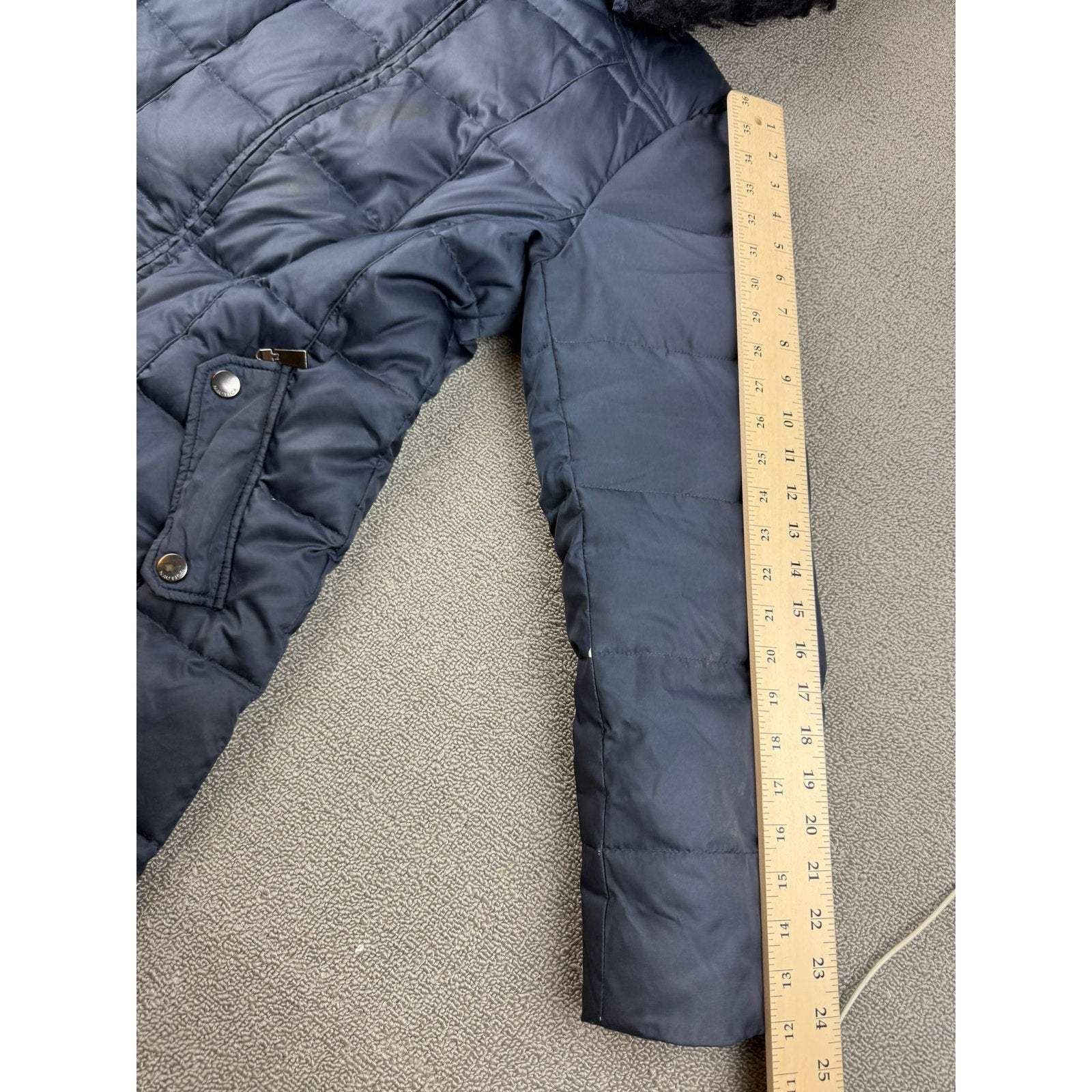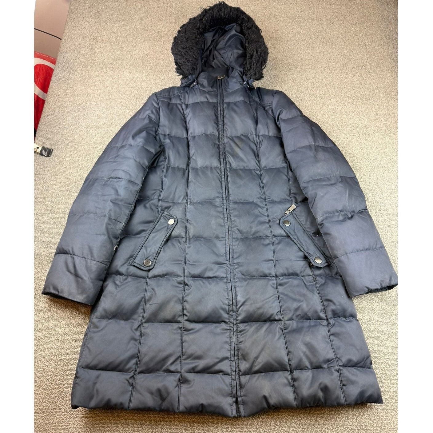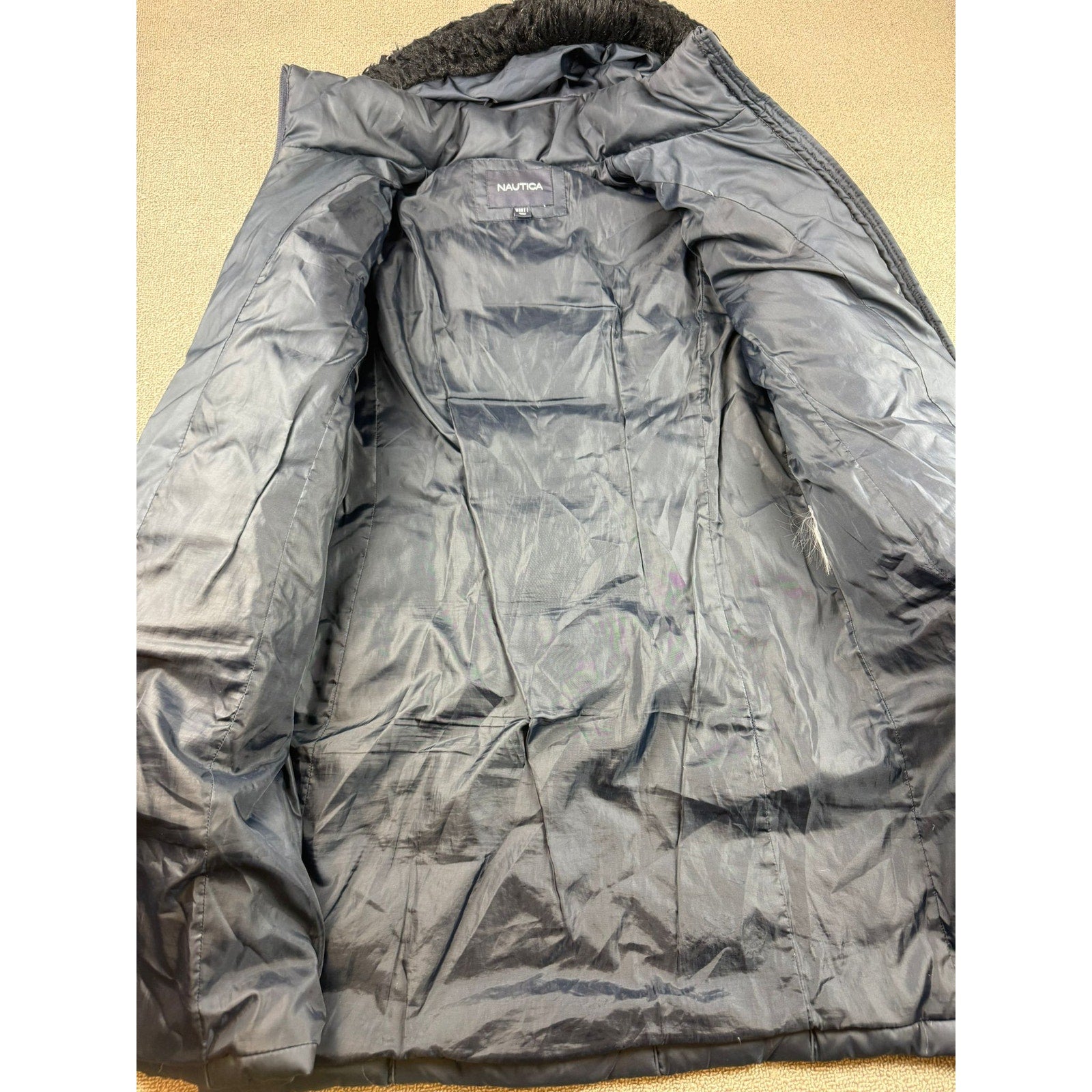 A warm and stylish navy quilted coat by Nautica, featuring a faux-fur trimmed hood, full-length insulated design, and flattering vertical quilting—perfect for everyday winter wear with a cozy, cold-weather-friendly silhouette. The pocket zipper is broken.