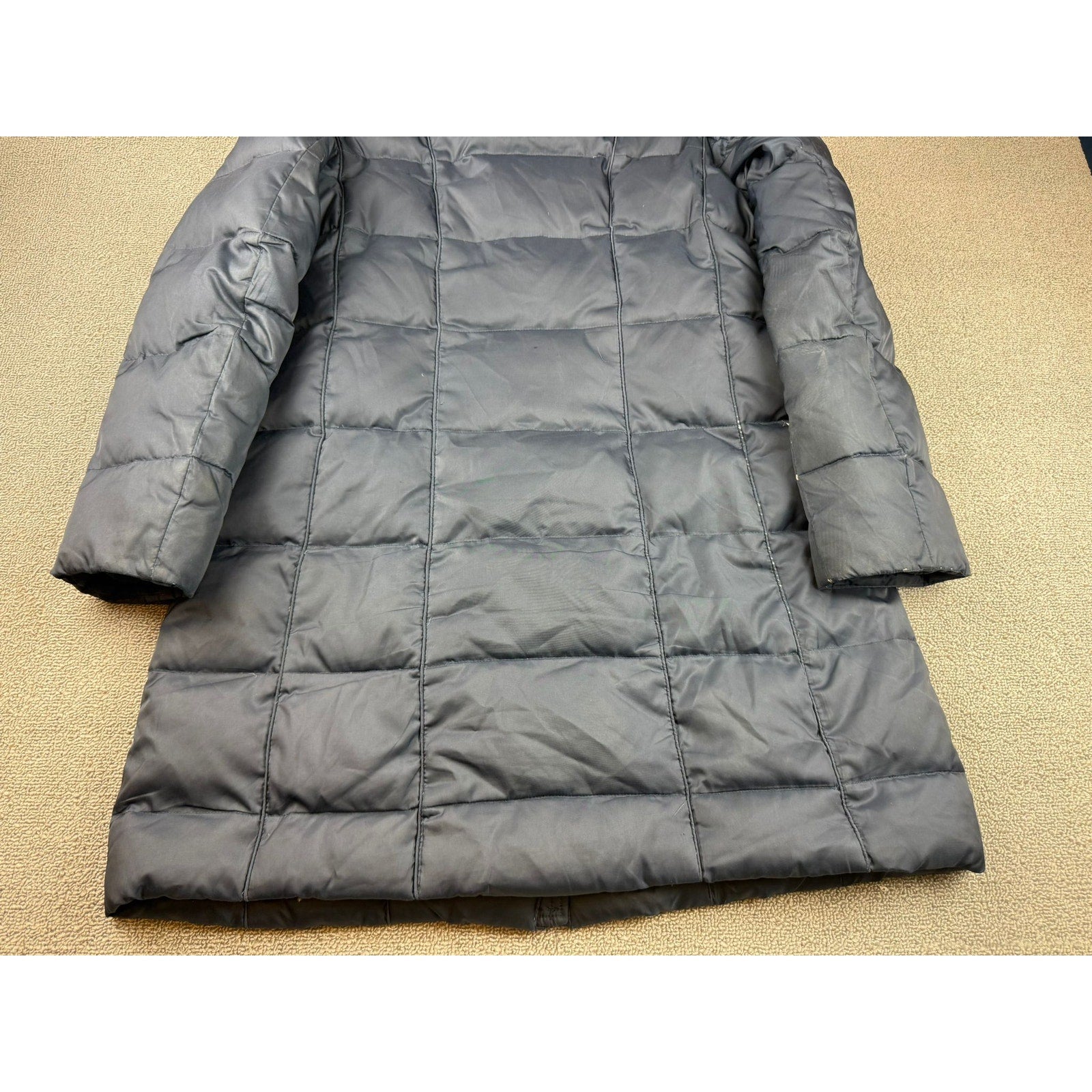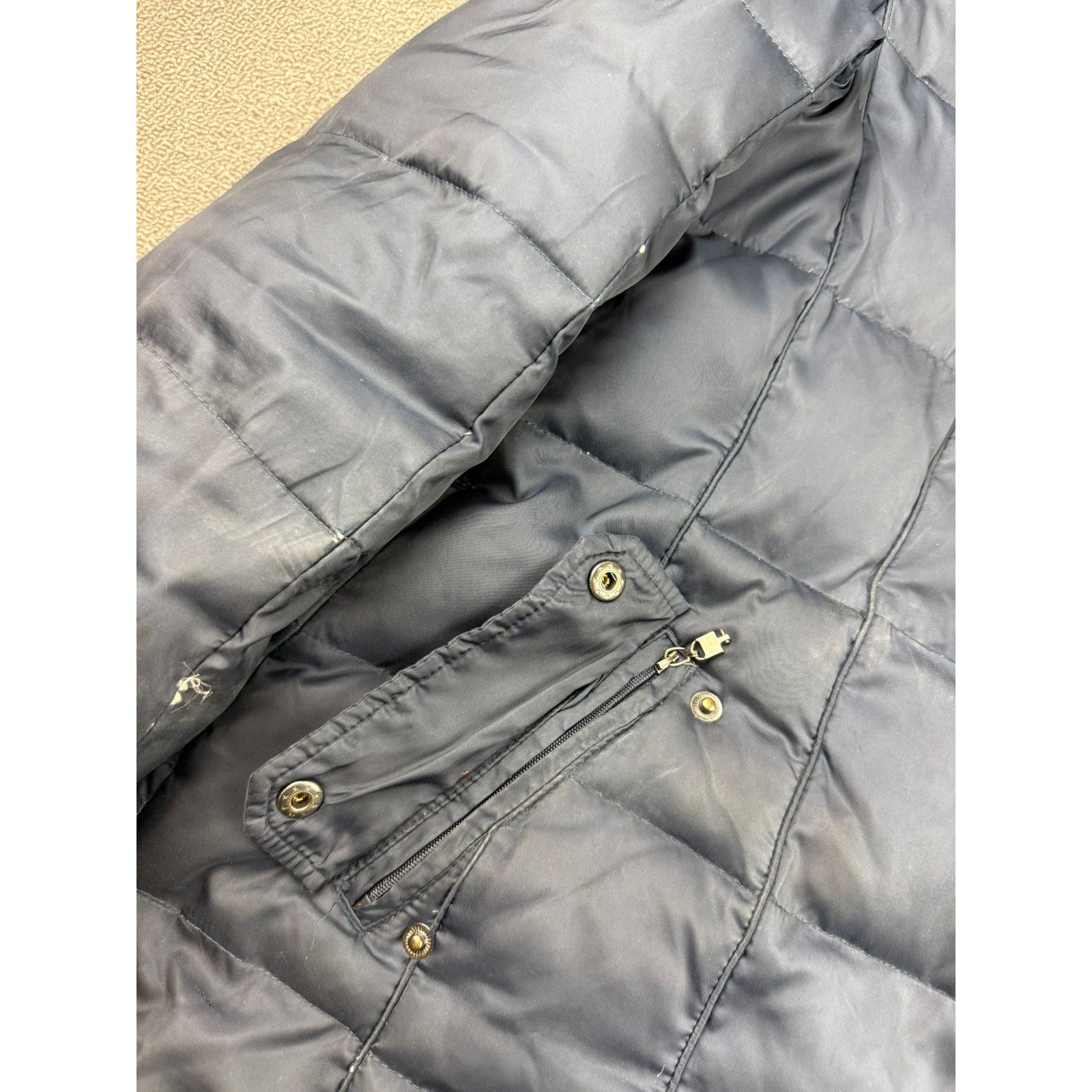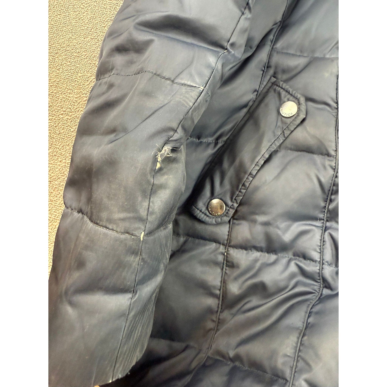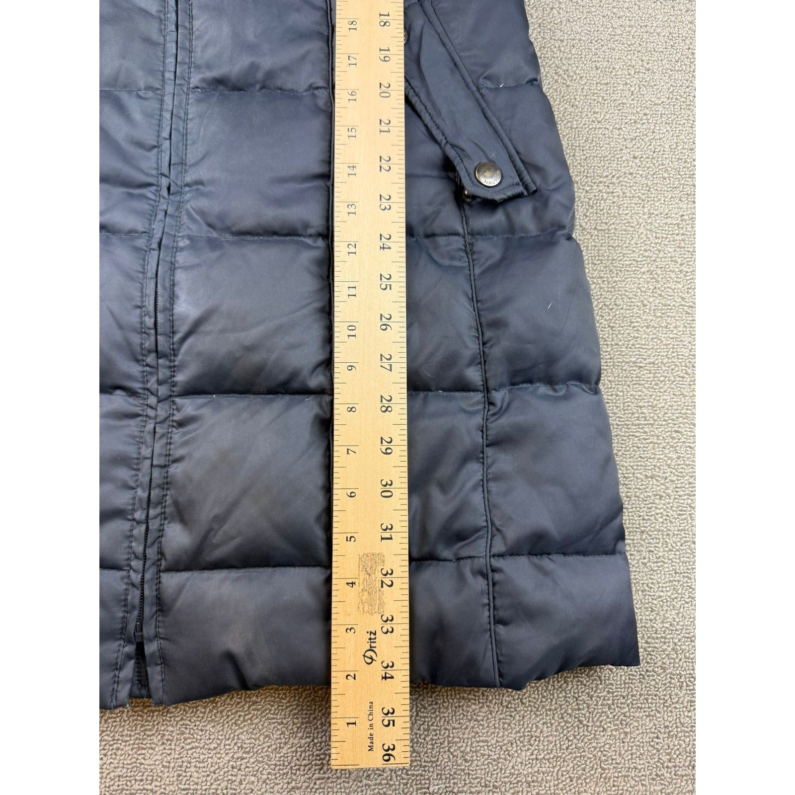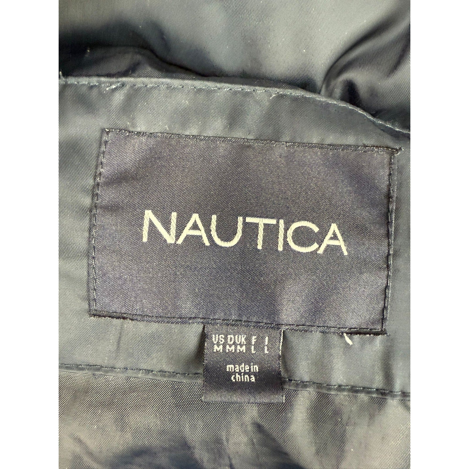 A warm and stylish navy quilted coat by Nautica, featuring a faux-fur trimmed hood, full-length insulated design, and flattering vertical quilting—perfect for everyday winter wear with a cozy, cold-weather-friendly silhouette. The pocket zipper is broken.