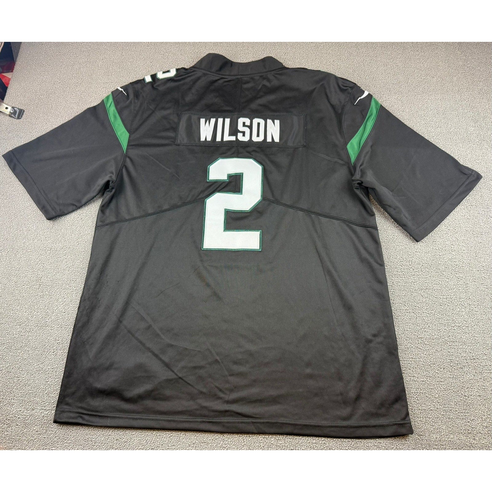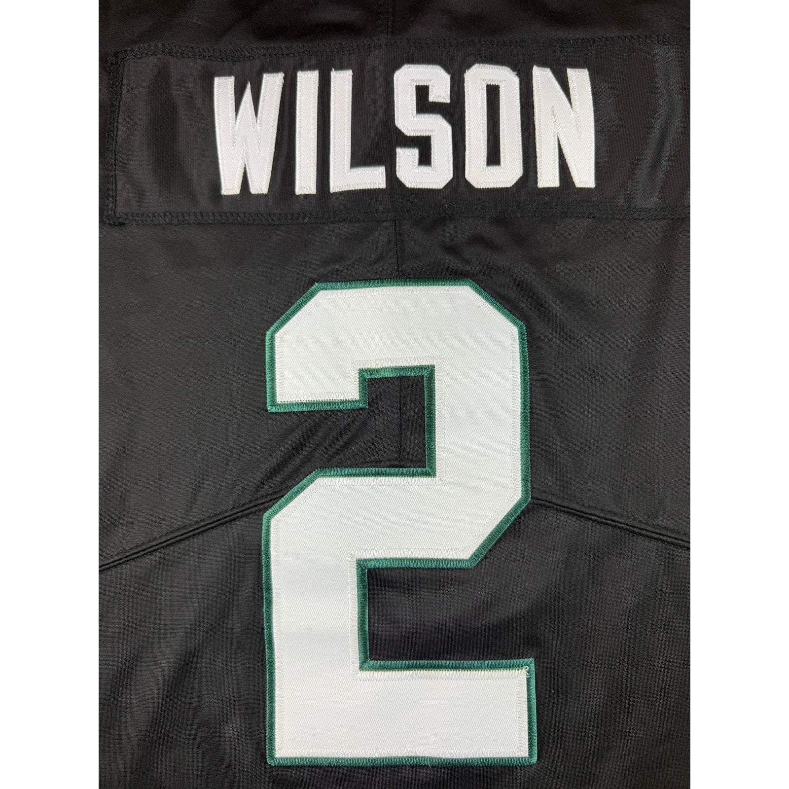 Men’s Nike New York Jets Zach Wilson #2 black alternate football jersey. Classic Jets green/white accents, screen-printed nameplate and numbers, breathable poly mesh, short sleeves, crew neck, full team wordmark/shoulder details. Great everyday fan jersey