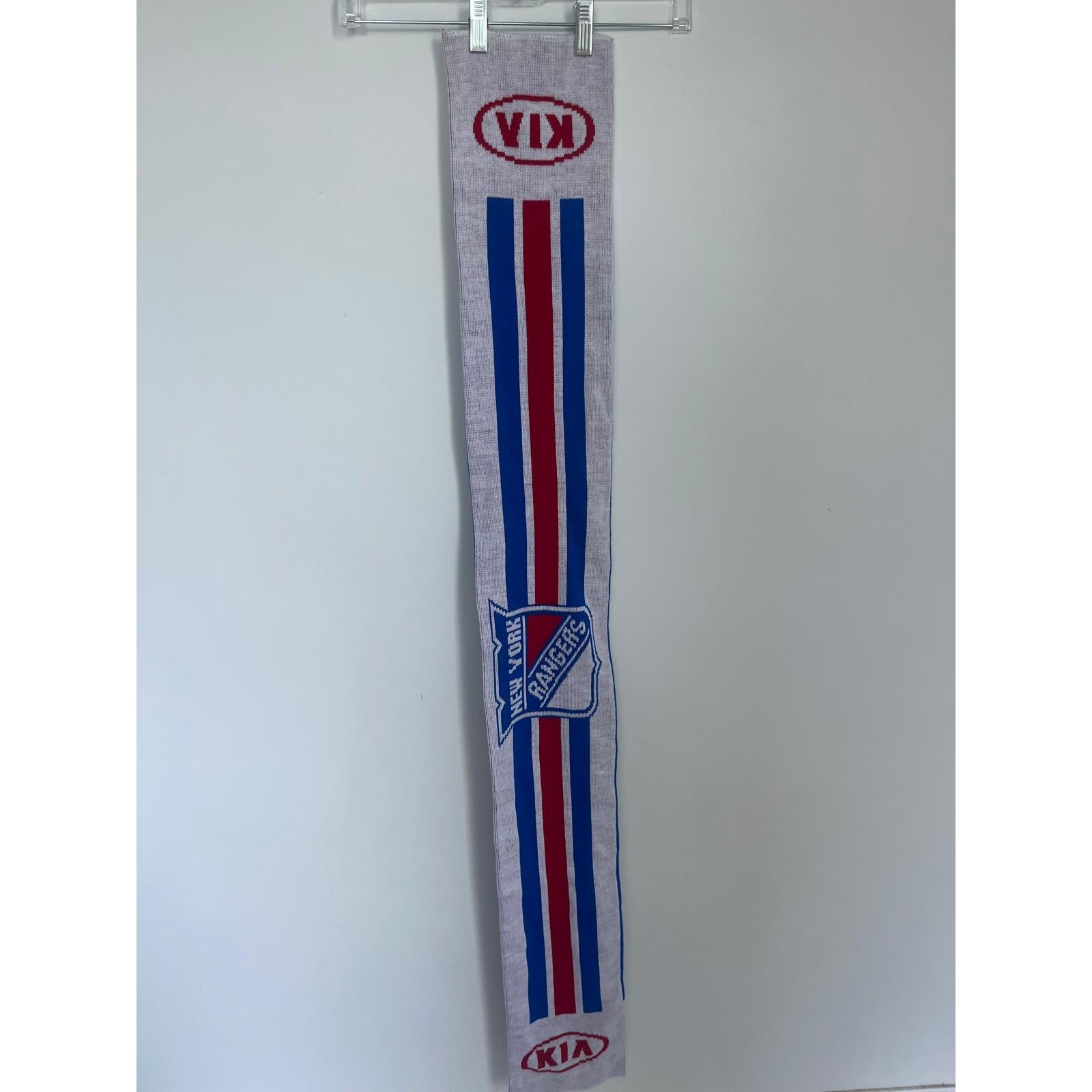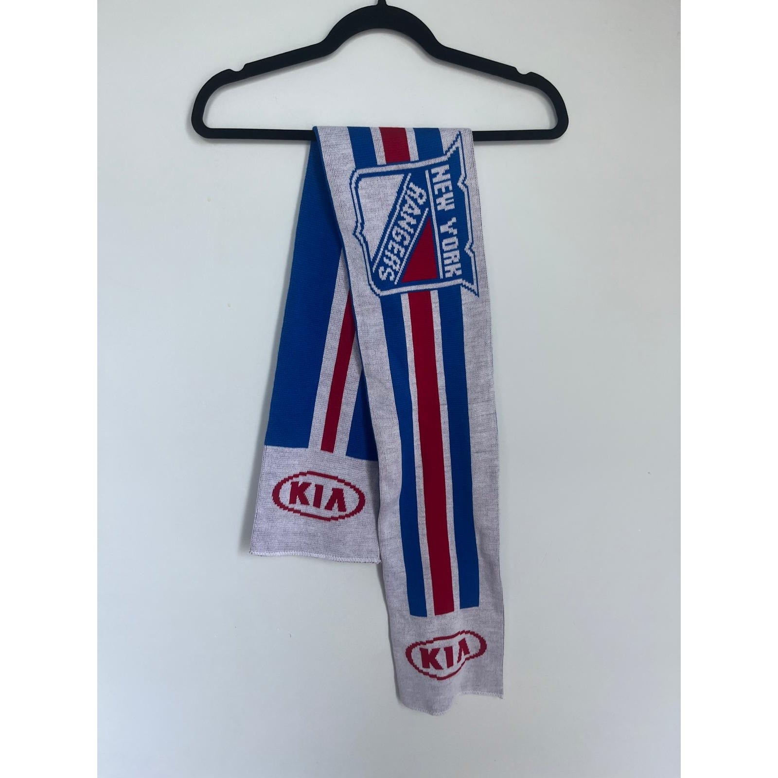 Knit promotional scarf featuring New York Rangers logo with red, white, and blue vertical stripes. Includes KIA sponsor branding at both ends. Warm and soft fan gear for hockey season.
