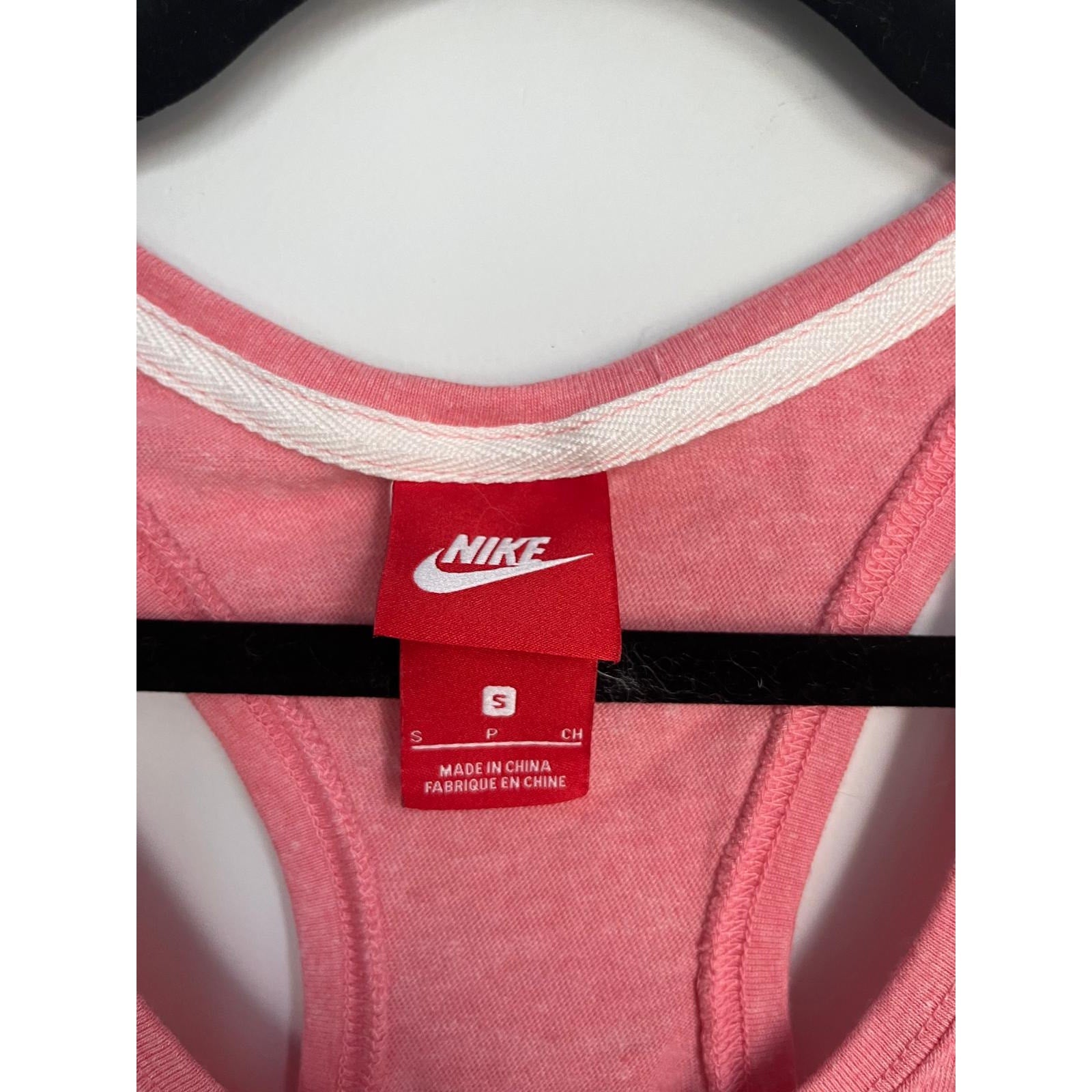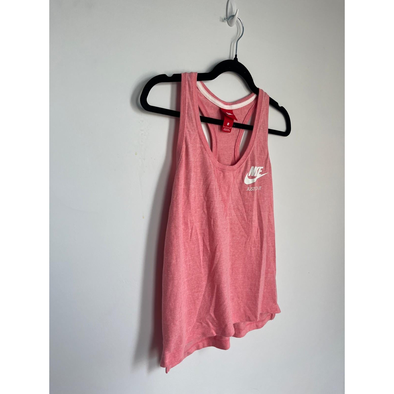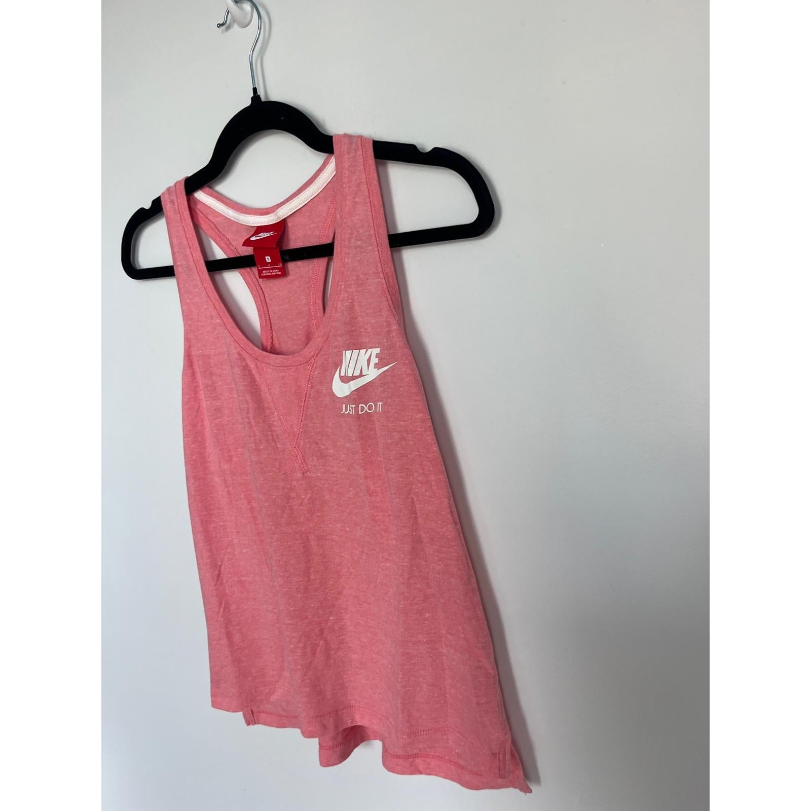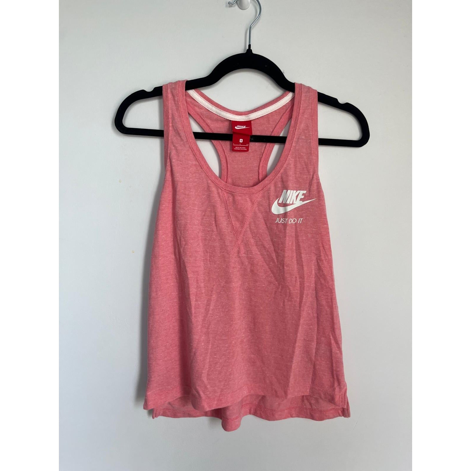 Lightweight pink racerback tank top with white "Nike Just Do It" graphic on the chest. Made with soft stretch jersey, ideal for workouts or casual summer wear.