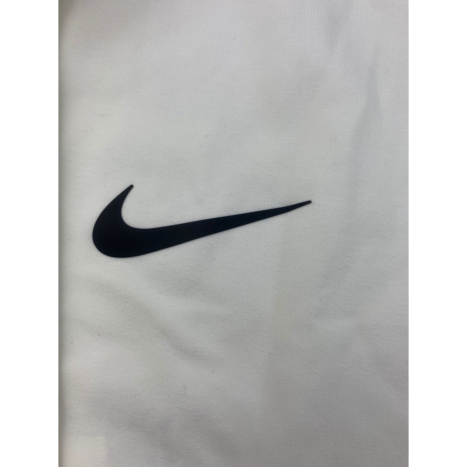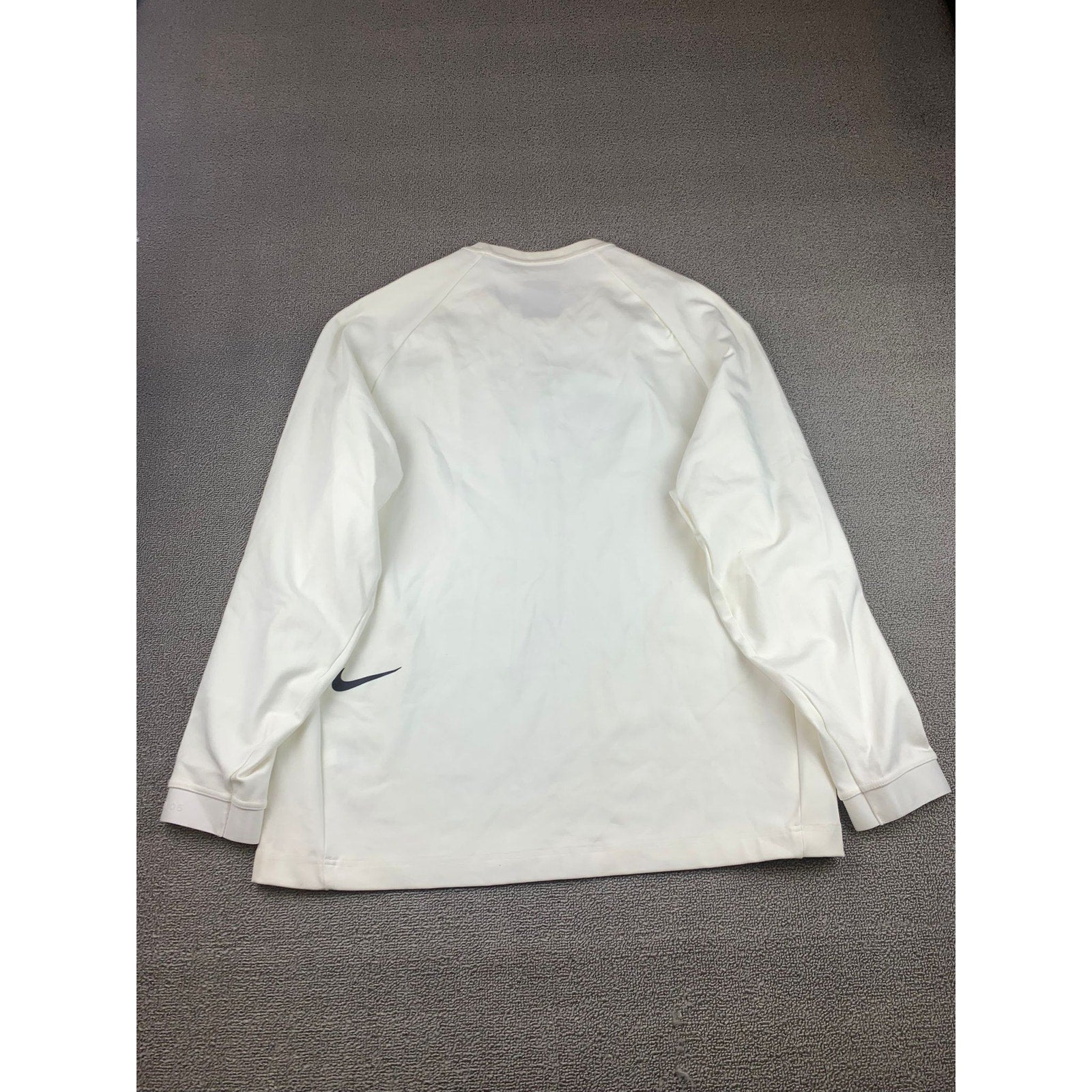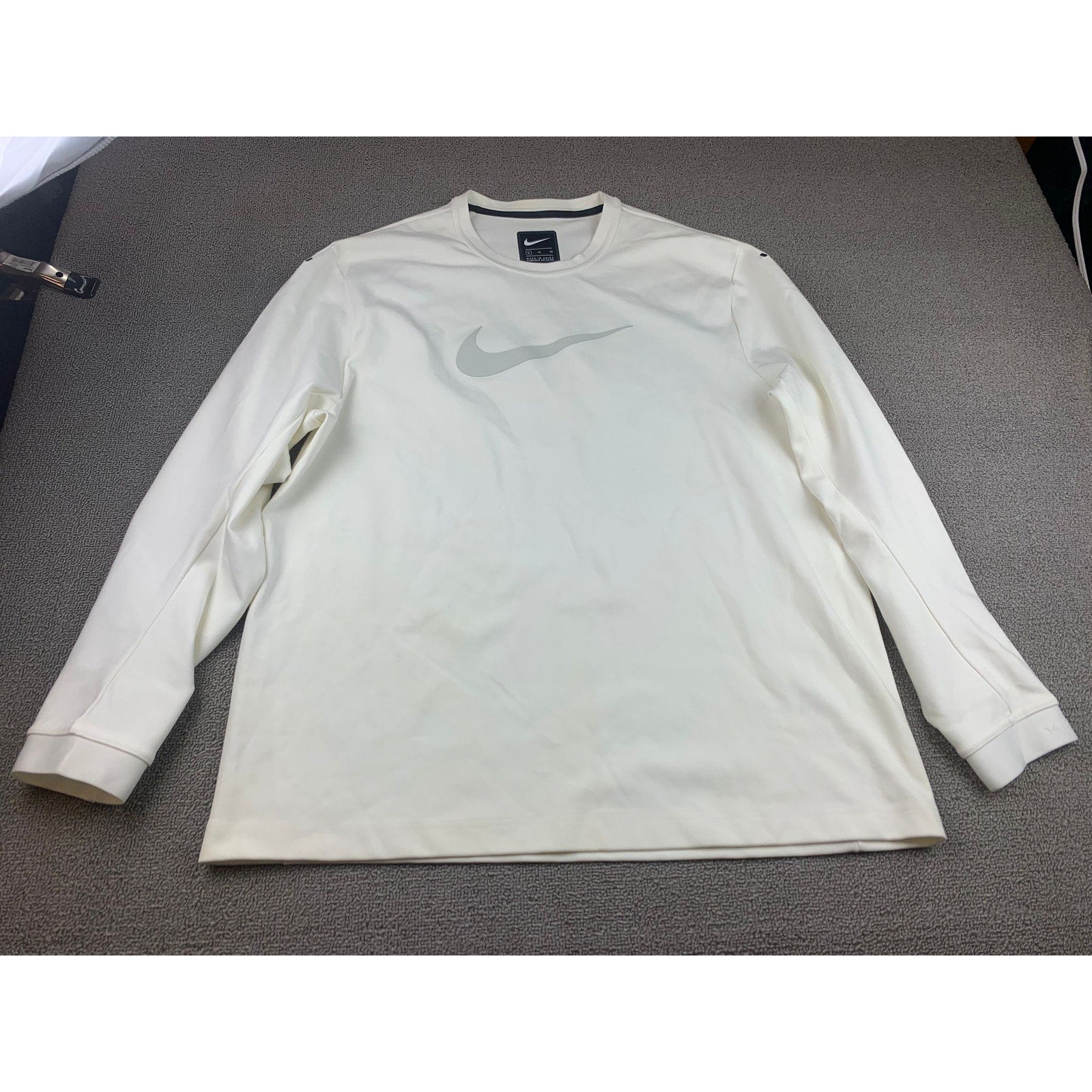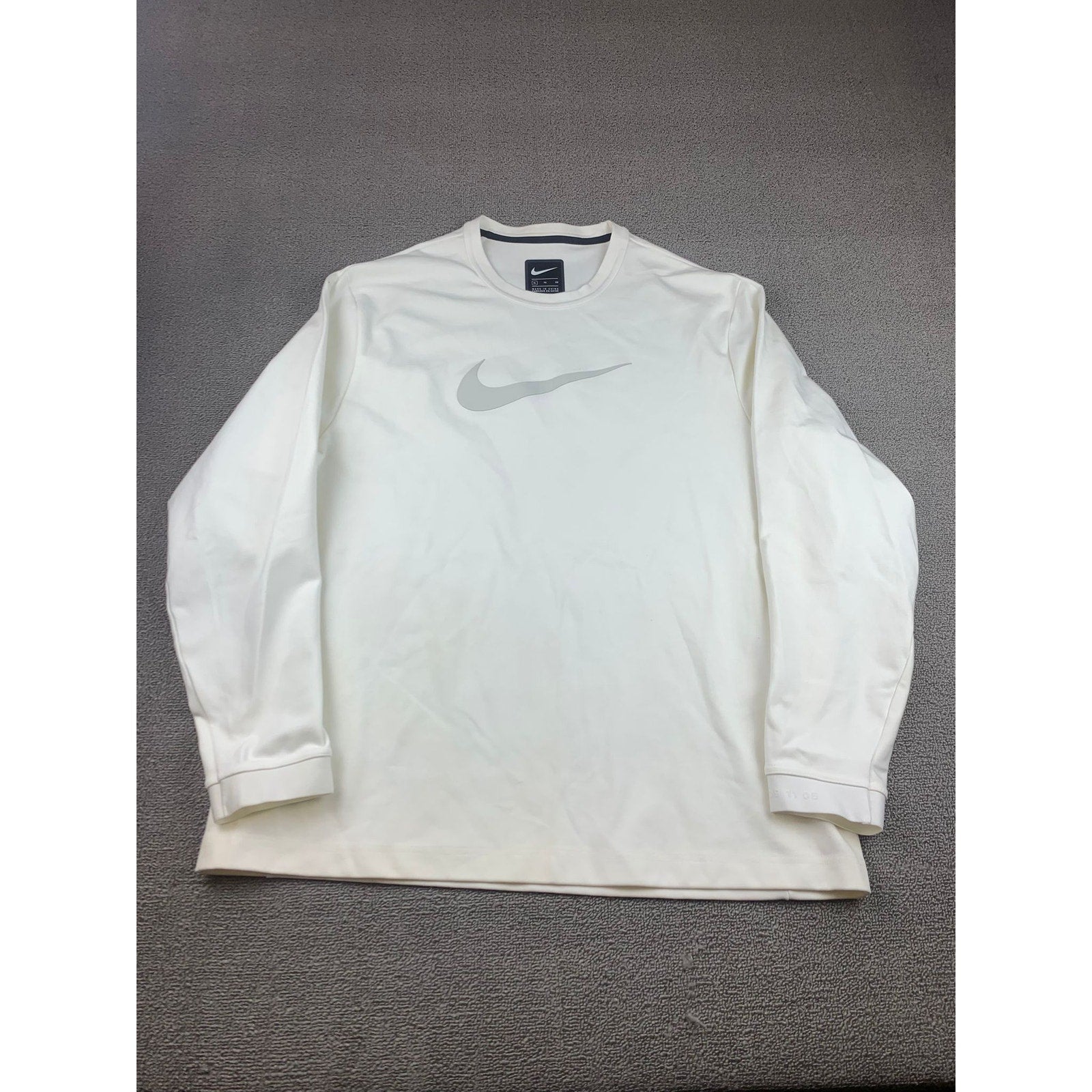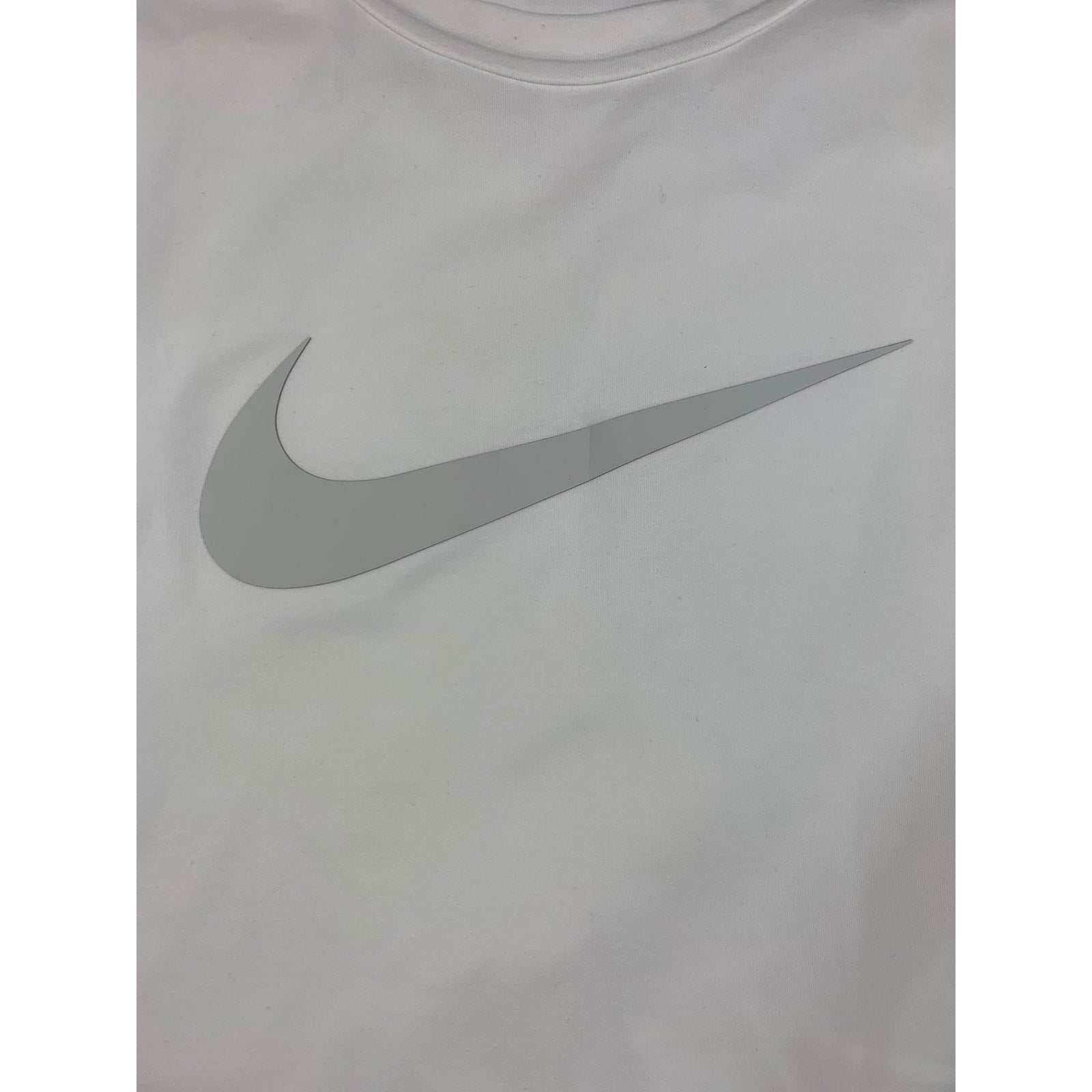 Clean white long-sleeve crew neck performance shirt featuring a subtle large reflective Nike Swoosh across the chest and a “Nike XL TG EG” label at the neckline—minimalist athletic staple.