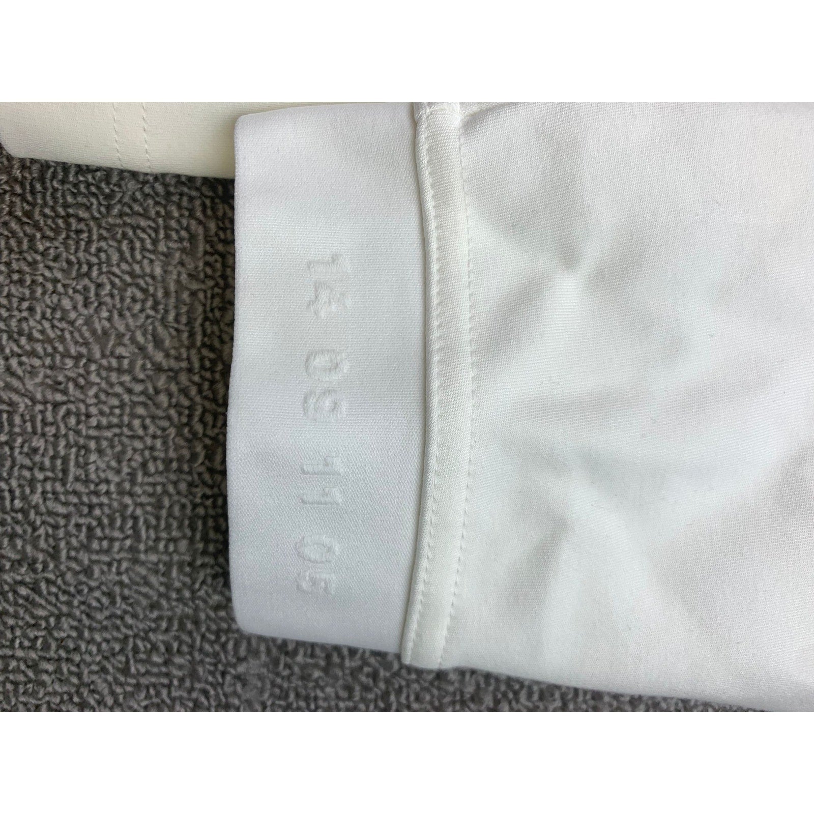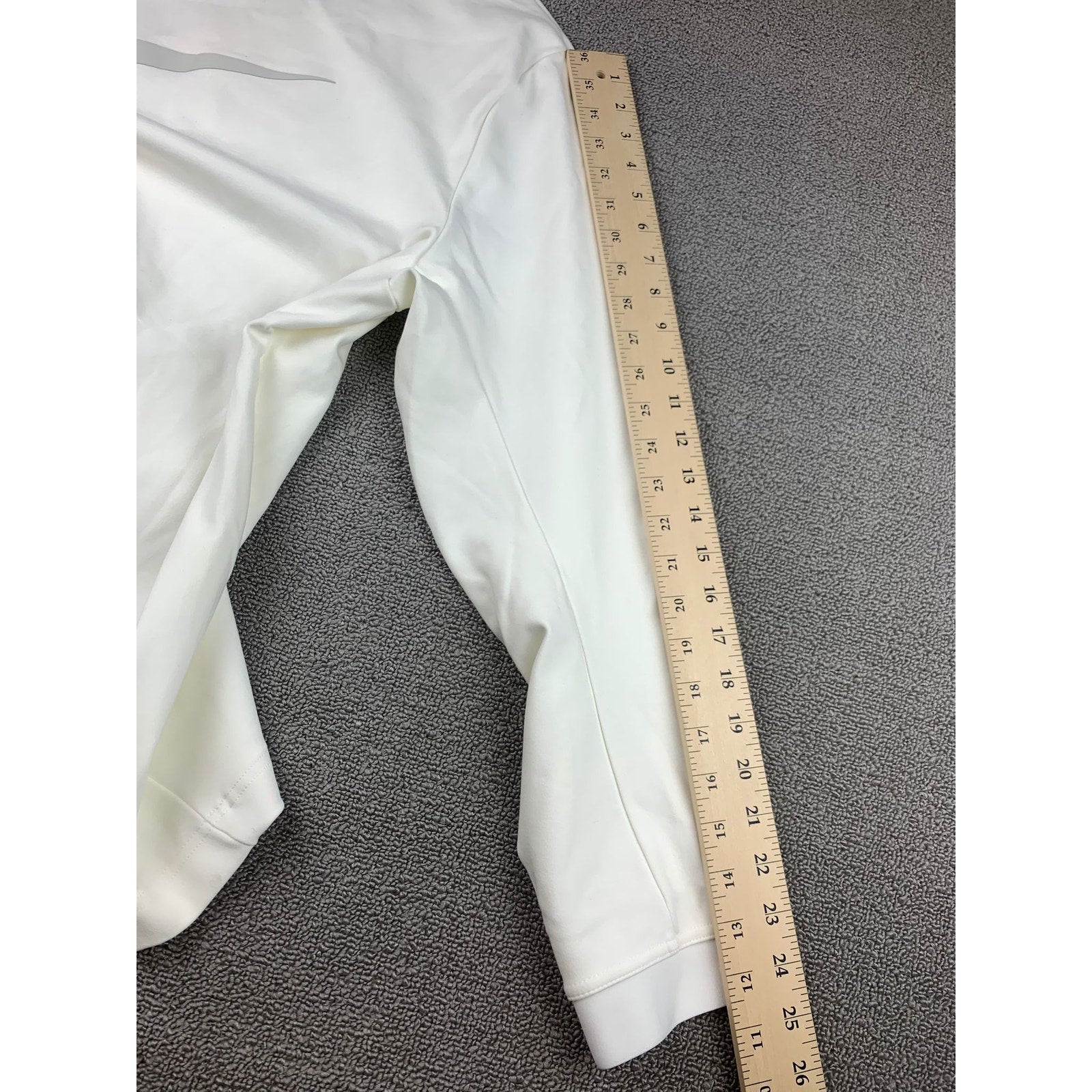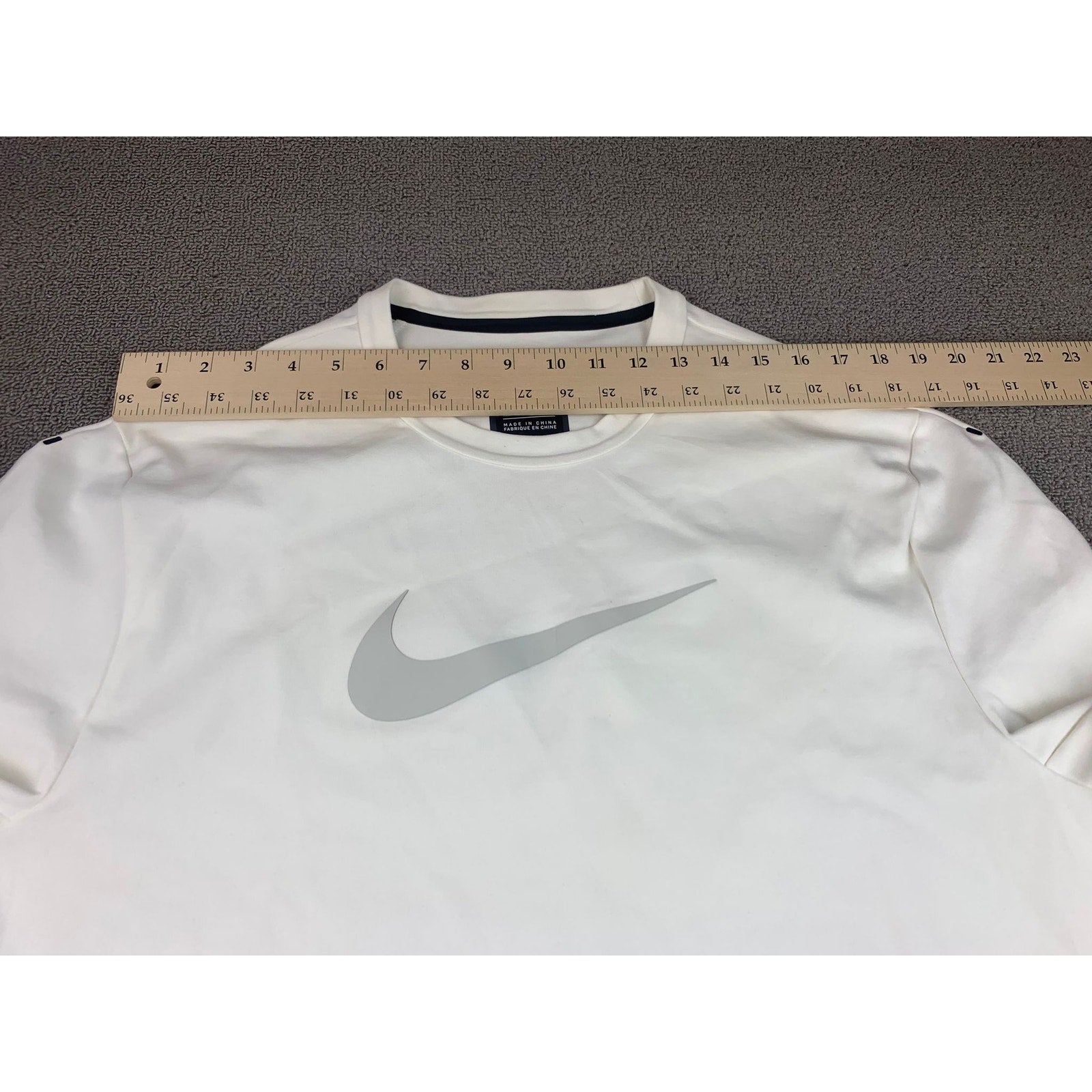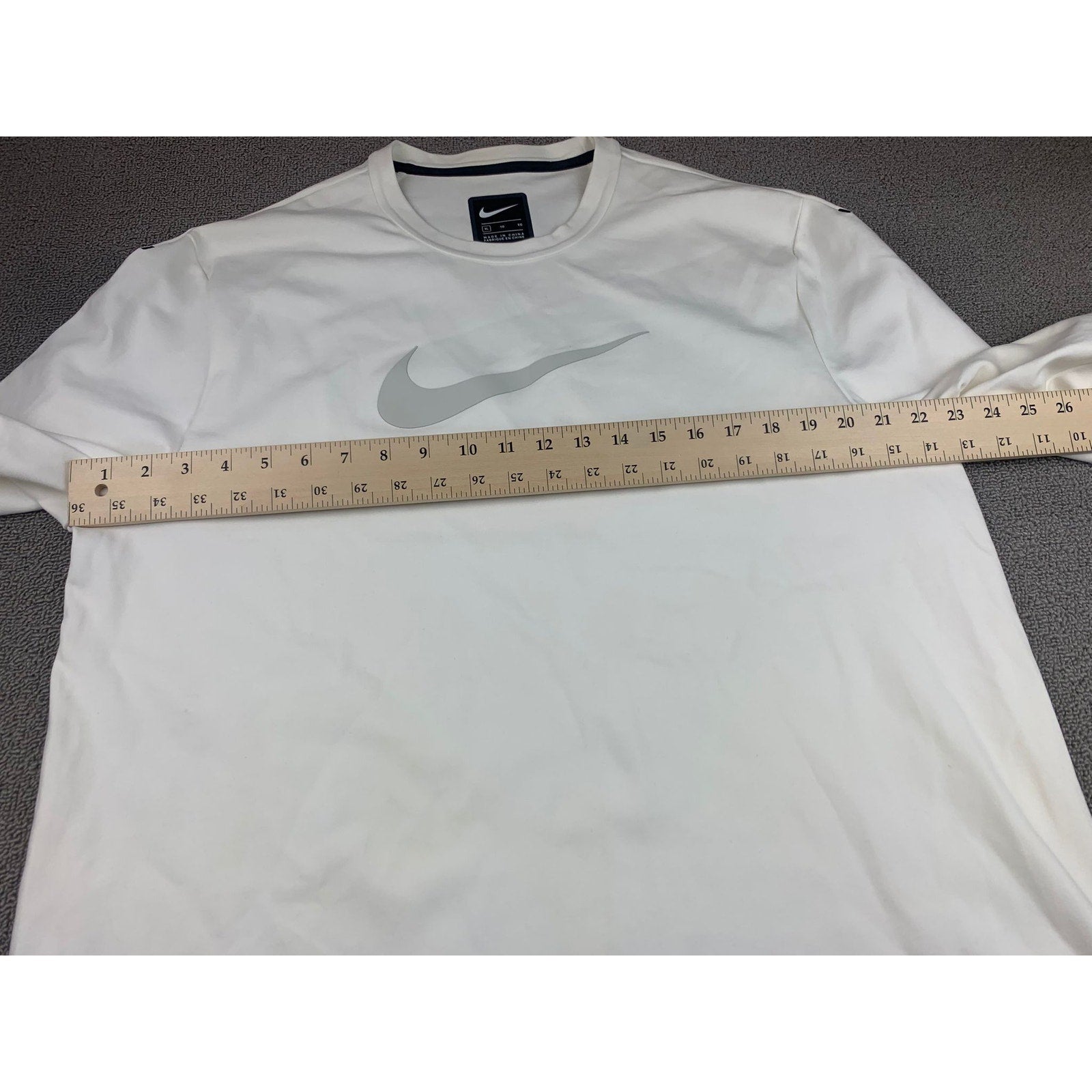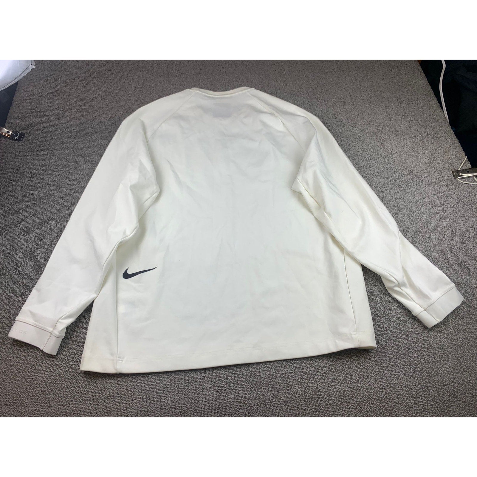 Clean white long-sleeve crew neck performance shirt featuring a subtle large reflective Nike Swoosh across the chest and a “Nike XL TG EG” label at the neckline—minimalist athletic staple.