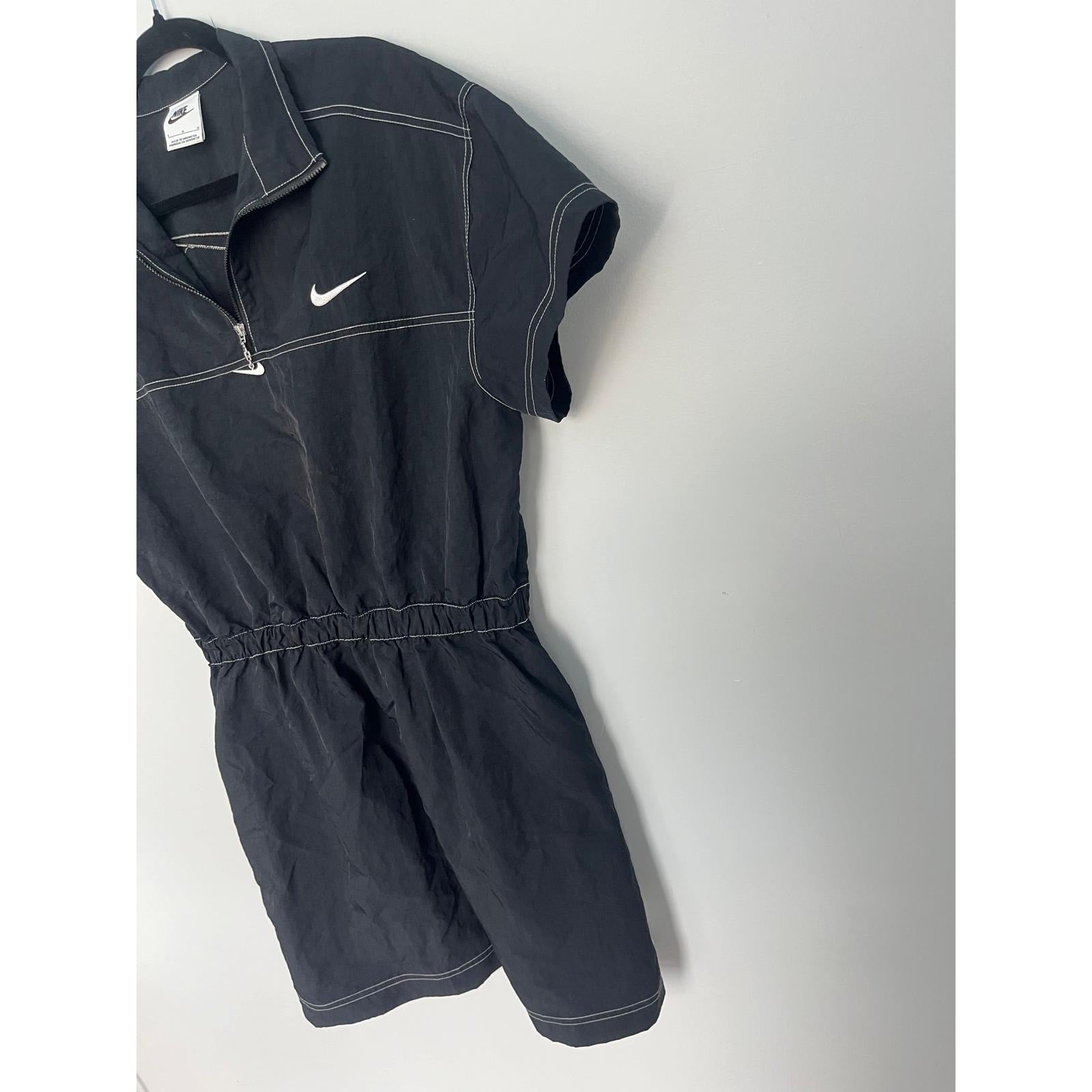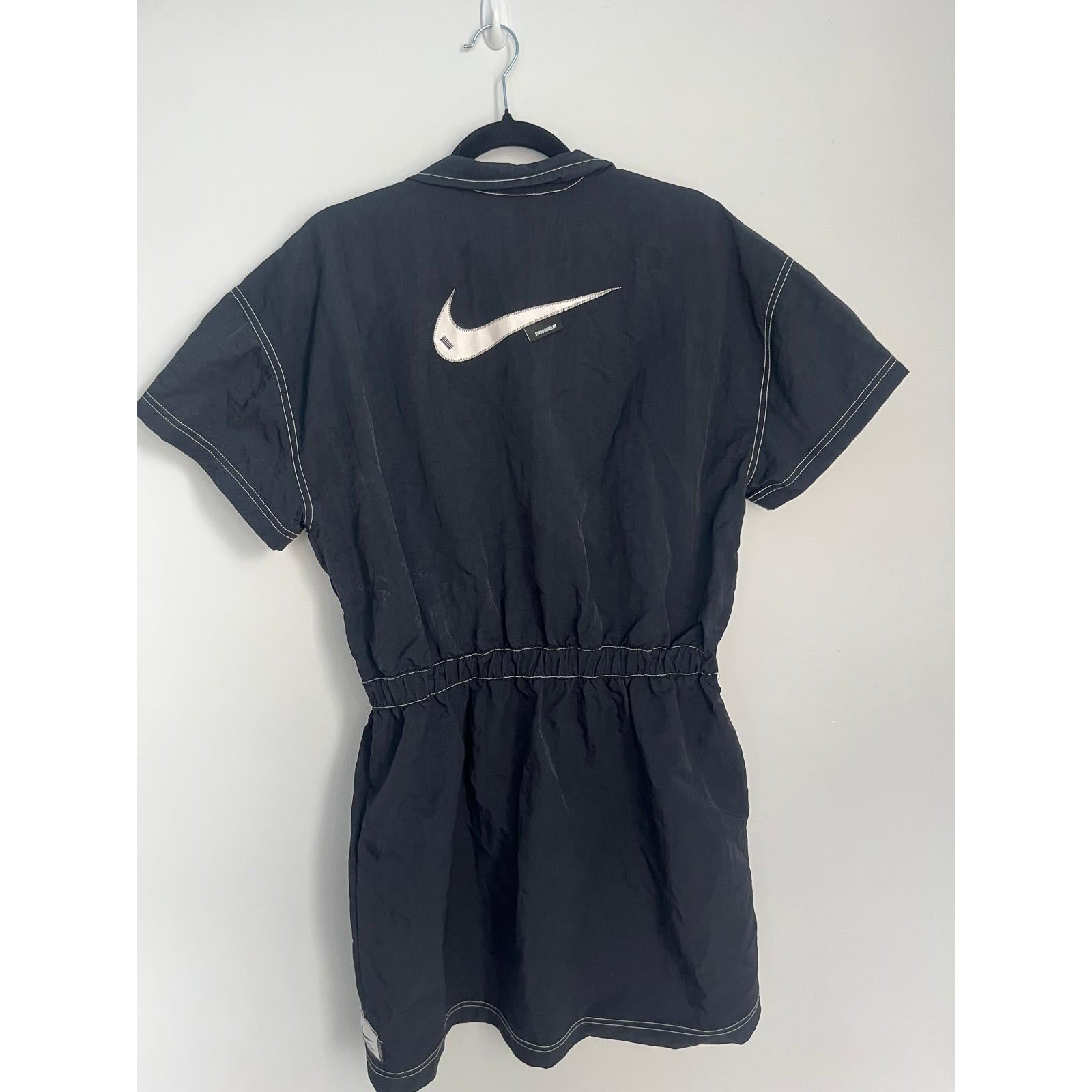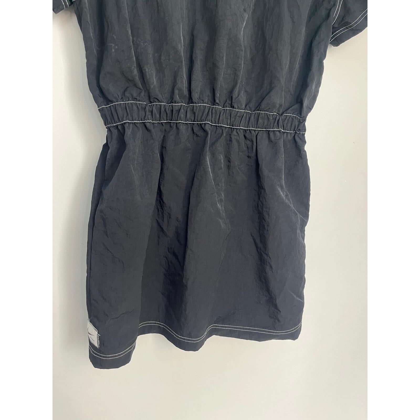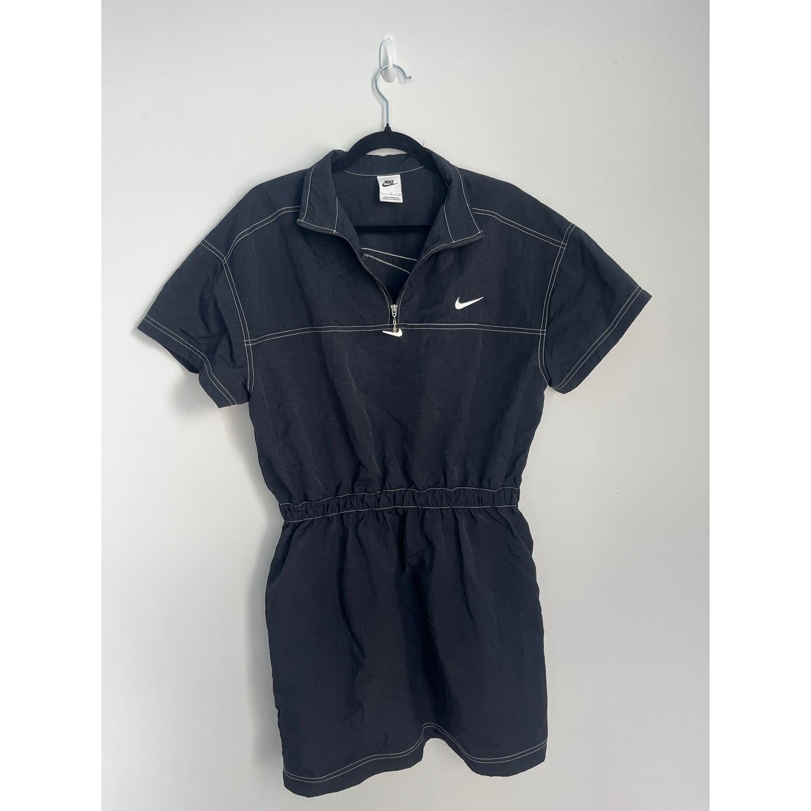 Sporty and casual Nike black mini dress featuring a quarter zip neckline, white contrast stitching, and short sleeves. Cinched elastic waist for a flattering fit.
