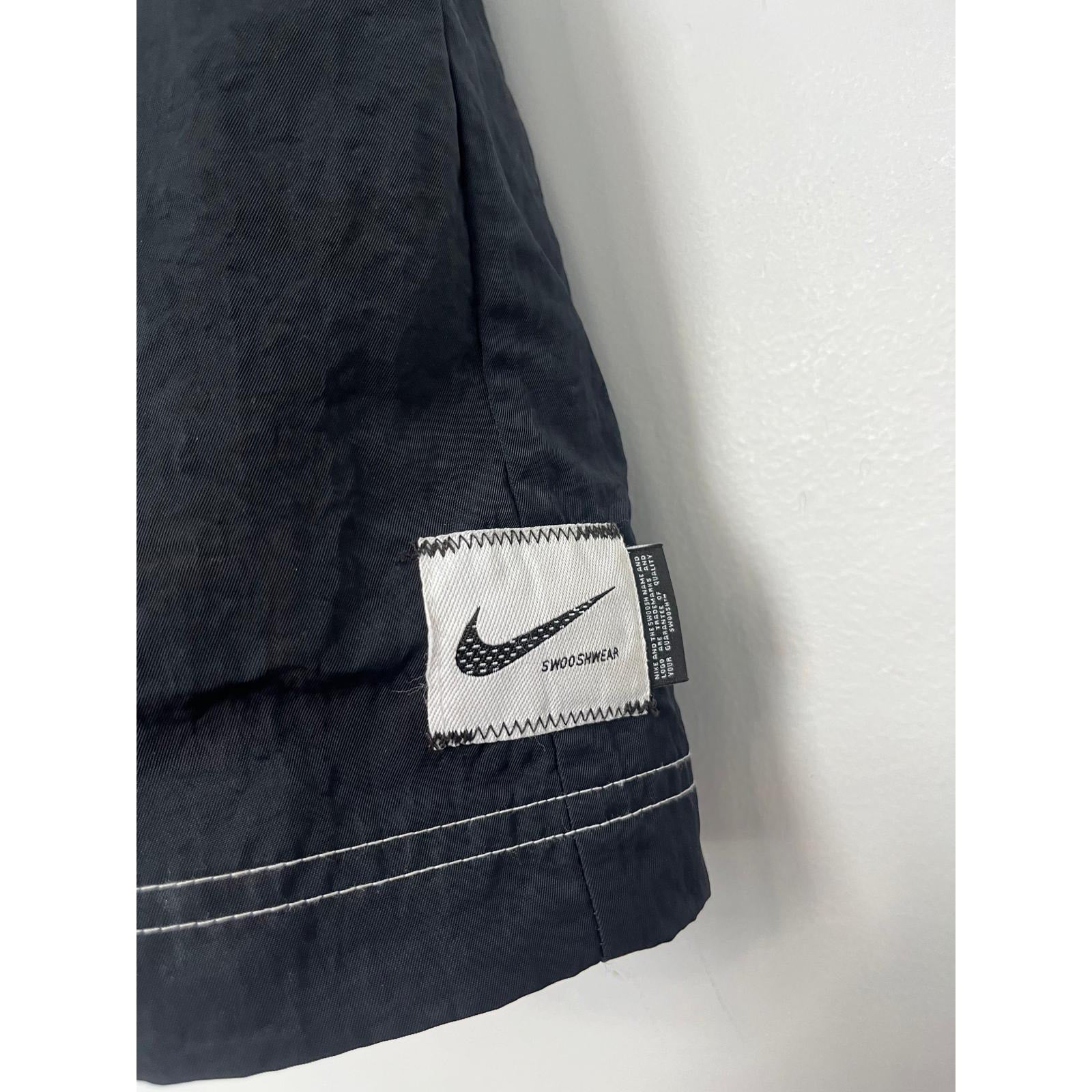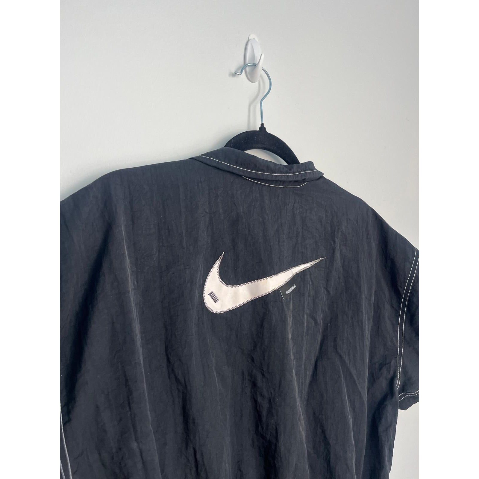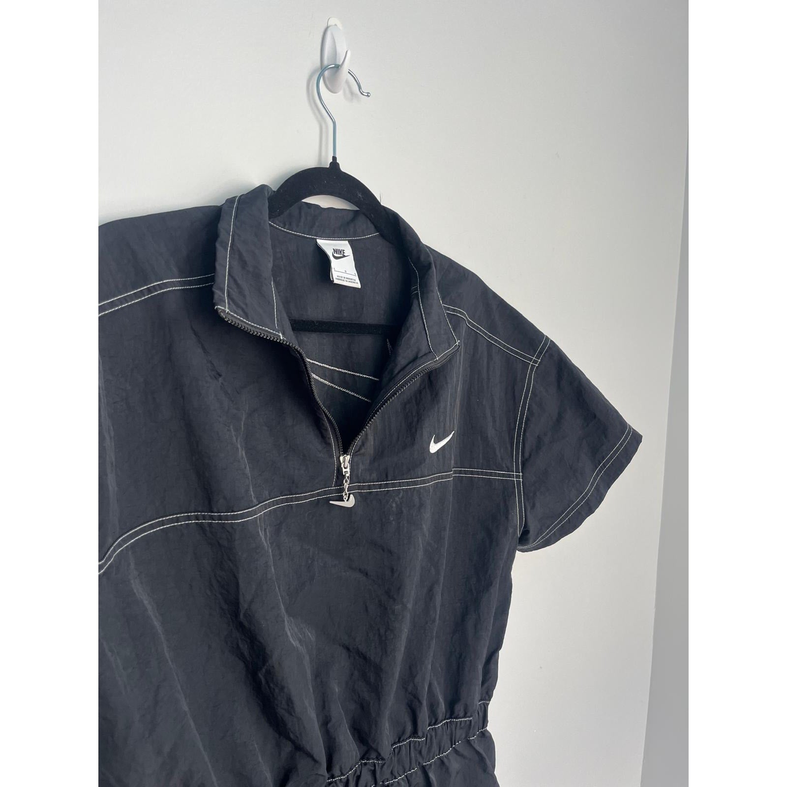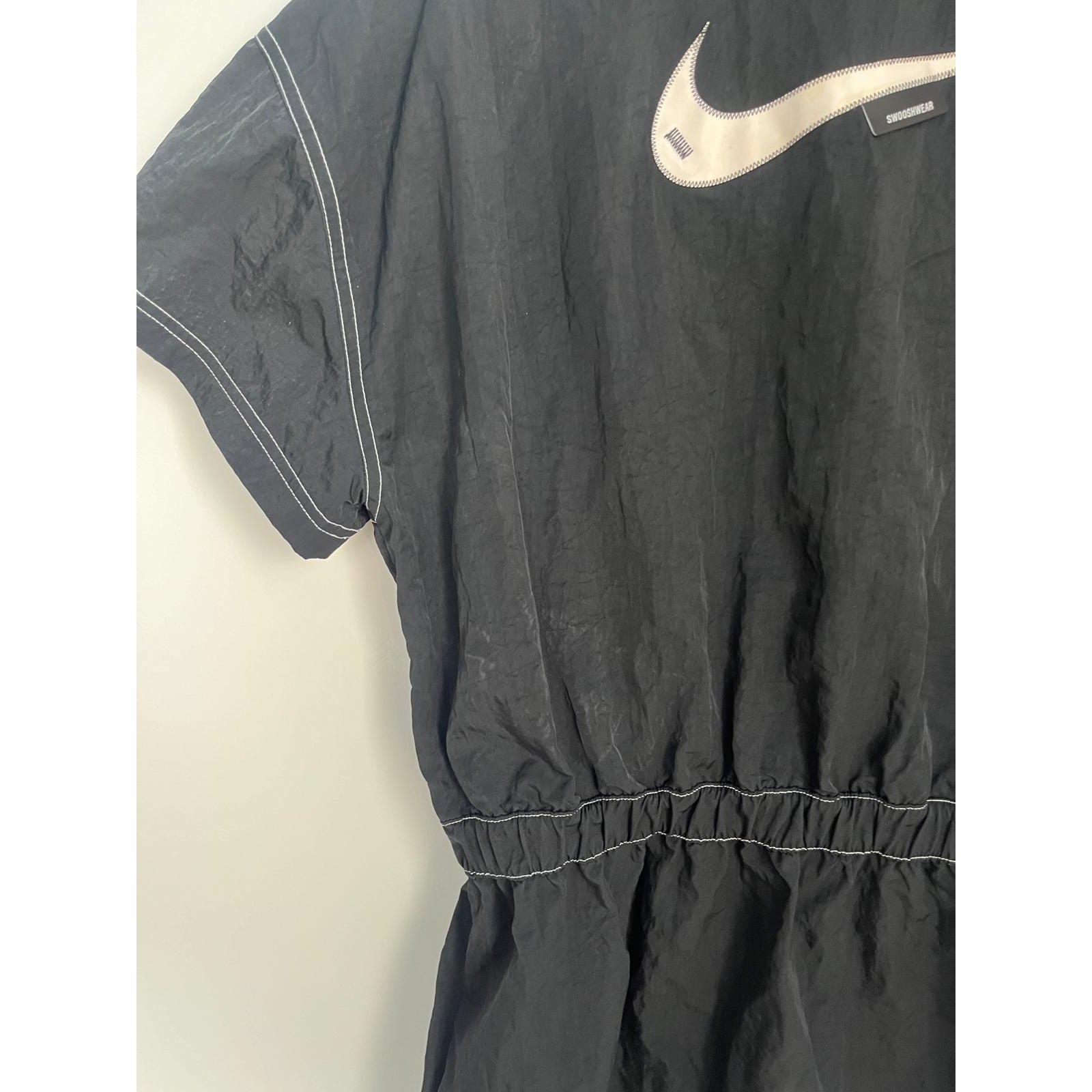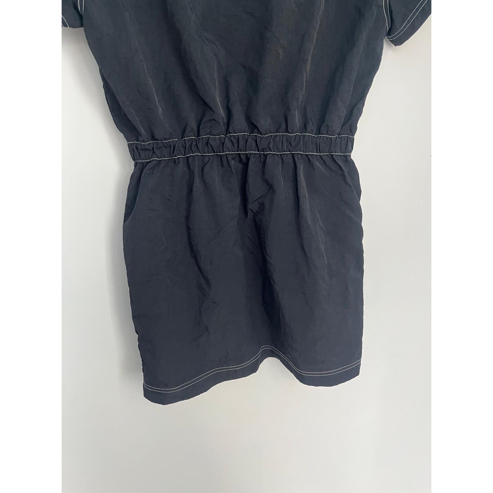 Sporty and casual Nike black mini dress featuring a quarter zip neckline, white contrast stitching, and short sleeves. Cinched elastic waist for a flattering fit.