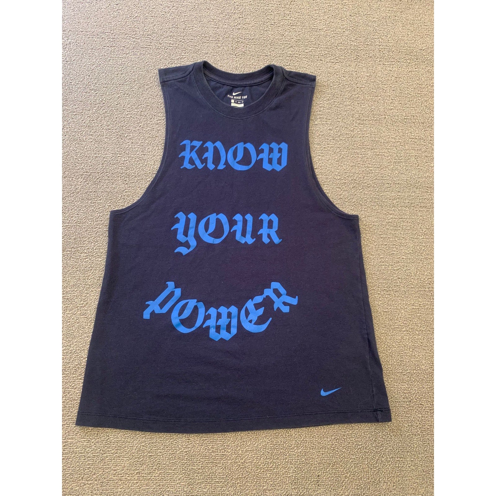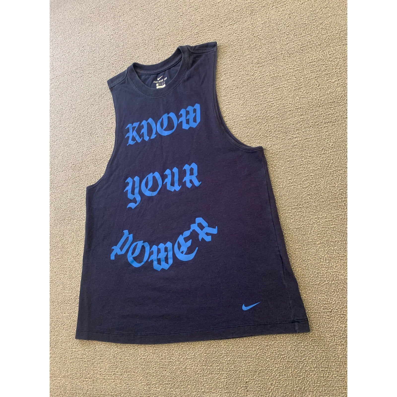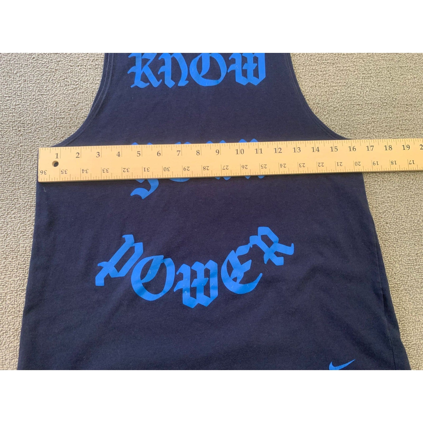Nike Dri-Fit sleeveless tank top in black with bold blue gothic-style "Know Your Power" graphic print. Features breathable moisture-wicking fabric designed for comfort and performance. Perfect for training, workouts, or casual streetwear styling.