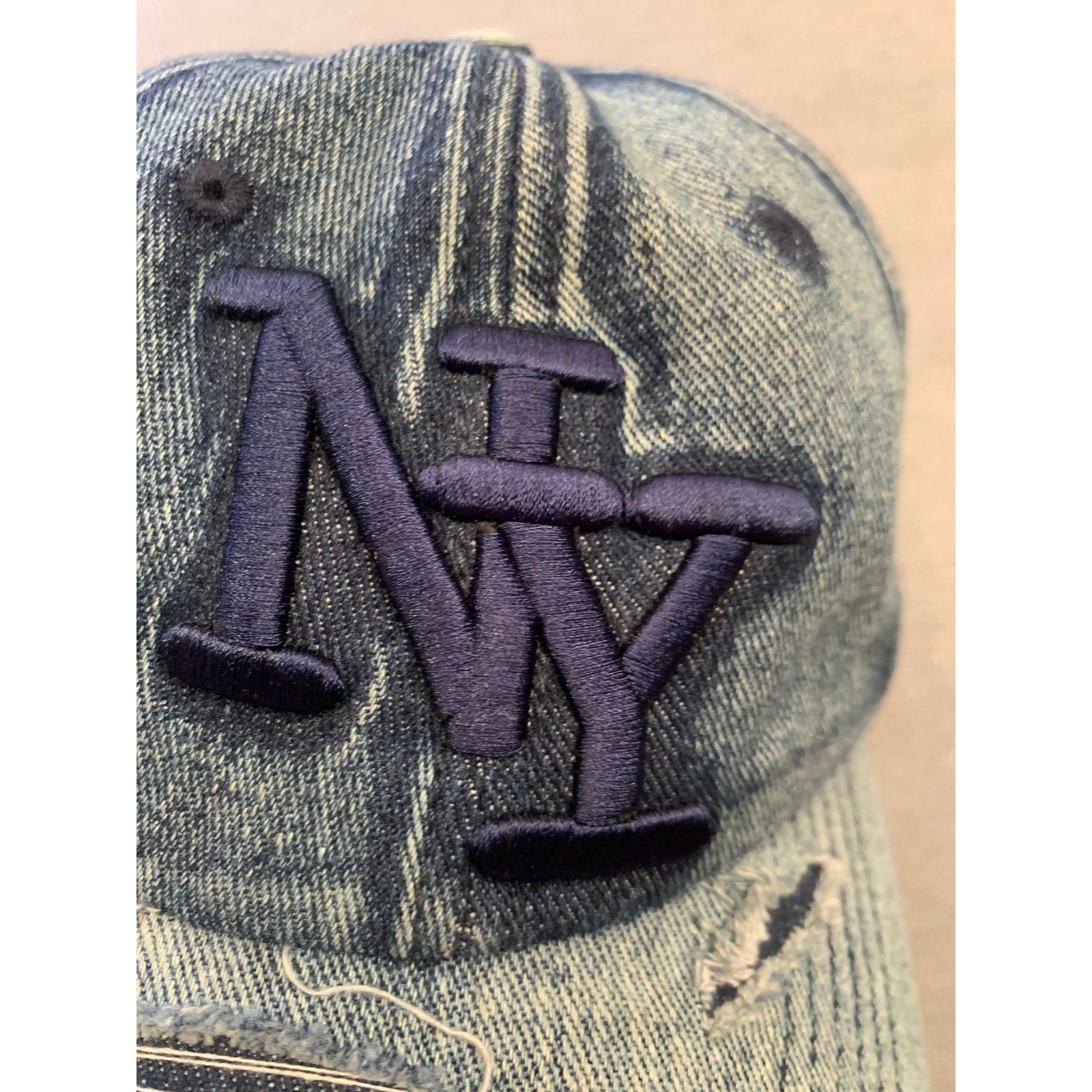 Distressed denim baseball cap with embroidered NY logo in navy blue. Features a worn vintage look with frayed edges and ripped details on the brim. Adjustable back strap for a comfortable fit. Great for casual streetwear styling.