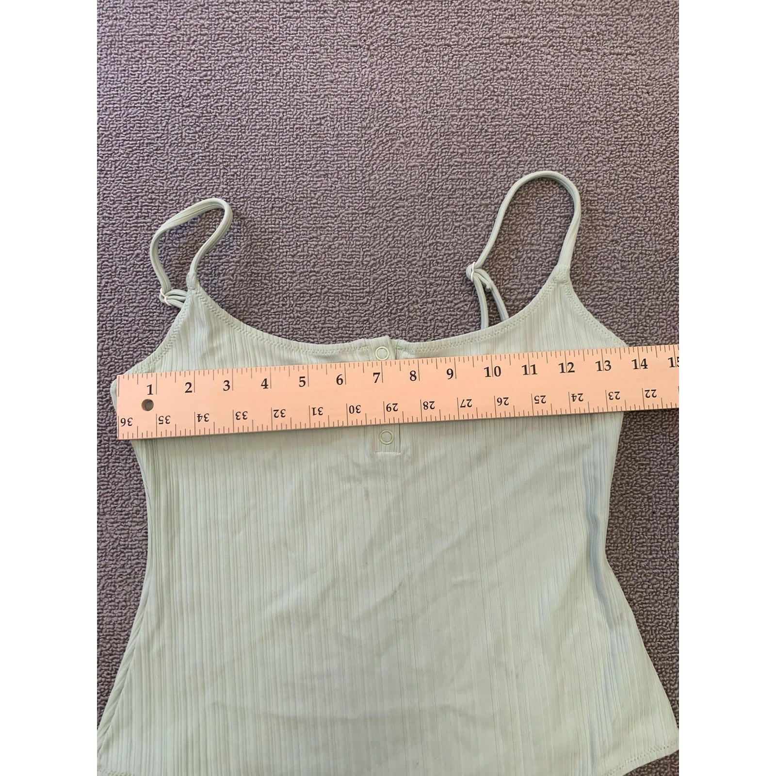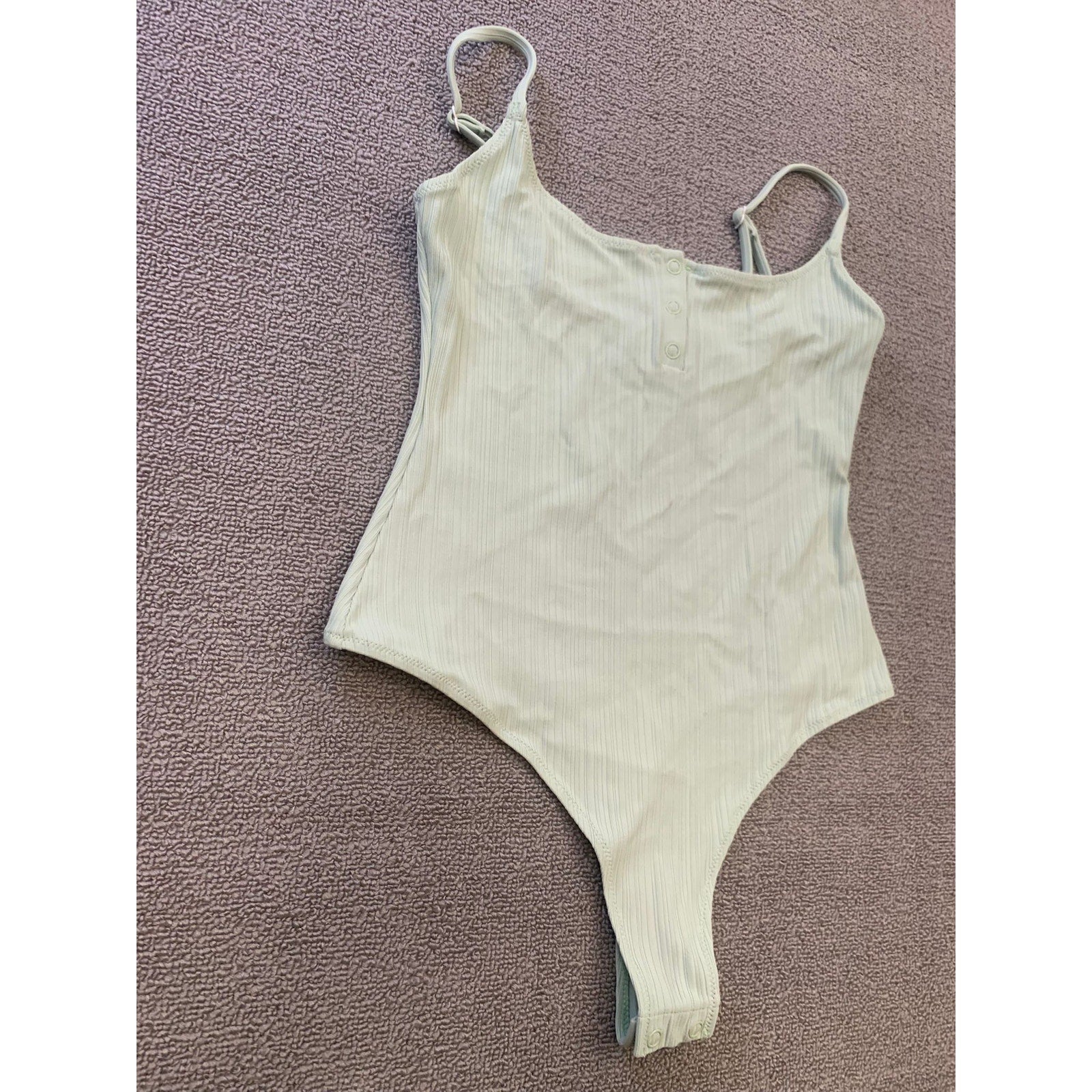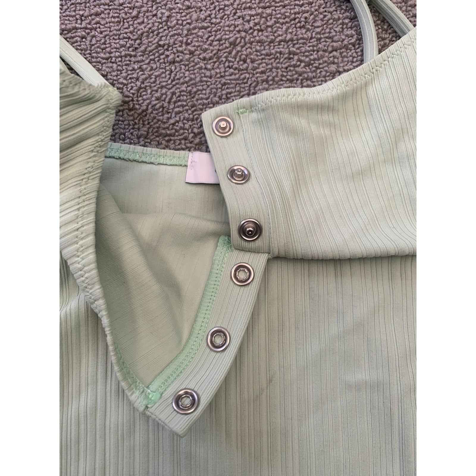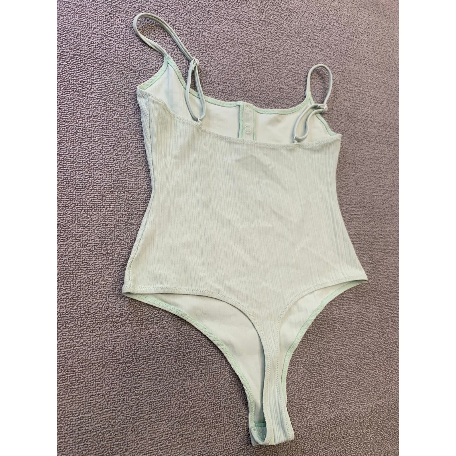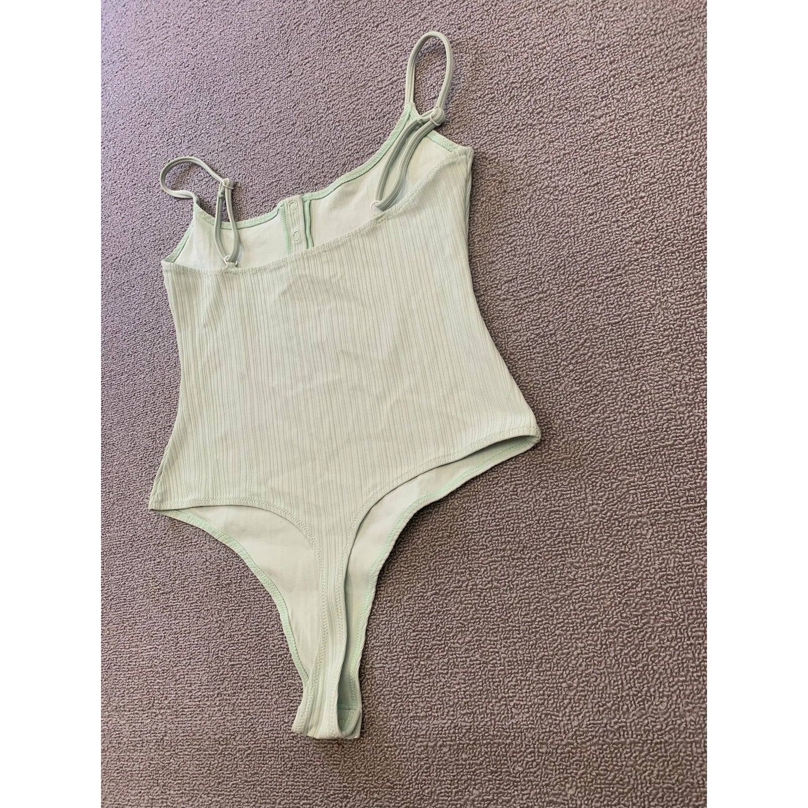 Minimalist Onia ribbed bodysuit in a soft pastel green. Features spaghetti straps, scoop neckline, henley button detail at chest, and thong back with snap closure. Perfect layering piece or standalone top for a sleek look.