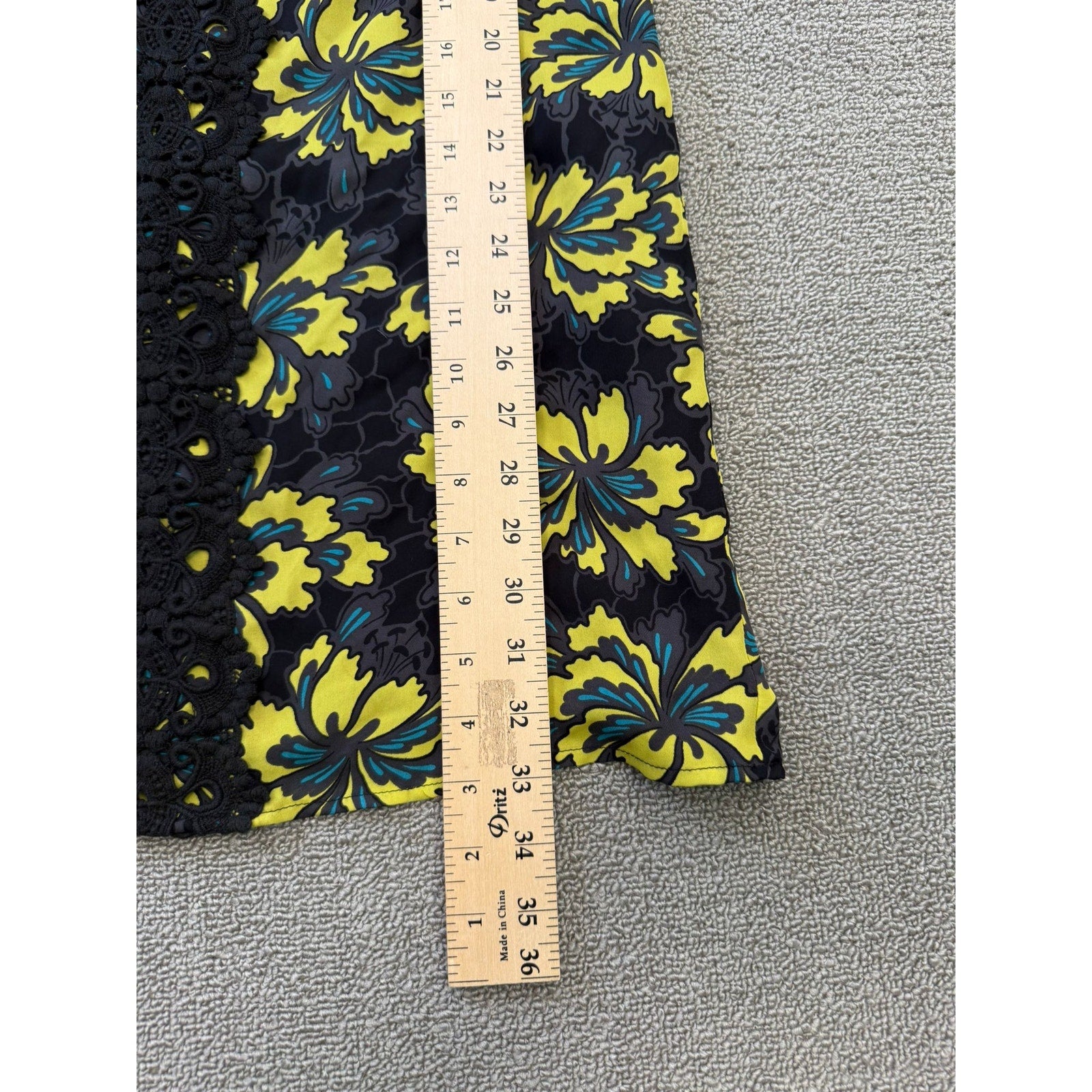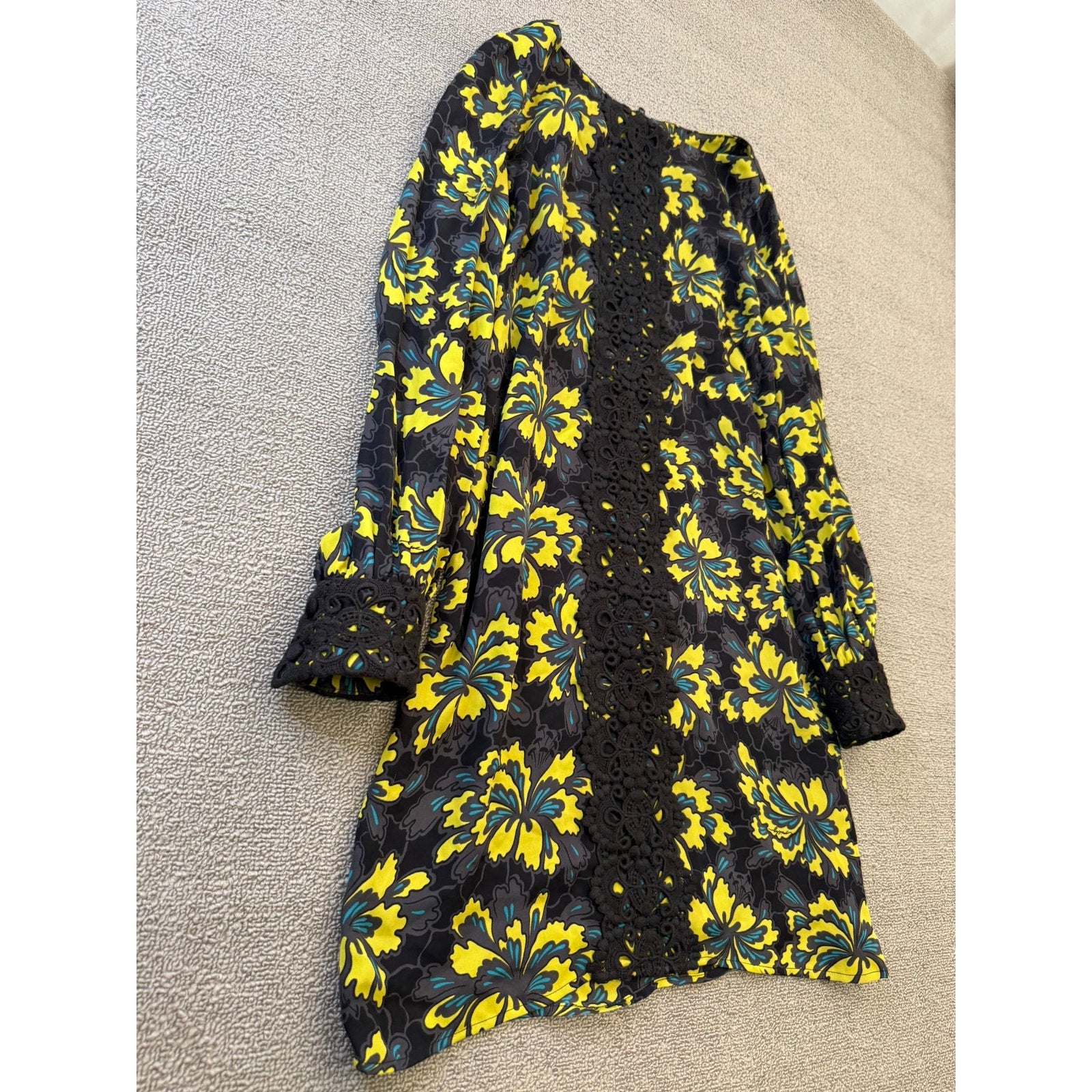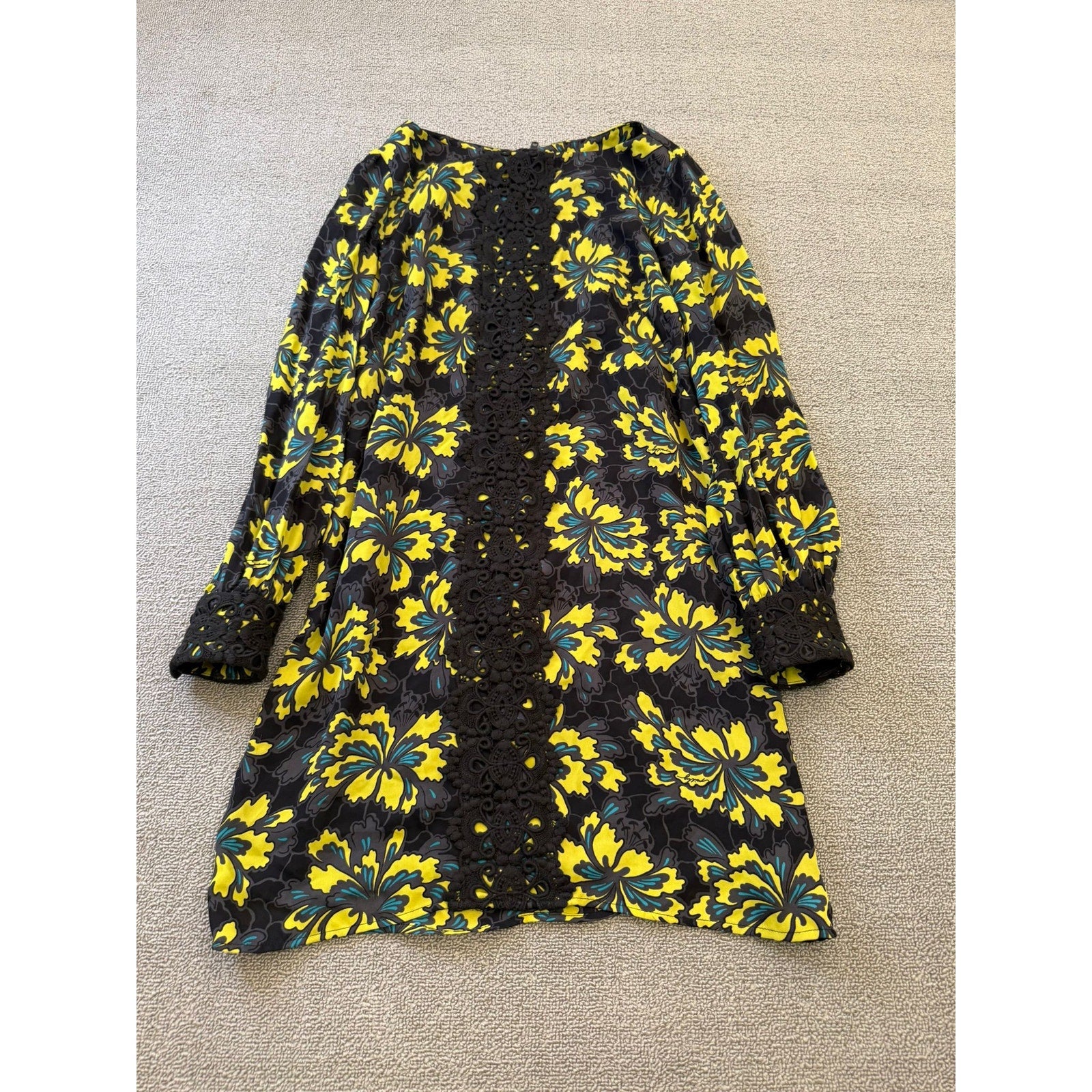 A bold and sophisticated dress from Milly of New York, featuring a vibrant yellow floral print with teal accents on a sleek black background. The standout element is a central crochet lace panel running front-to-back, paired with long sleeves and a relaxed shift silhouette.
