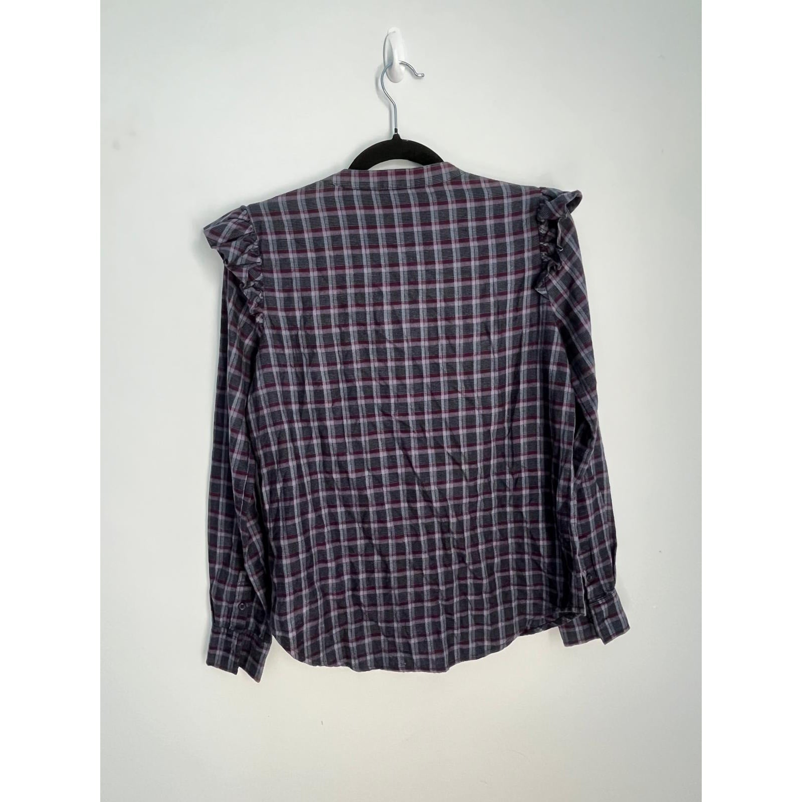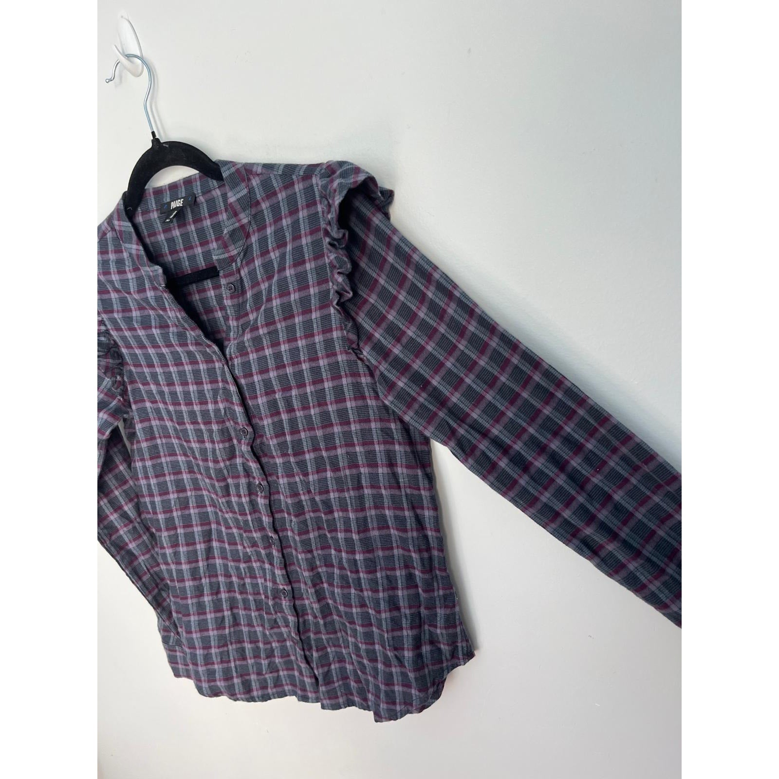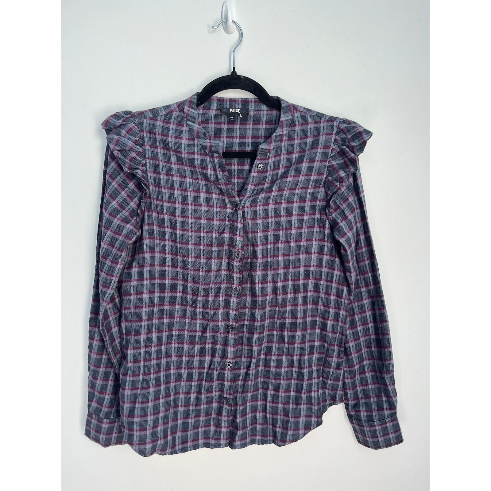PAIGE Ruffle Shoulder Plaid Button Shirt Women XS Purple Gray Long Sleeve Top