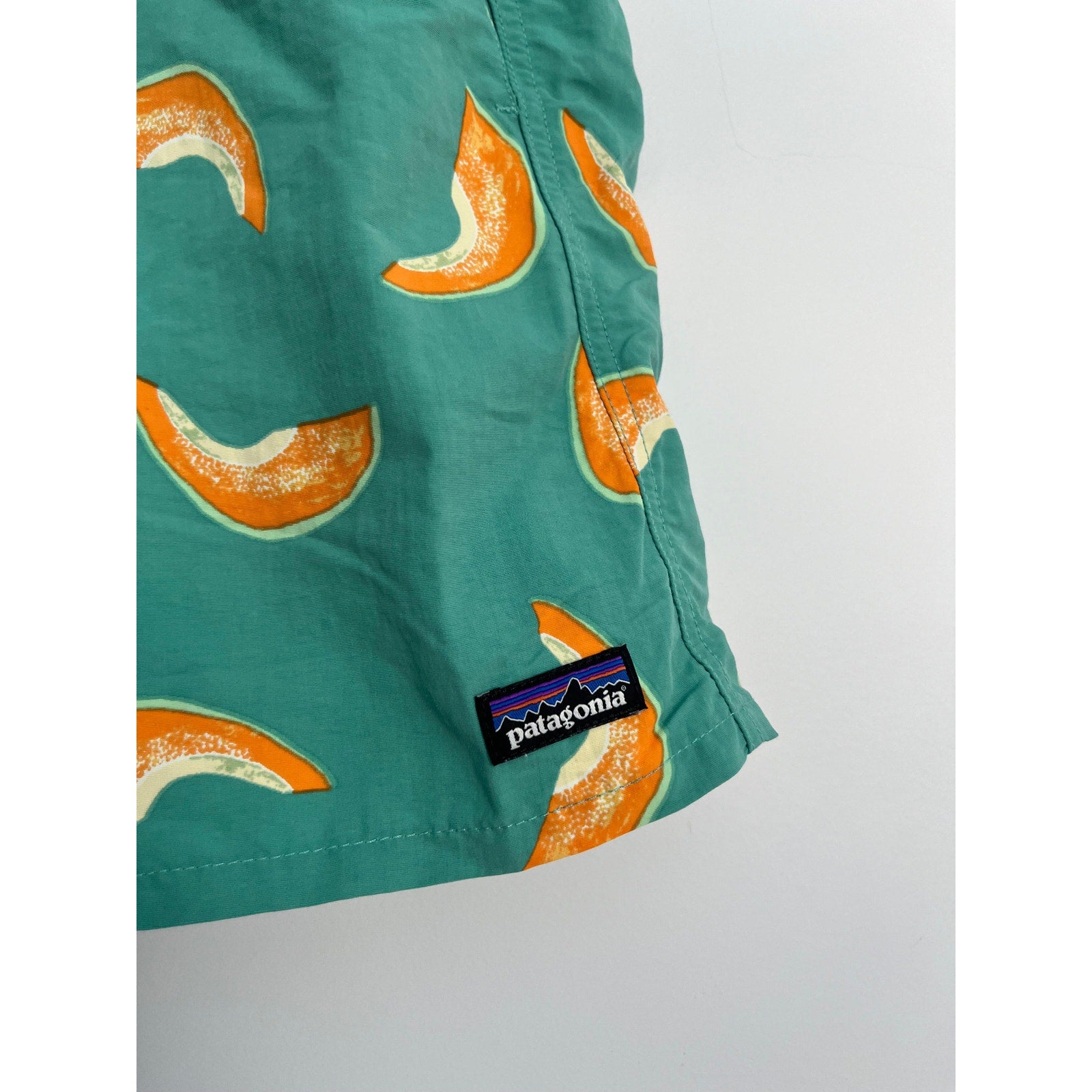 Men’s Patagonia swim trunks with bold orange fruit print on a green base. Features elastic waistband with internal drawcord and side pockets. Lightweight and breathable — perfect for poolside or beach days.