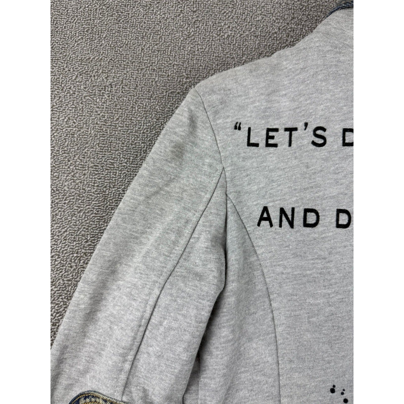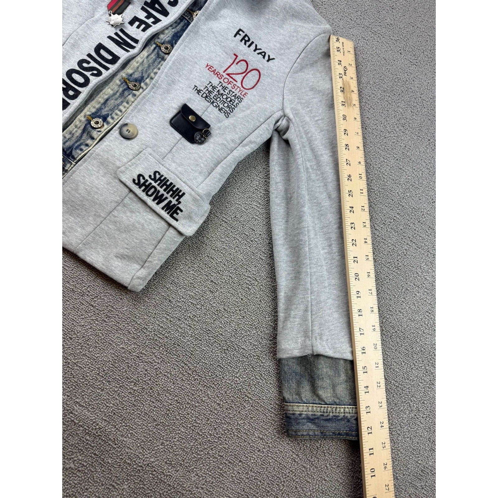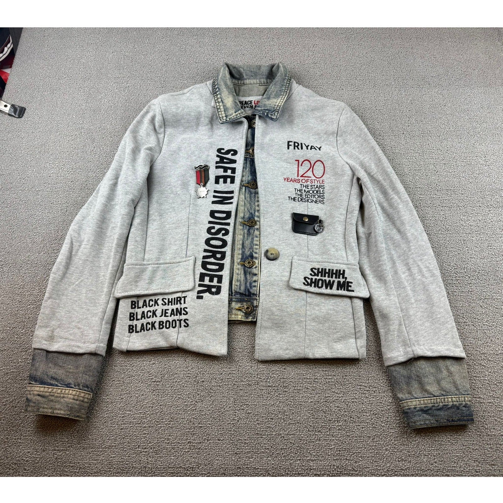 Peace Love & Seven Seventy women’s jacket featuring unique patchwork design with denim accents and bold graphic text including “Safe in Disorder” and “Shhhh, Show Me.” Stylish mix of sweatshirt fabric and denim details for a statement look.