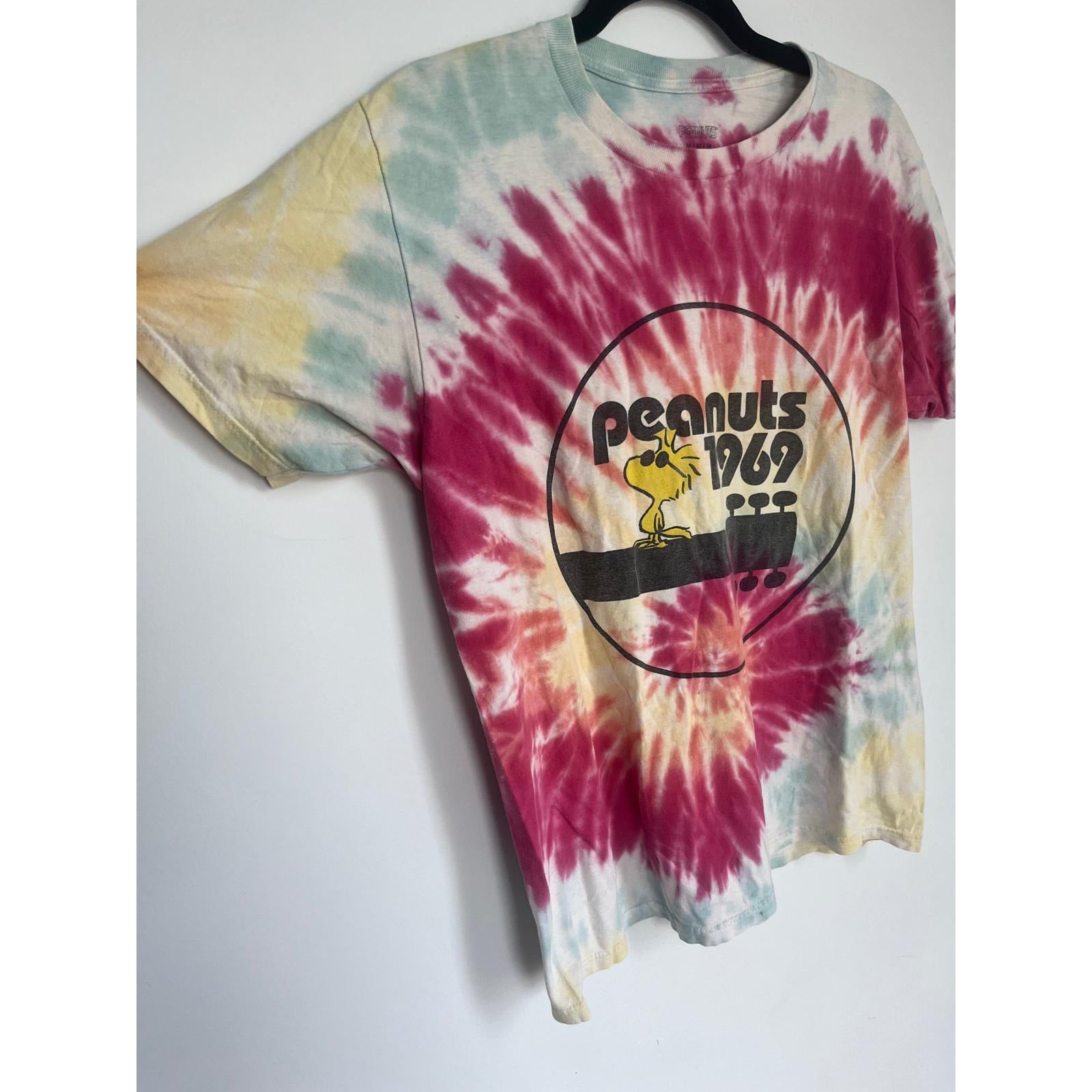 Vintage-style tie-dye t-shirt with Woodstock from Peanuts sitting on a guitar headstock with “Peanuts 1969” graphic. Features a spiral rainbow pattern and soft cotton fabric.