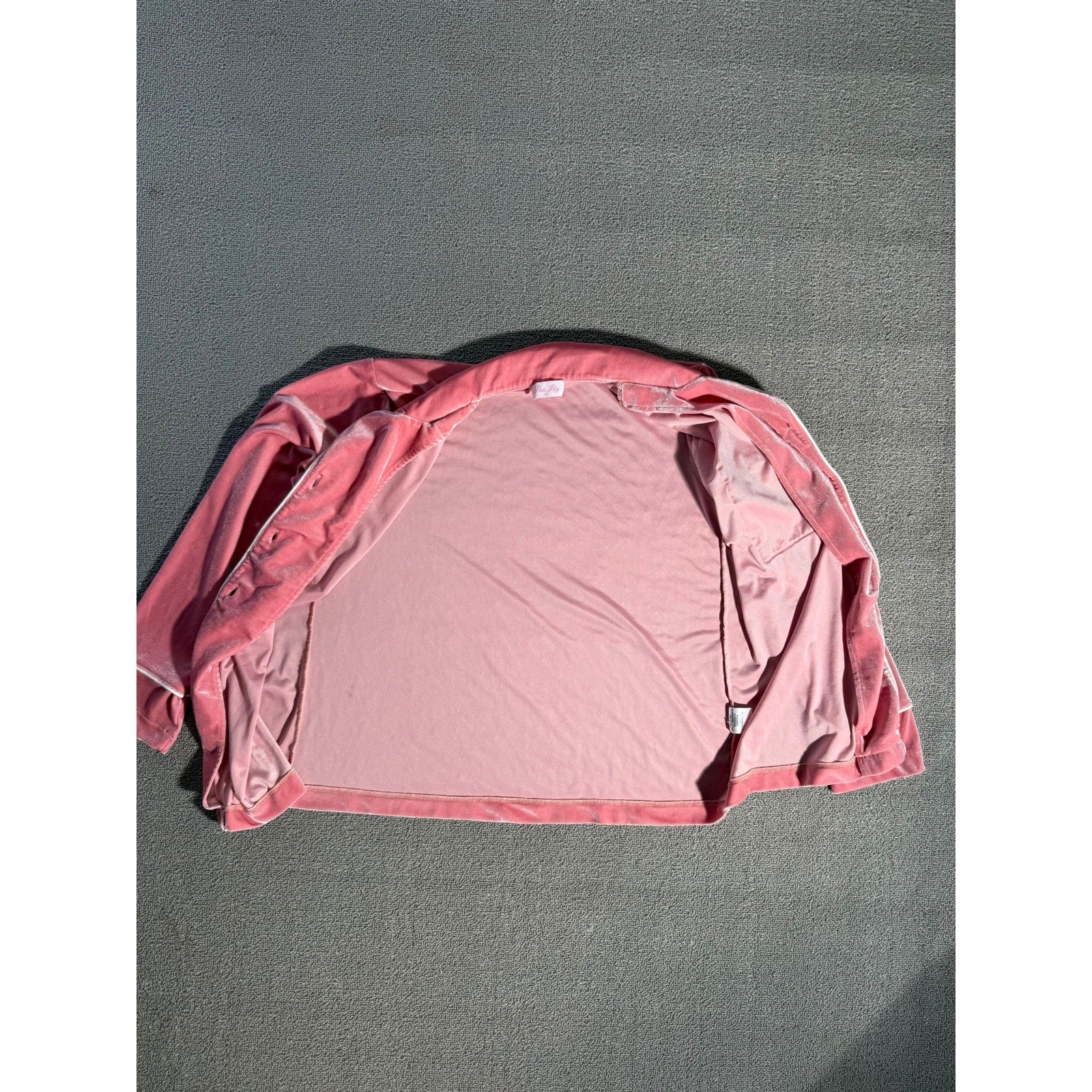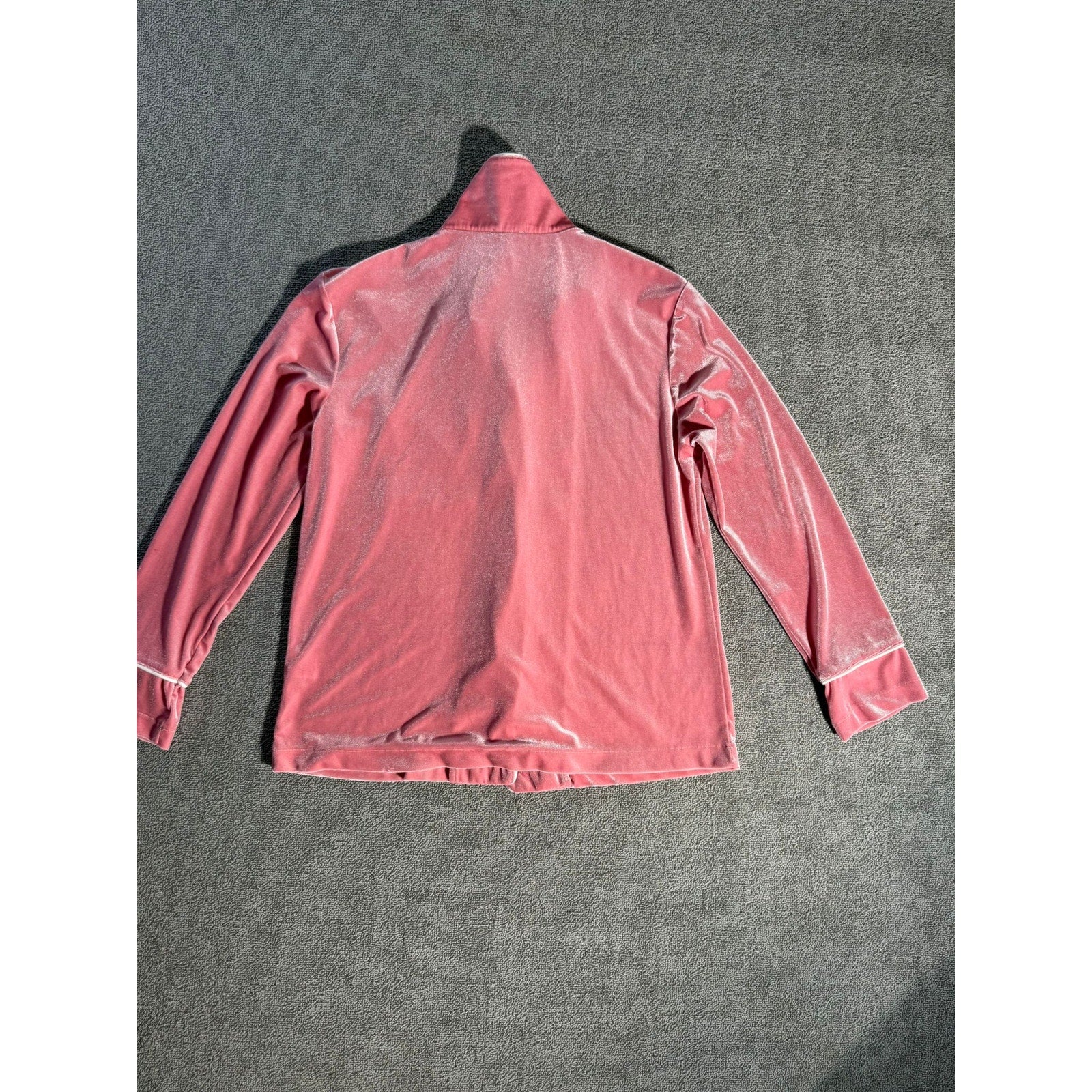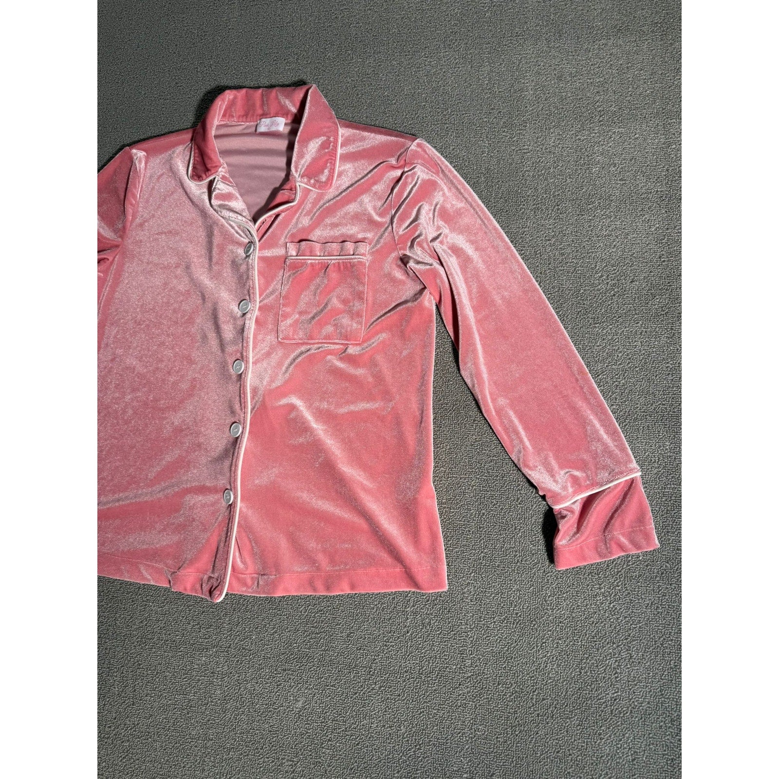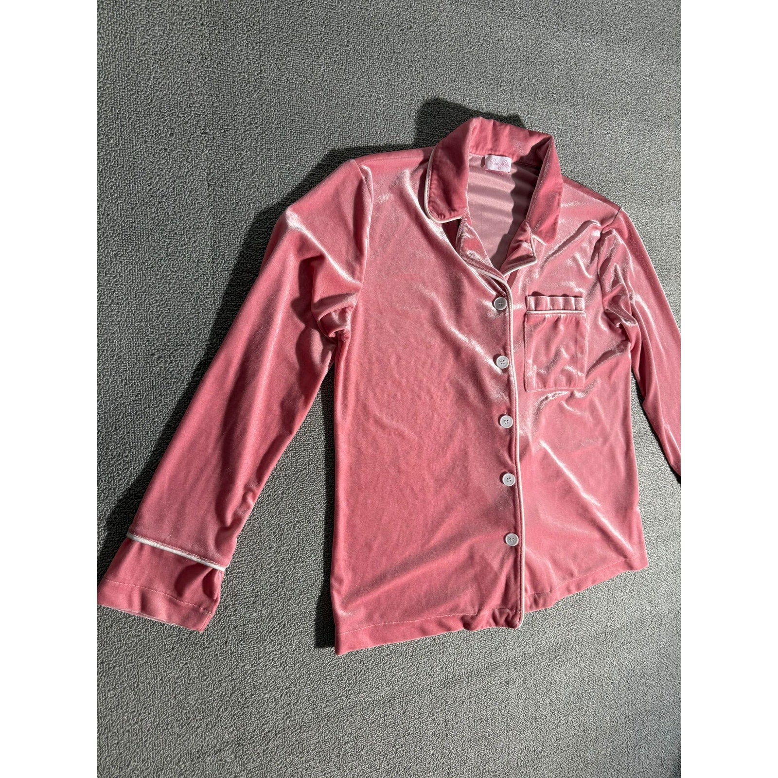 Soft pink velour (crushed velvet) two‑piece pajama set with contrast piping details; classic button‑front top with chest pocket and straight leg elastic‑waist pants. Luxe yet comfy—great for cozy lounging or sleepwear.