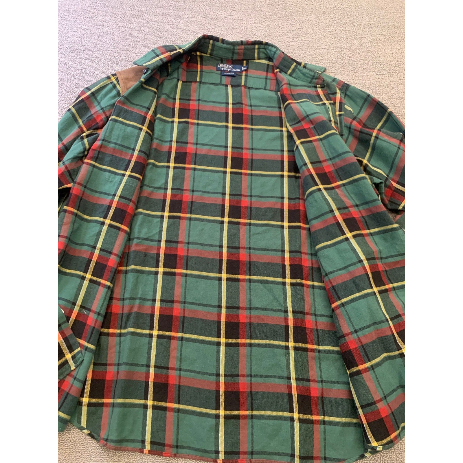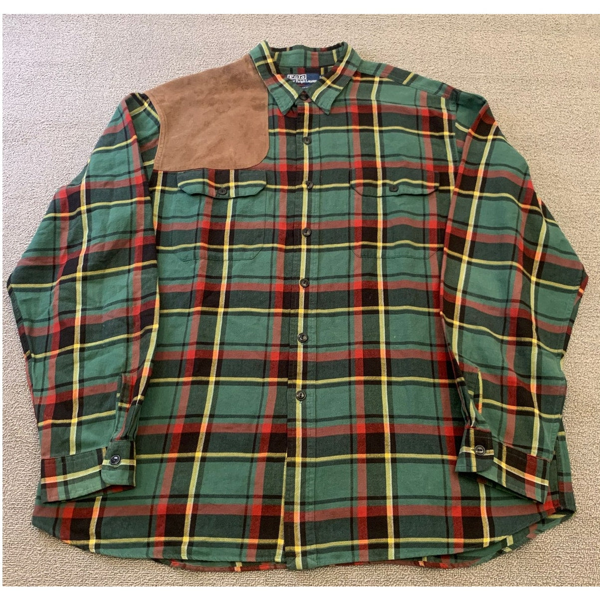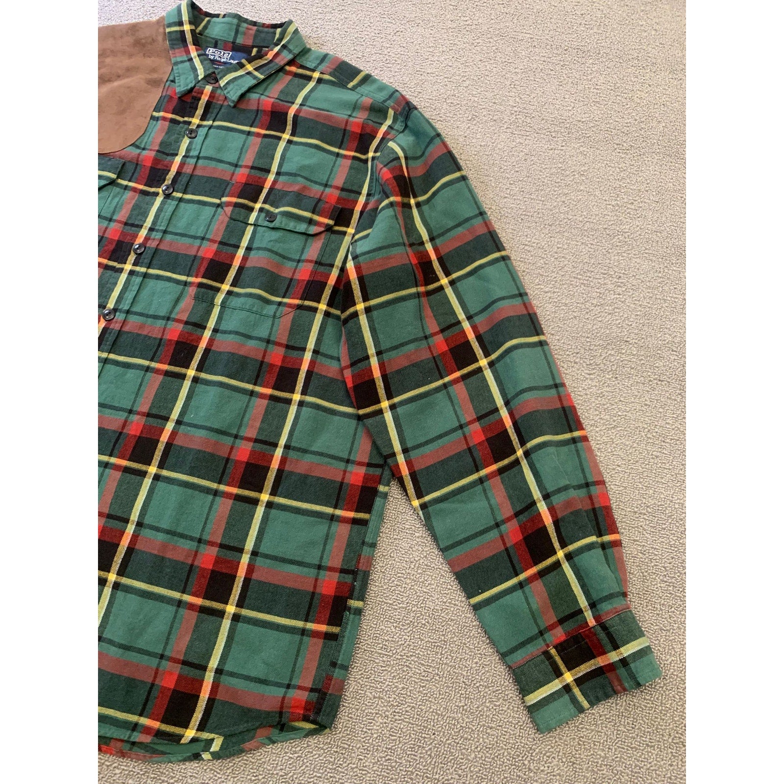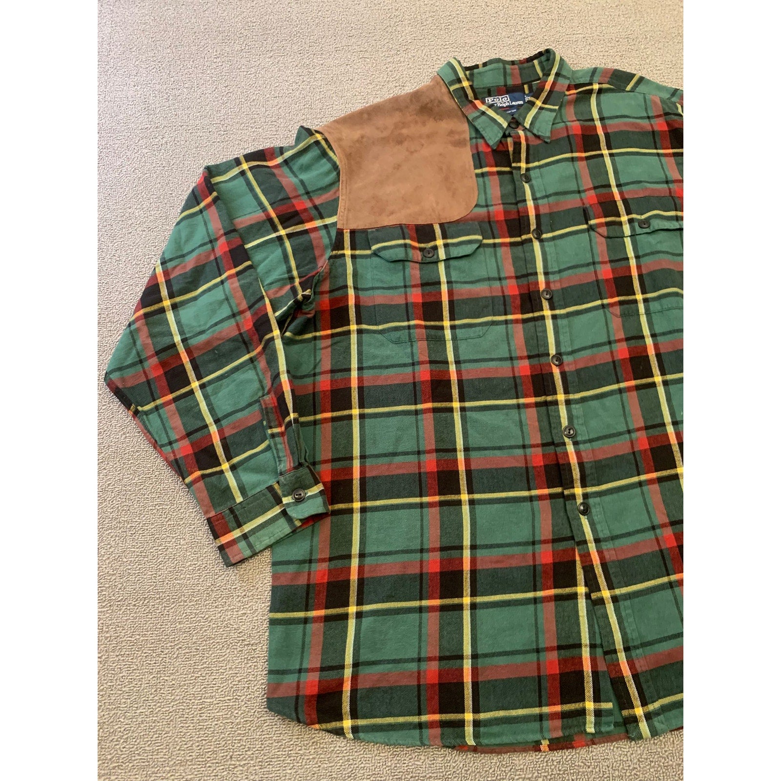 Polo by Ralph Lauren men’s button-down plaid hunting shirt in green red and yellow tartan. Features classic flannel styling with front flap chest pockets and a brown suede shooting shoulder patch.