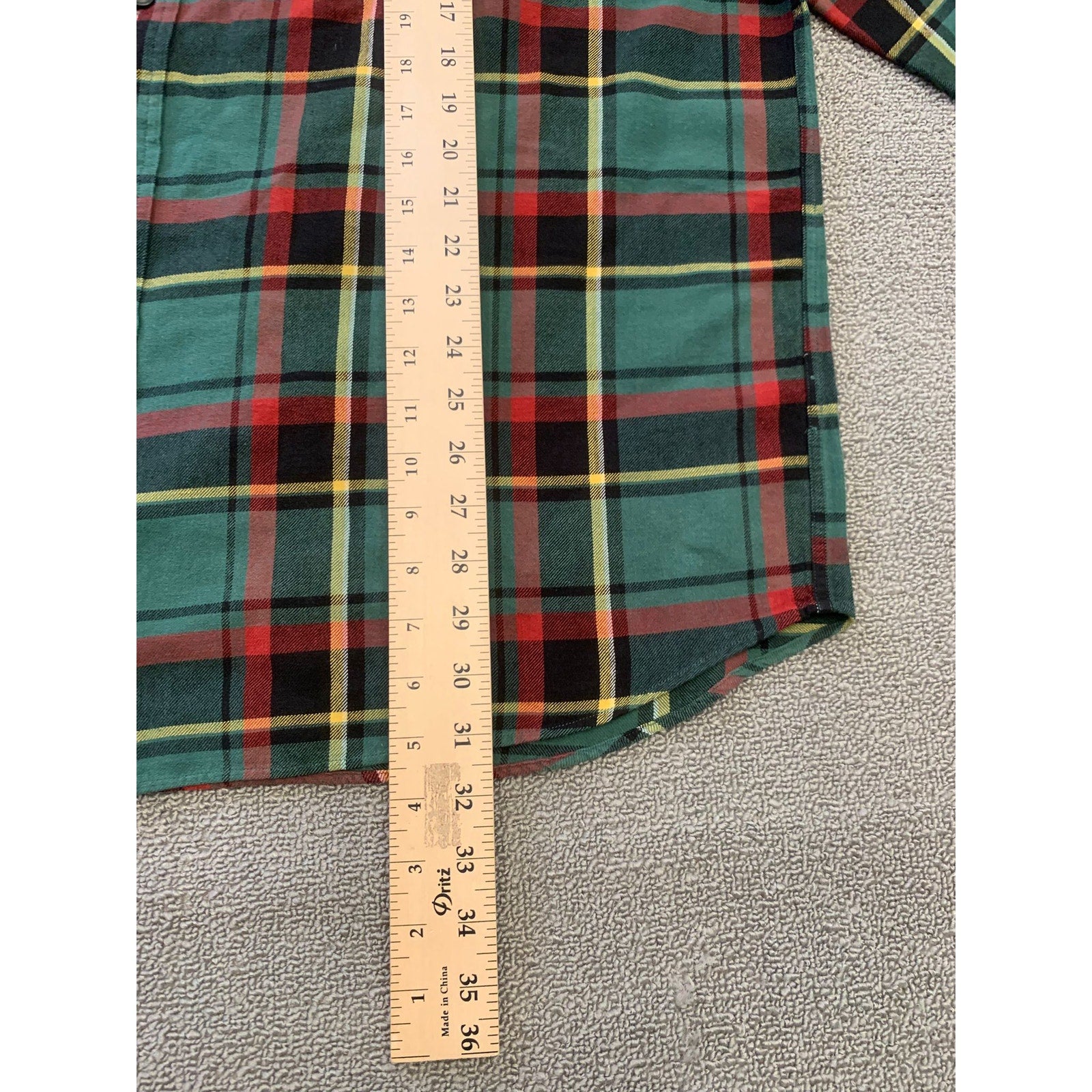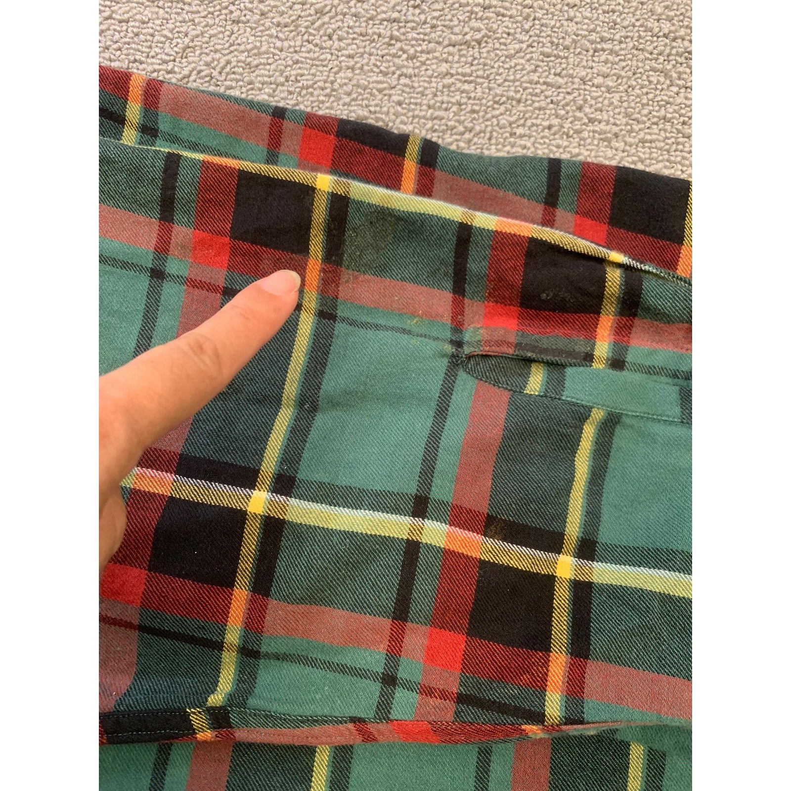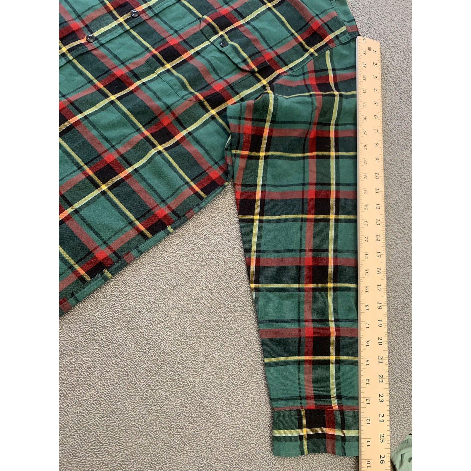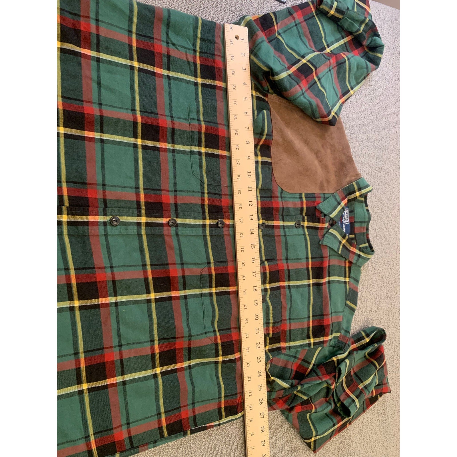 Polo by Ralph Lauren men’s button-down plaid hunting shirt in green red and yellow tartan. Features classic flannel styling with front flap chest pockets and a brown suede shooting shoulder patch.