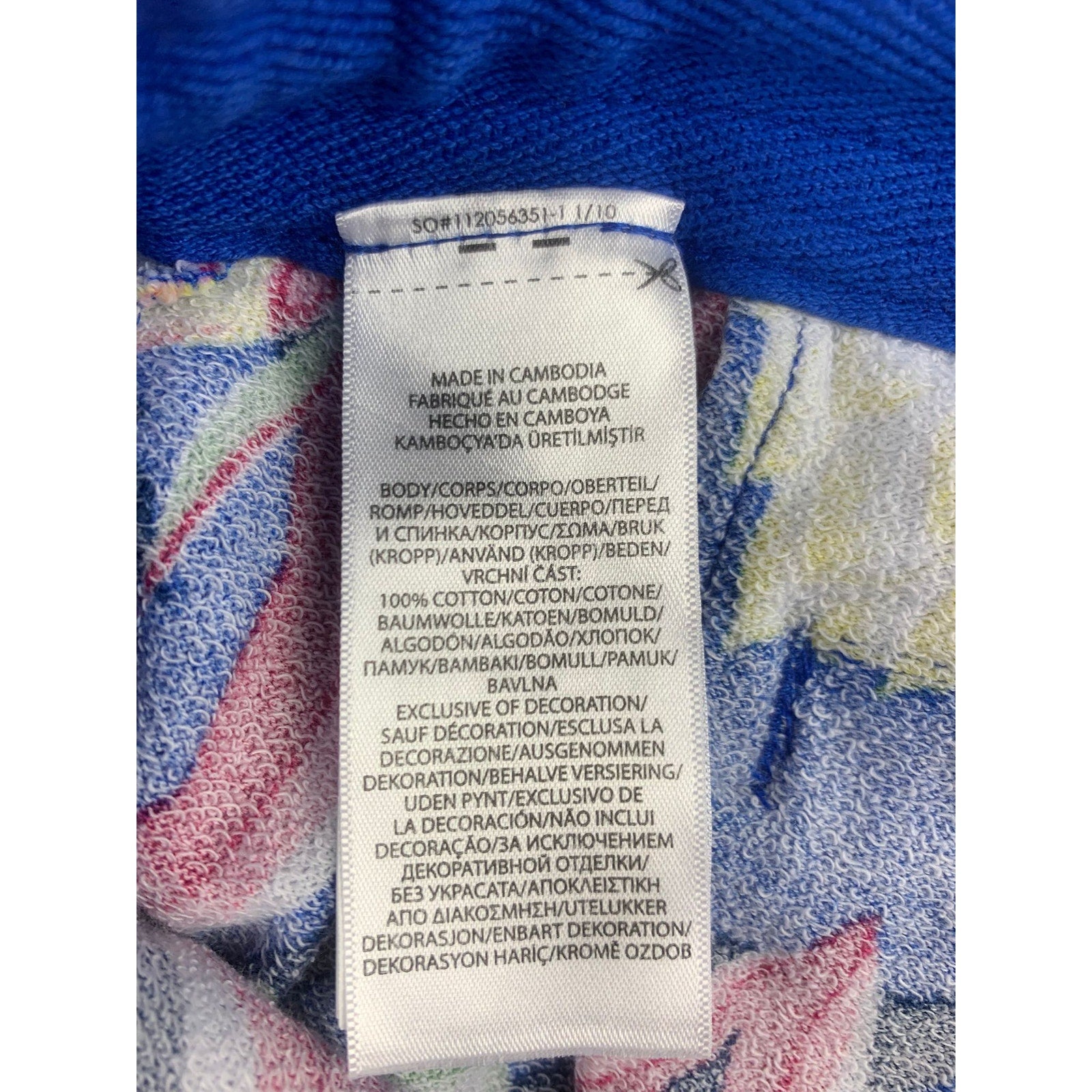 Bold tropical floral terry shorts by Polo Ralph Lauren in vivid blue with red and yellow accents. Elastic drawstring waist, side pockets, soft loop-back cotton terry, Polo pony at hem.