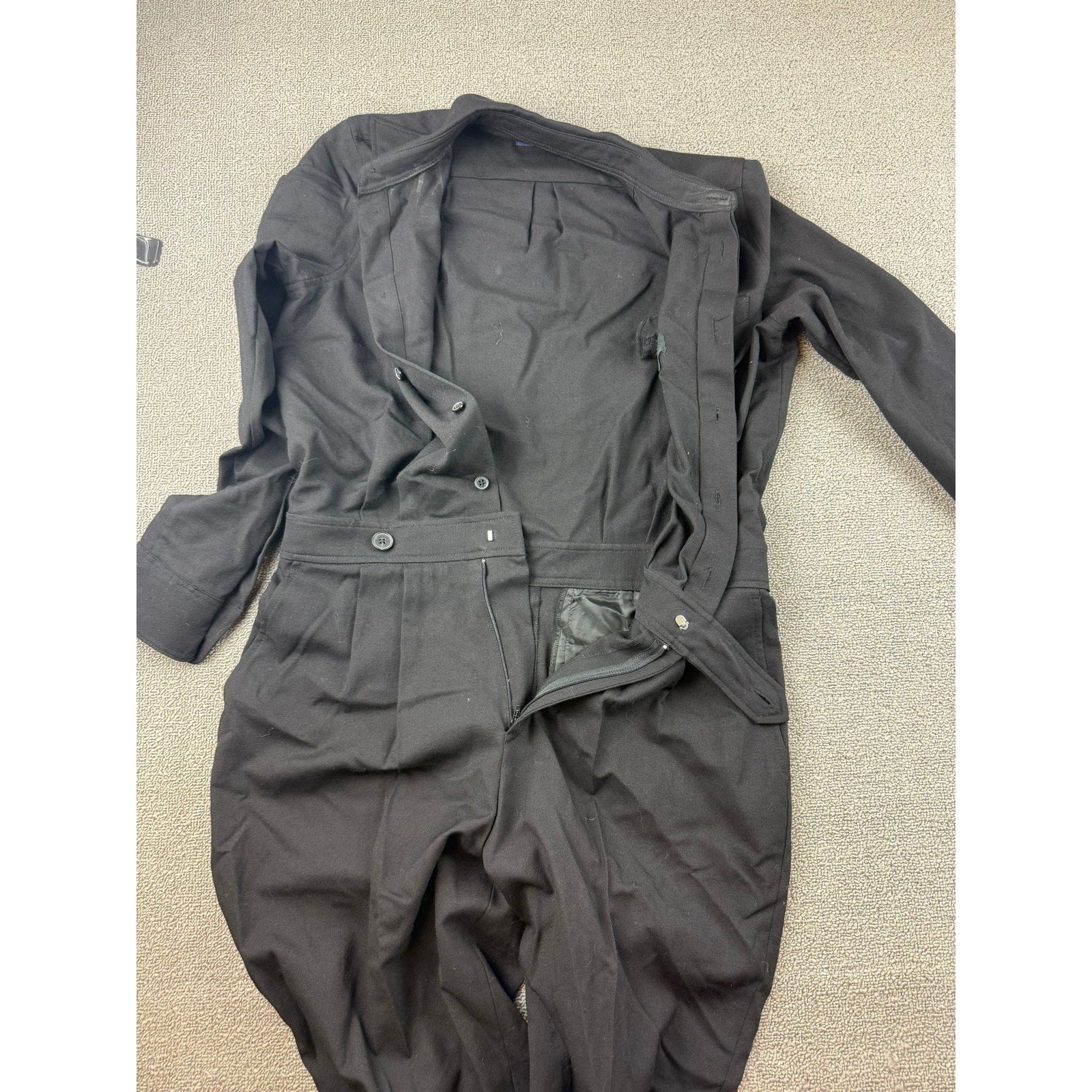 Polo Ralph Lauren women’s black long sleeve jumpsuit. Features button front closure, pointed collar, tailored waist with button accents, front pleats, button cuffs and ankles. A sleek and versatile piece, perfect for casual wear, layering, or a chic statement look.