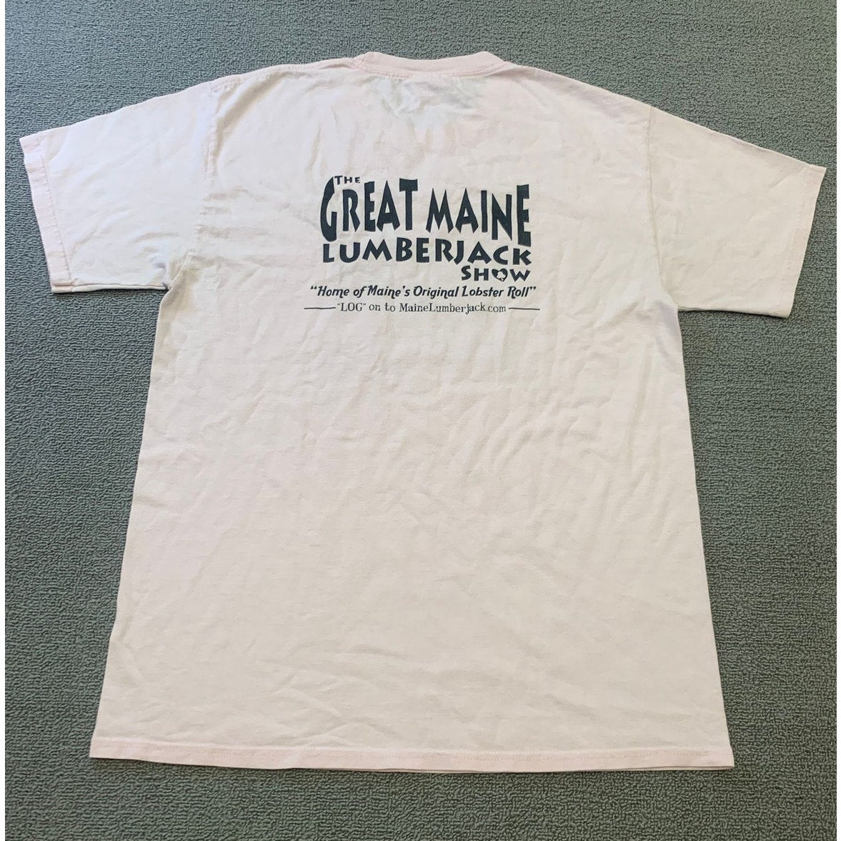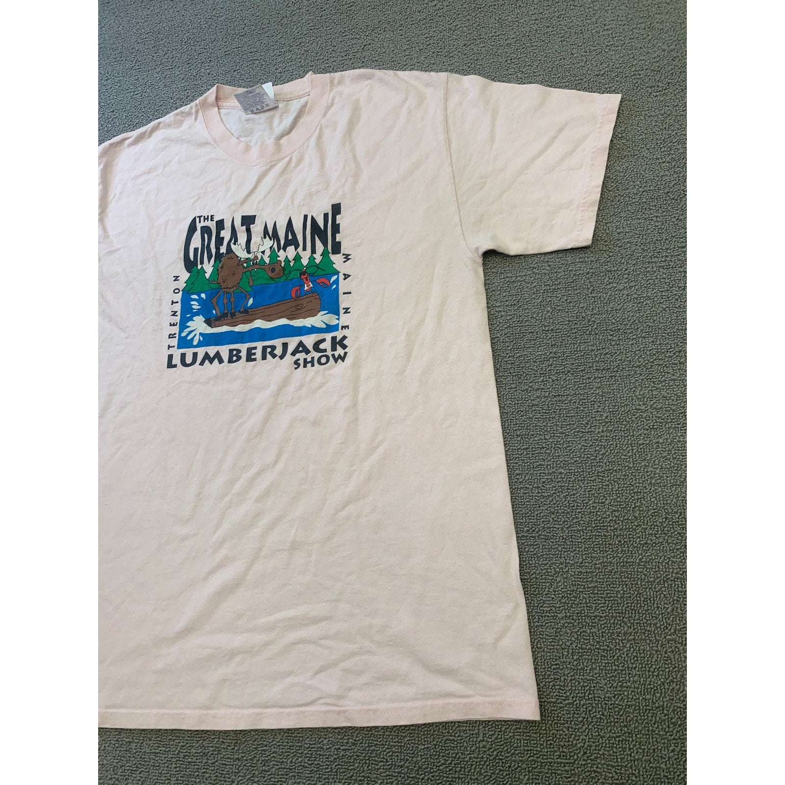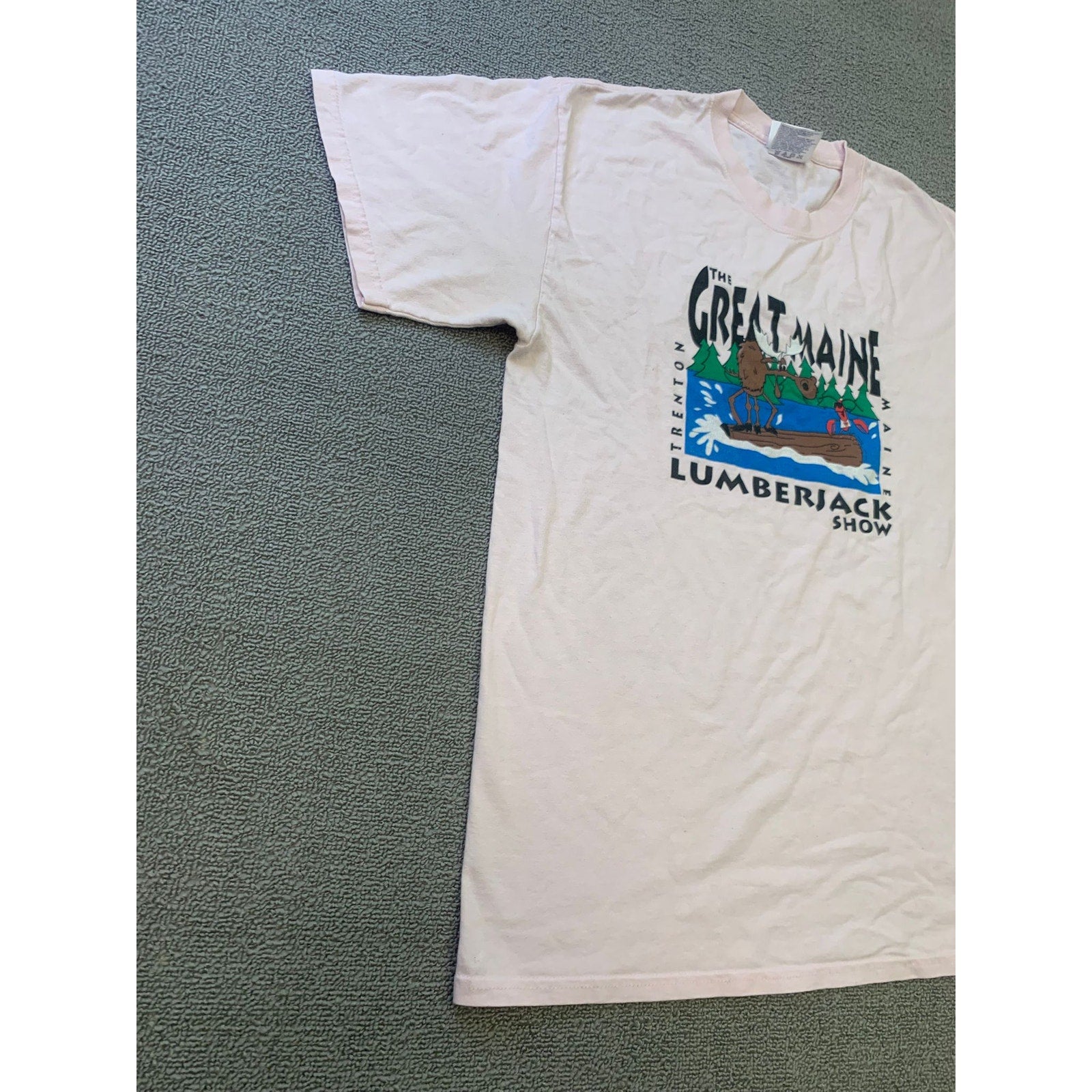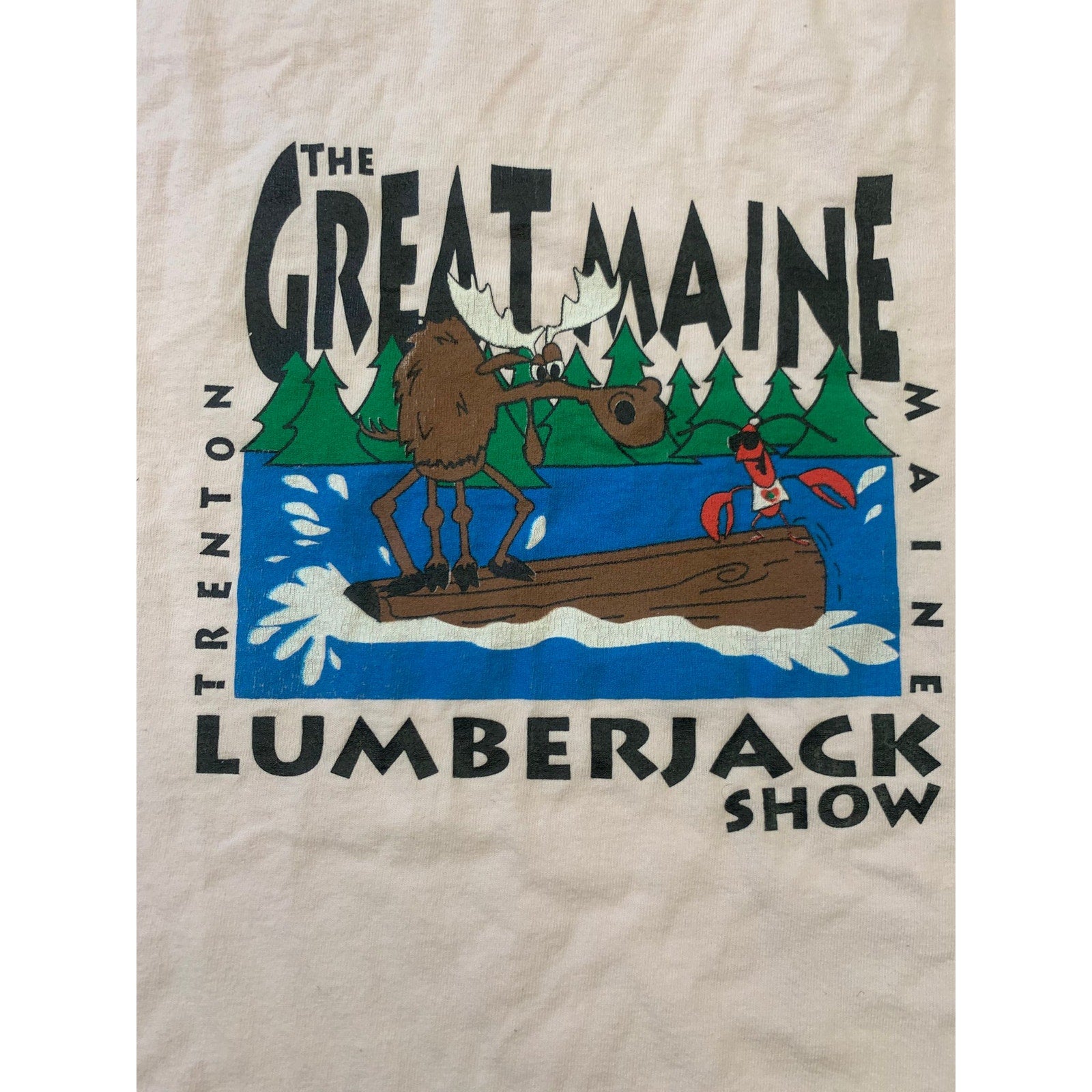 Fun and collectible, this vintage “Great Maine Lumberjack Show” T-shirt from Trenton, Maine features a colorful lumberjack and log rolling graphic on soft pink cotton. A unique souvenir tee that captures the spirit of a classic Maine attraction.