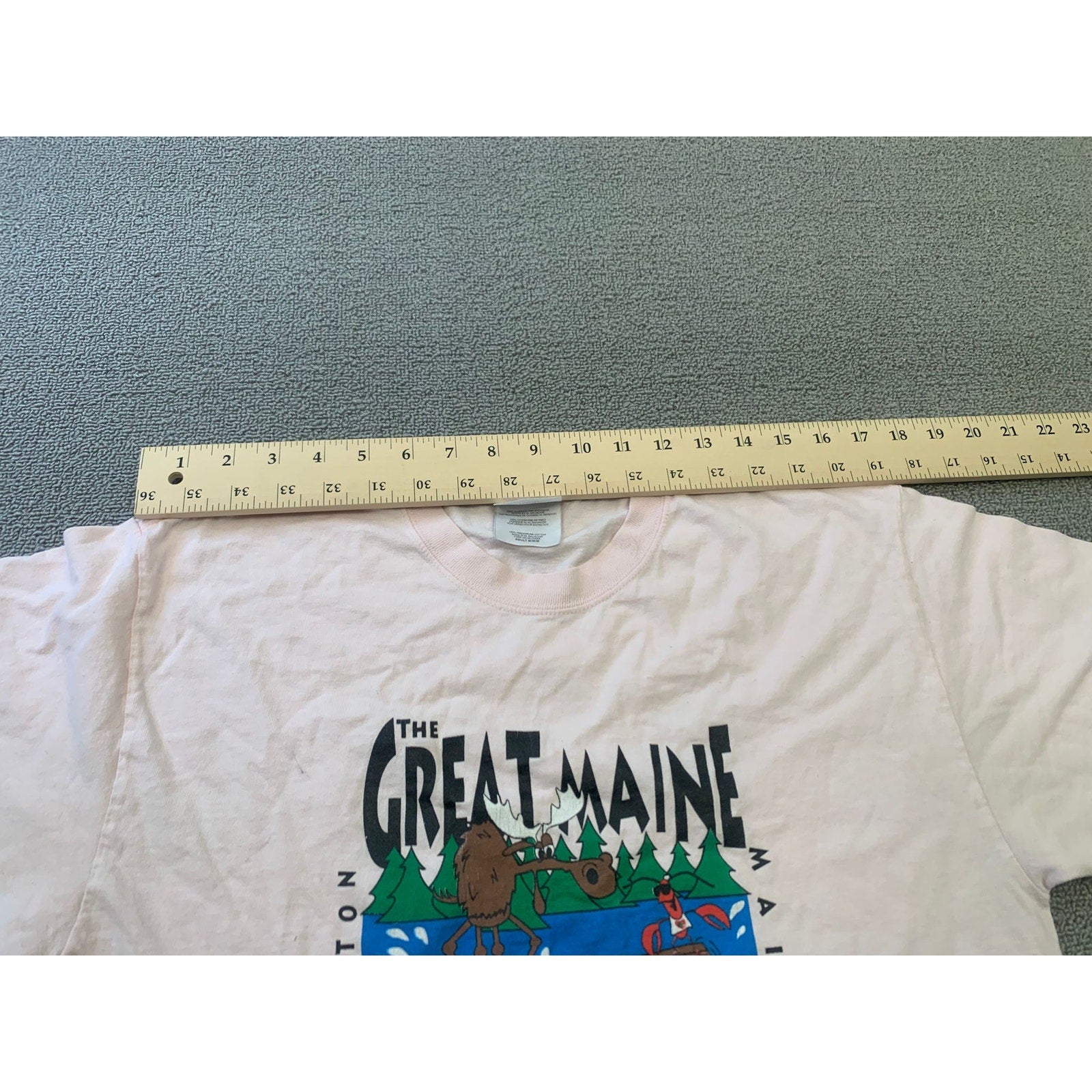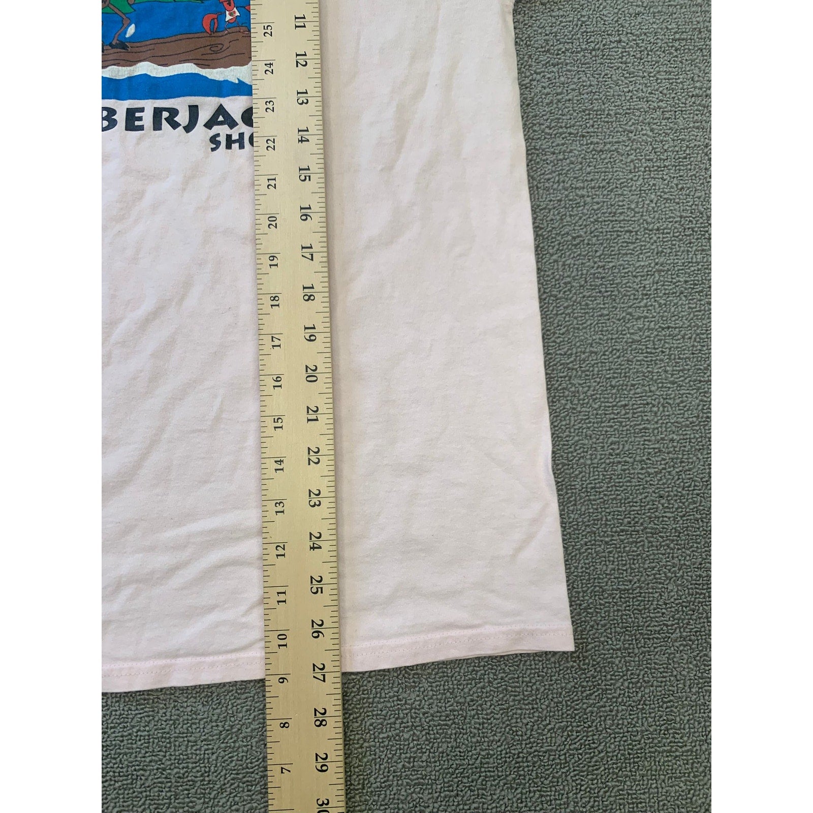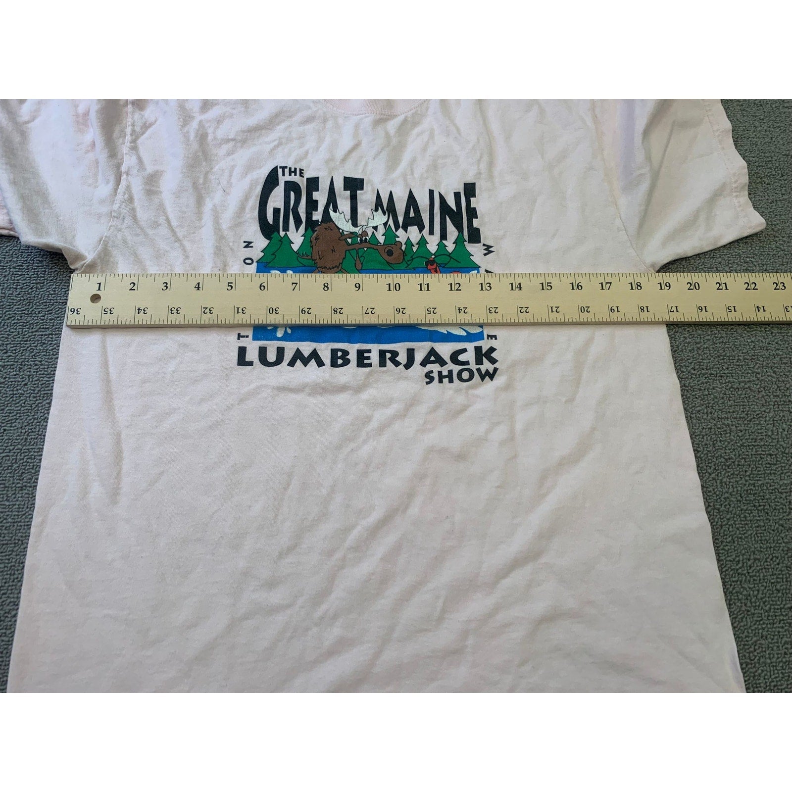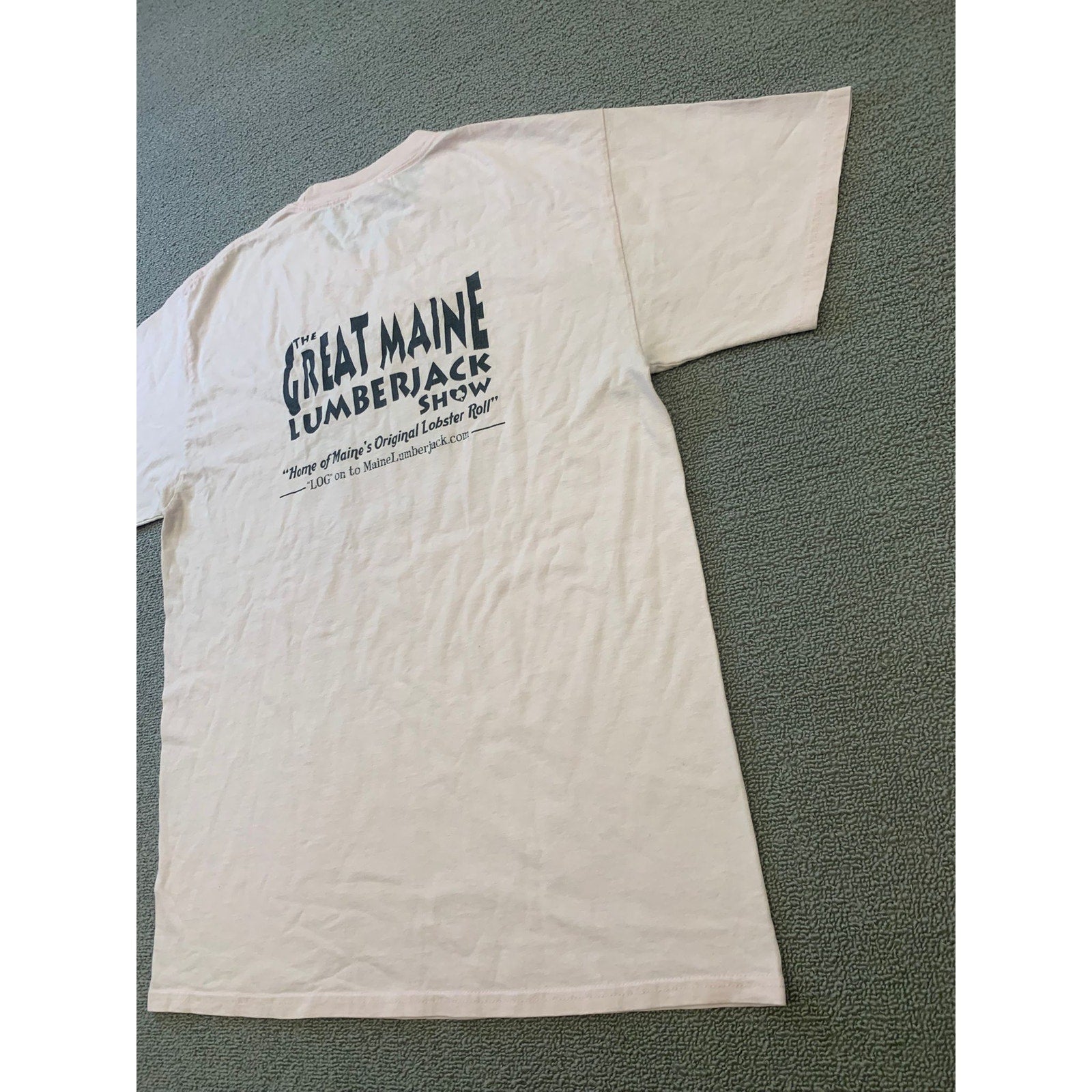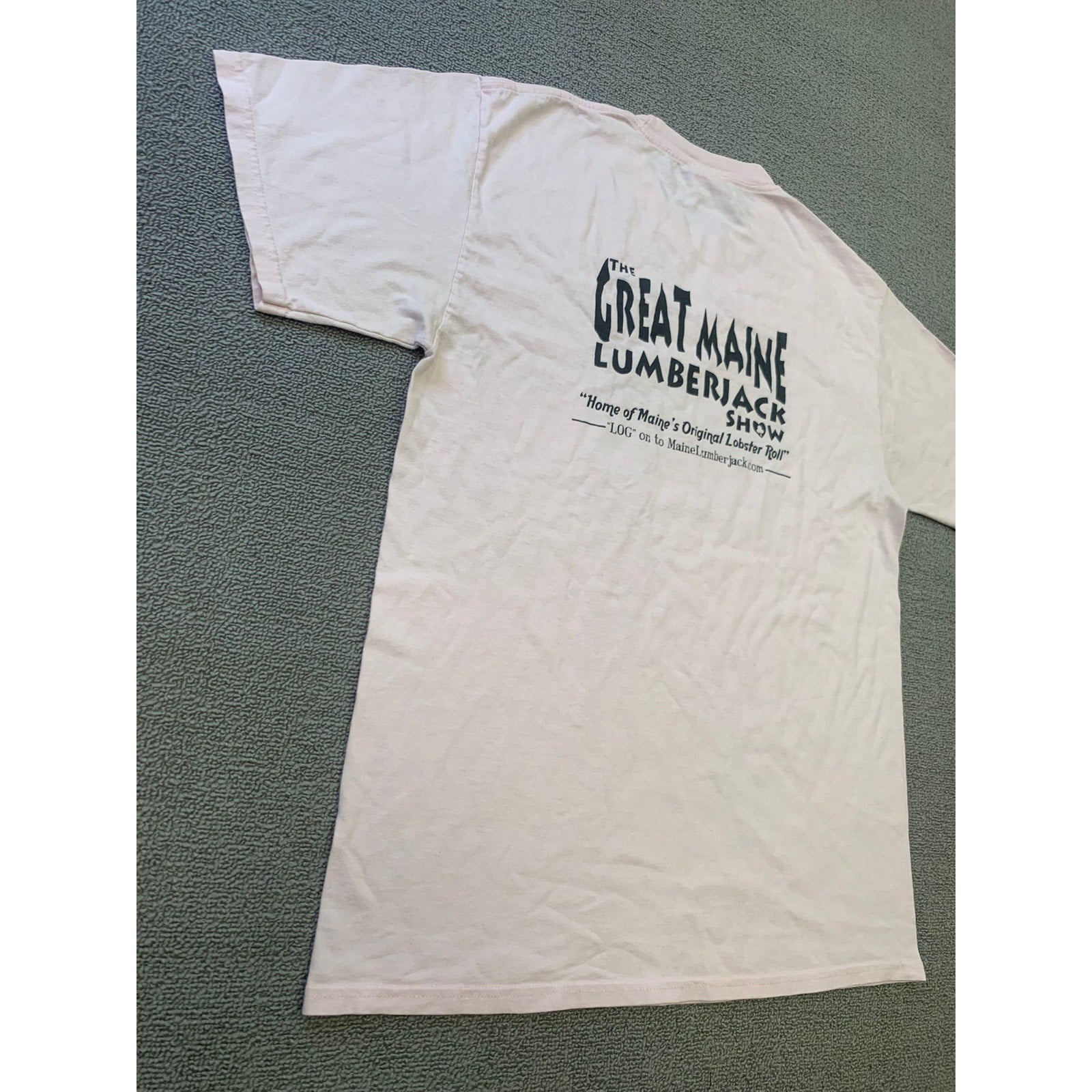 Fun and collectible, this vintage “Great Maine Lumberjack Show” T-shirt from Trenton, Maine features a colorful lumberjack and log rolling graphic on soft pink cotton. A unique souvenir tee that captures the spirit of a classic Maine attraction.